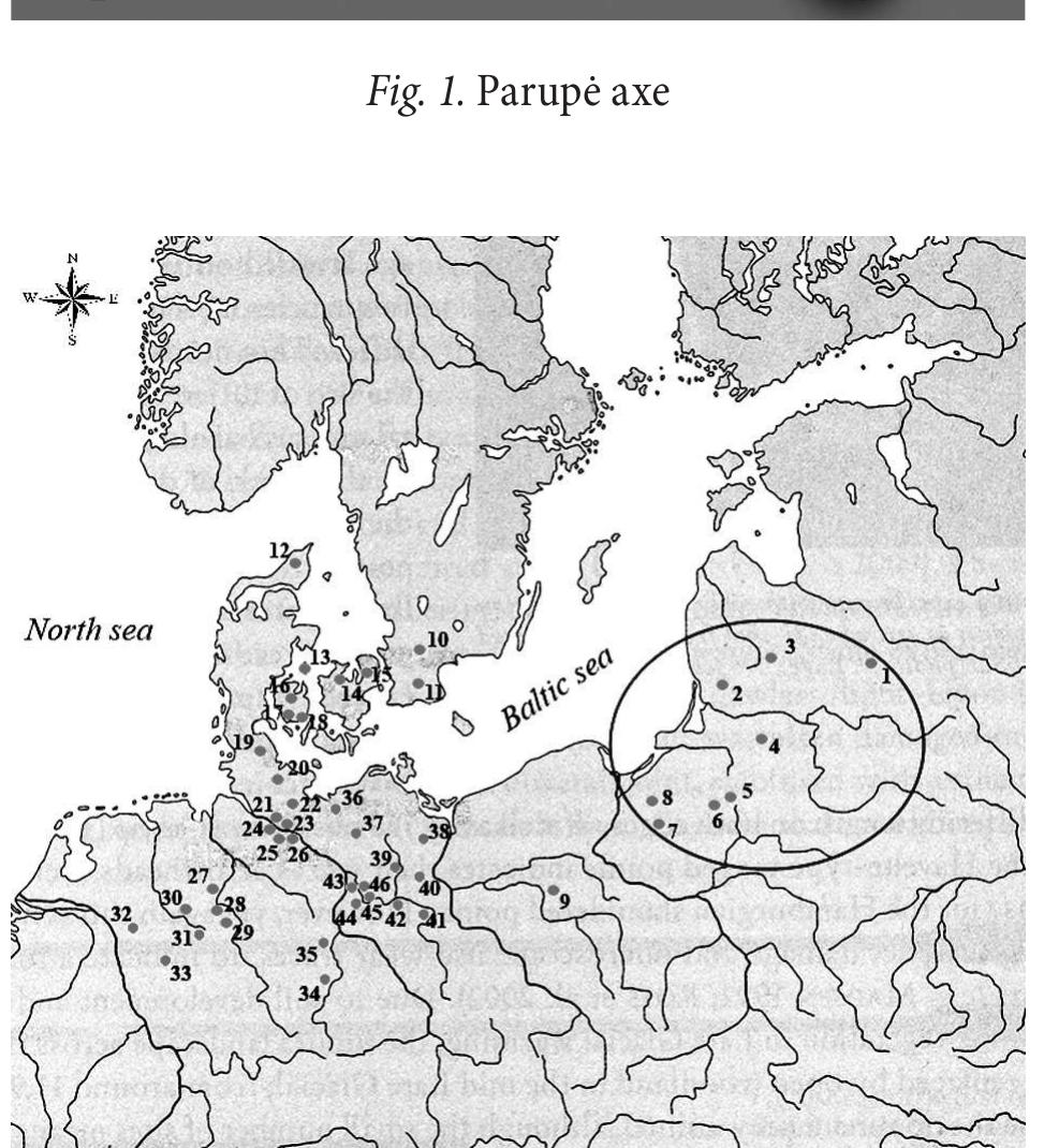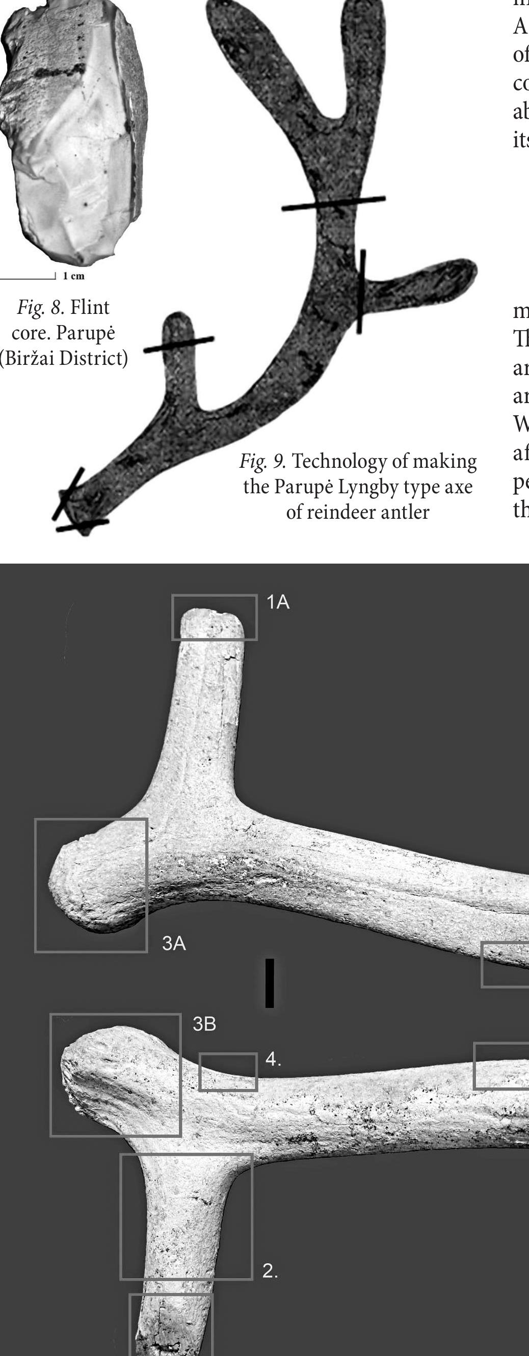 An axe of Lyngby type made of antler of male adult reindeer was recovered in 2014 in the Parupė s... more An axe of Lyngby type made of antler of male adult reindeer was recovered in 2014 in the Parupė settlement of Biržai District, northern Lithuania. Archaeological investigations were carried out at the Lateglacial (Allerød) site near the Mūša–Nemunėlis Basin during which the stratigraphic context of the find was established. Pollen analysis, loss-on-ignition (LOI), magnetic susceptibility, and grain-size measurements were applied in case of accommodating layers. It was determined that reindeer hunters made the Parupė axe in the Late Allerød, which is confirmed by the radiocarbon dating: 11145 to 11045 cal. BC. This is the first find of this kind uncovered in the territory of Lithuania. The artefacts of Lyngby type recovered in Lithuania and in the Baltic area are typologically, technologically, and chronologically identical and coeval with the artefacts discovered in SouthWest Europe. The use-wear analysis of the Lithuanian artefact allowed identifying its function and manufacturing technology. This tool was used for felling trees. Analysis of stable carbon (δ 13 C) and nitrogen (δ 15 N) isotopes of the uncovered antler axe produced values similar to those obtained of the antlers of all reindeer inhabiting the East Baltic area at that time.