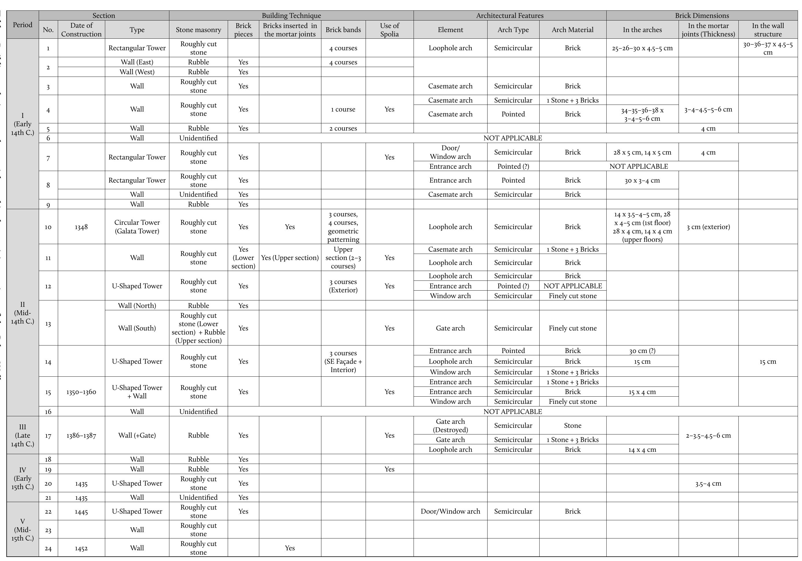 While a number of fortifications have been attributed to the Genoese in Anatolia, the Walls of Ga... more While a number of fortifications have been attributed to the Genoese in Anatolia, the Walls of Galata are the only fortifications built entirely by them. Although the term "Genoese castle" is commonly used for most of these fortresses, even those without any trace of Genoese history, what is meant by "Genoese" architecture has not yet been fully identified or defined. This article investigates medieval building techniques and masonry traditions that the Genoese might have employed in their architectural practice. For this purpose, a comprehensive inventory of the surviving parts of the Walls of Galata to date has been created, and the building techniques of the surviving sections are investigated in detail. These techniques are analyzed through a comparison of other buildings in Galata and Genoa built by the Genoese and the Palaiologan buildings in Constantinople/Istanbul. Next, other "Genoese" fortresses in Anatolia and eastern Thrace and their building techniques and materials are similarly evaluated in the late Byzantine context. This research reveals that the Genoese essentially (re)used available building materials, adopting the building techniques and masonry traditions of the Palaiologan architecture in association with a collaboration with Byzantine masons. It concludes that the Genoese most likely introduced the use of pointed arches to Byzantine masons in Constantinople, and that the Walls of Galata are one of the earliest monuments in Istanbul where pointed arches were used.