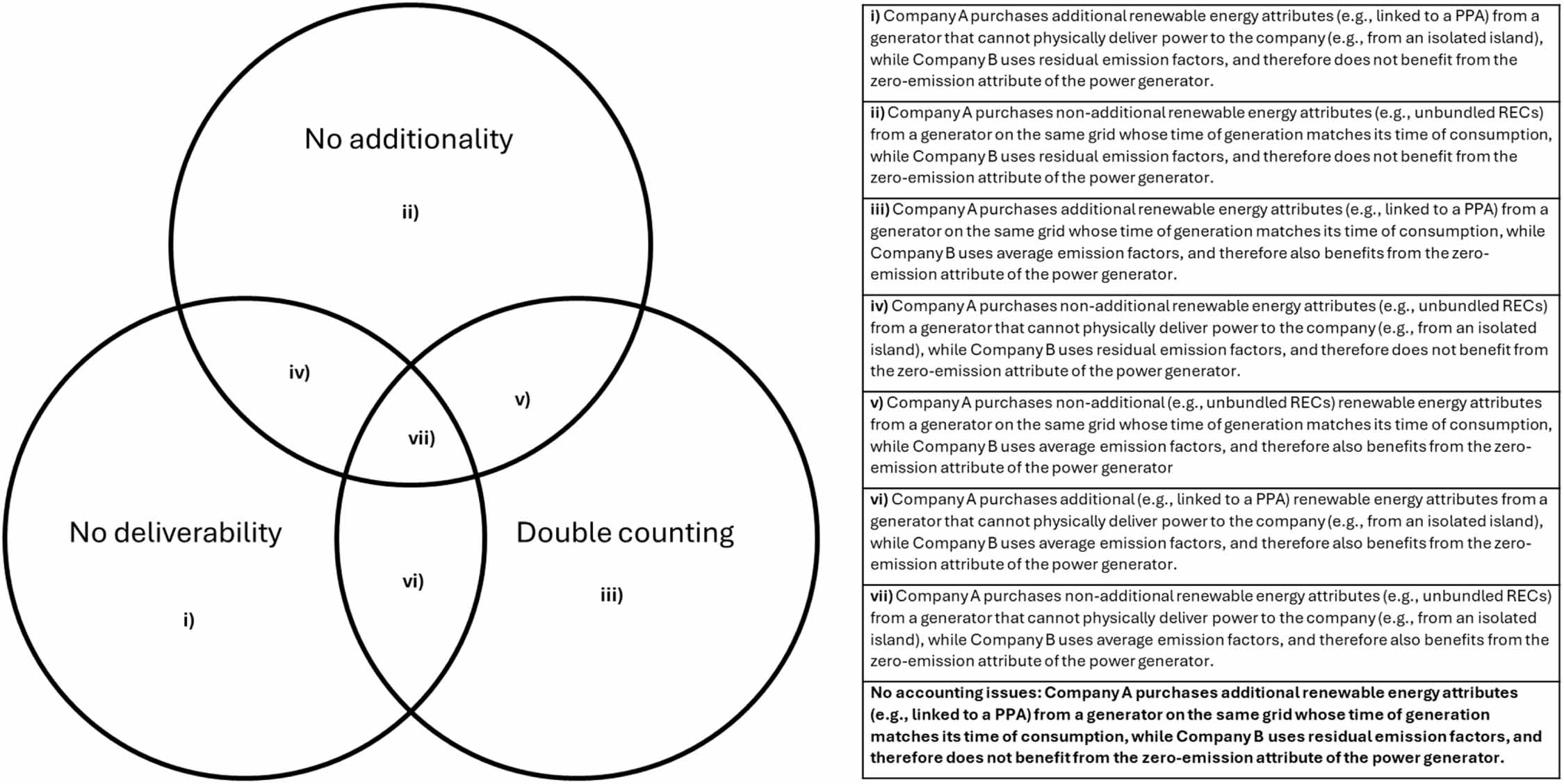 The frequent confusion between the three accounting issues presented above may be partially explained by the fact that there is a level of correlation between them, whereby one issue is more likely to occur if another issue is present. For example, lack of deliverability has been blamed for causing lack of additionality, as the former allows companies in regions with REC scarcity (e.g. Germany) to buy low-cost RECs from regions with surplus RECs (e.g. Norway) (Mulder and Zomer 2016, Paris et al 2024), and it allows companies that consume electricity in hours with low renewable energy generation to buy low-cost RECs tied to power produced in hours with surplus production (Google 2020, Ricks et al 2023). Lack of geographical deliverability has also been seen as enabling double counting in situations where companies do not follow the dual reporting requirement (box 1), with German companies using Norwegian hydropower RECs to report low market-based emissions, while Norwegian companies also benefit from the zero-emission attributes of hydropower in their location-based emissions (Paris et al 2024). Double-counting may also decrease the likelihood of additionality since companies that use low average emissions factors to report market-based scope 2 emissions, instead of higher residual emission factors as required by the standard (box 1), have less incentive to buy RECs. In turn, this means they do not help to drive the level of REC scarcity required for meaningful price signals to renewable project developers (Paris et al 2024).