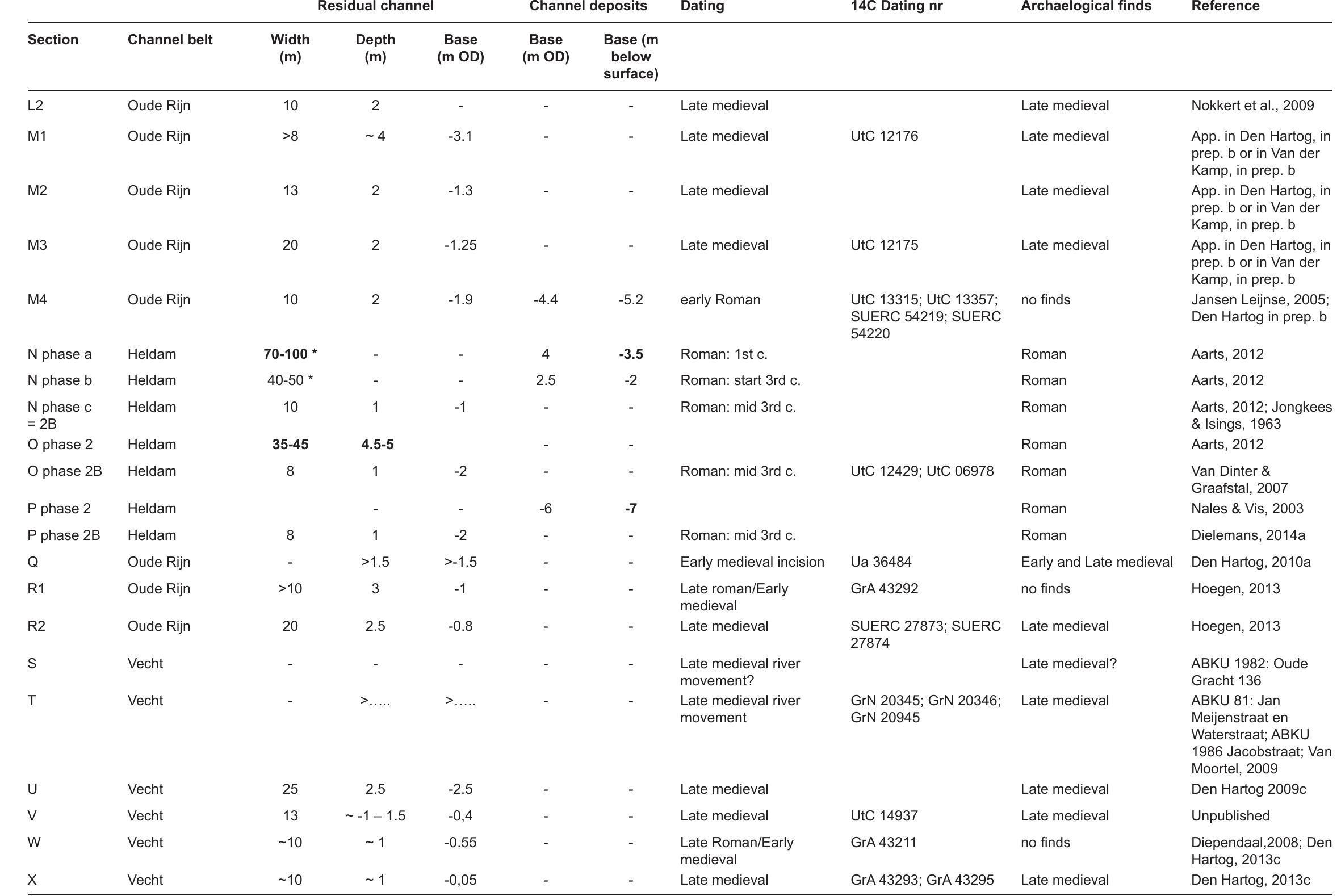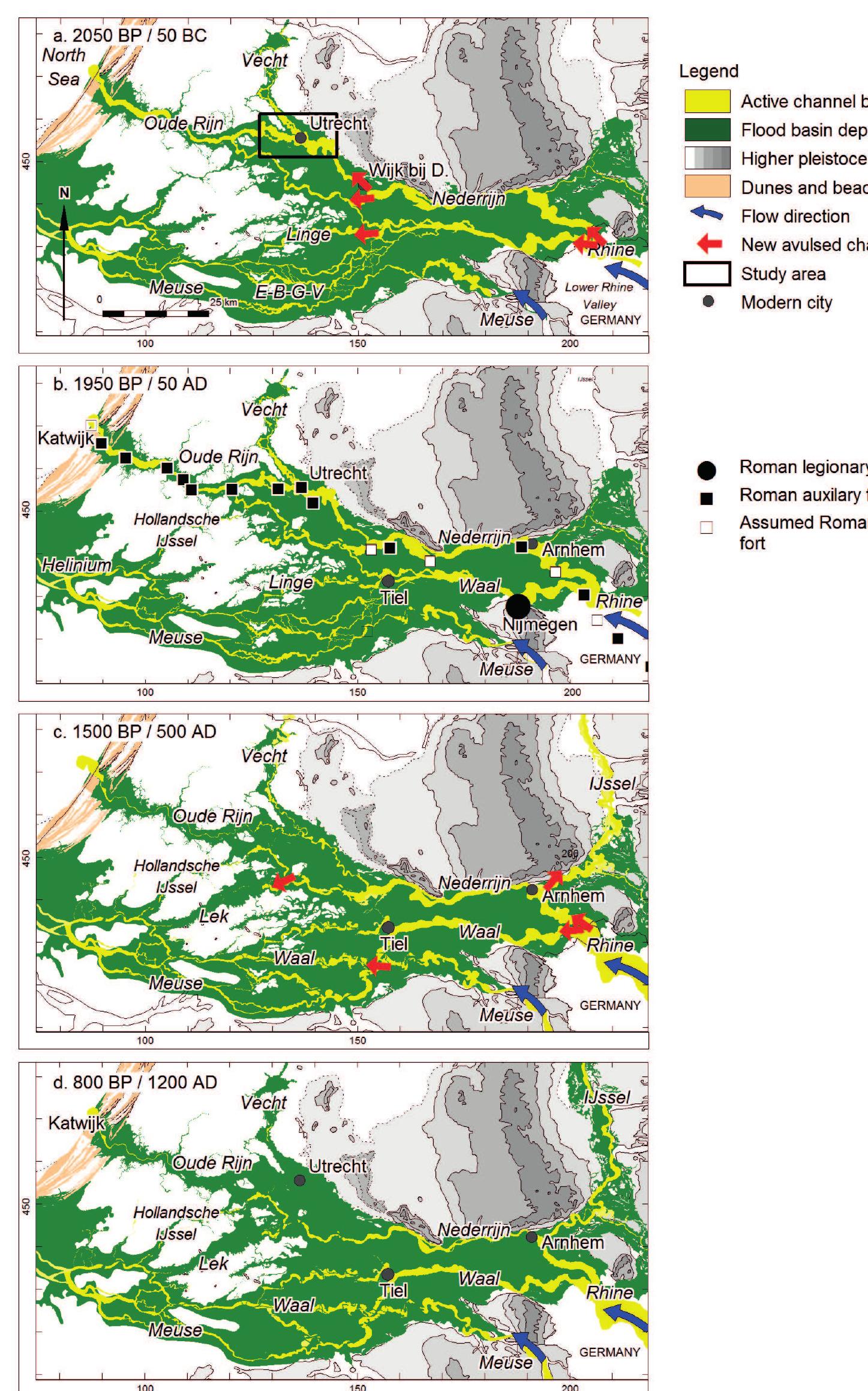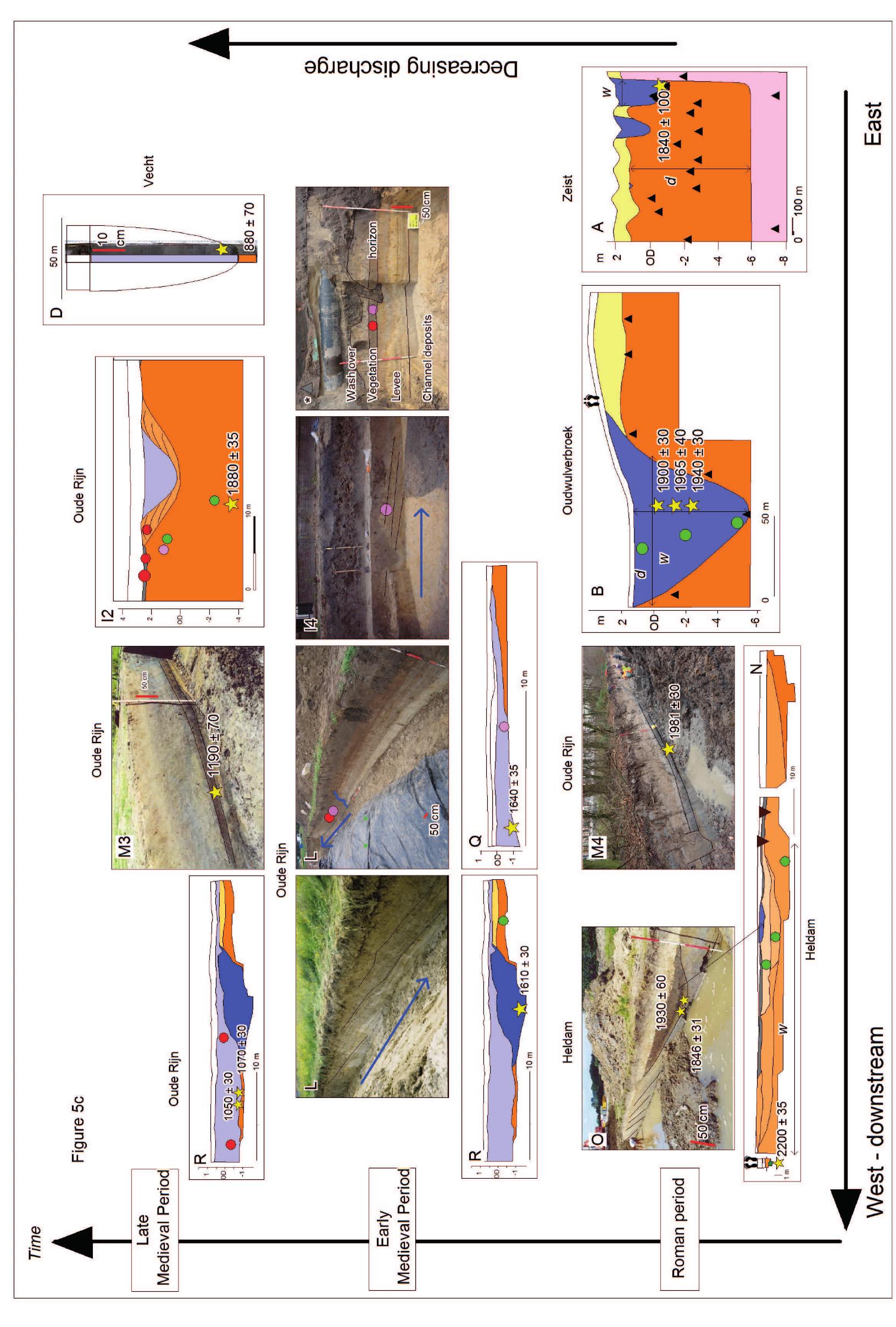 The Utrecht case study highlights the stage-wise abandonment of a natural river channel, due to avulsion, coincident with intensifying human occupation in Roman and Early Medieval times (1st millennium AD). The analyses make maximum use of very rich data sets available for the study area and the tight age control that the geo-archaeological dataset facilitates, offering extra means of time-control to document the pacing of the abandonment process. This allows us to quantify change in river dimensions and meander style and to provide discharge estimates for successive stages of the abandonment phase over a 1000-year period of abandonment succession, from mature river to eventual Late Medieval overbuilt canal when the Rhine branch had lost even more discharge.