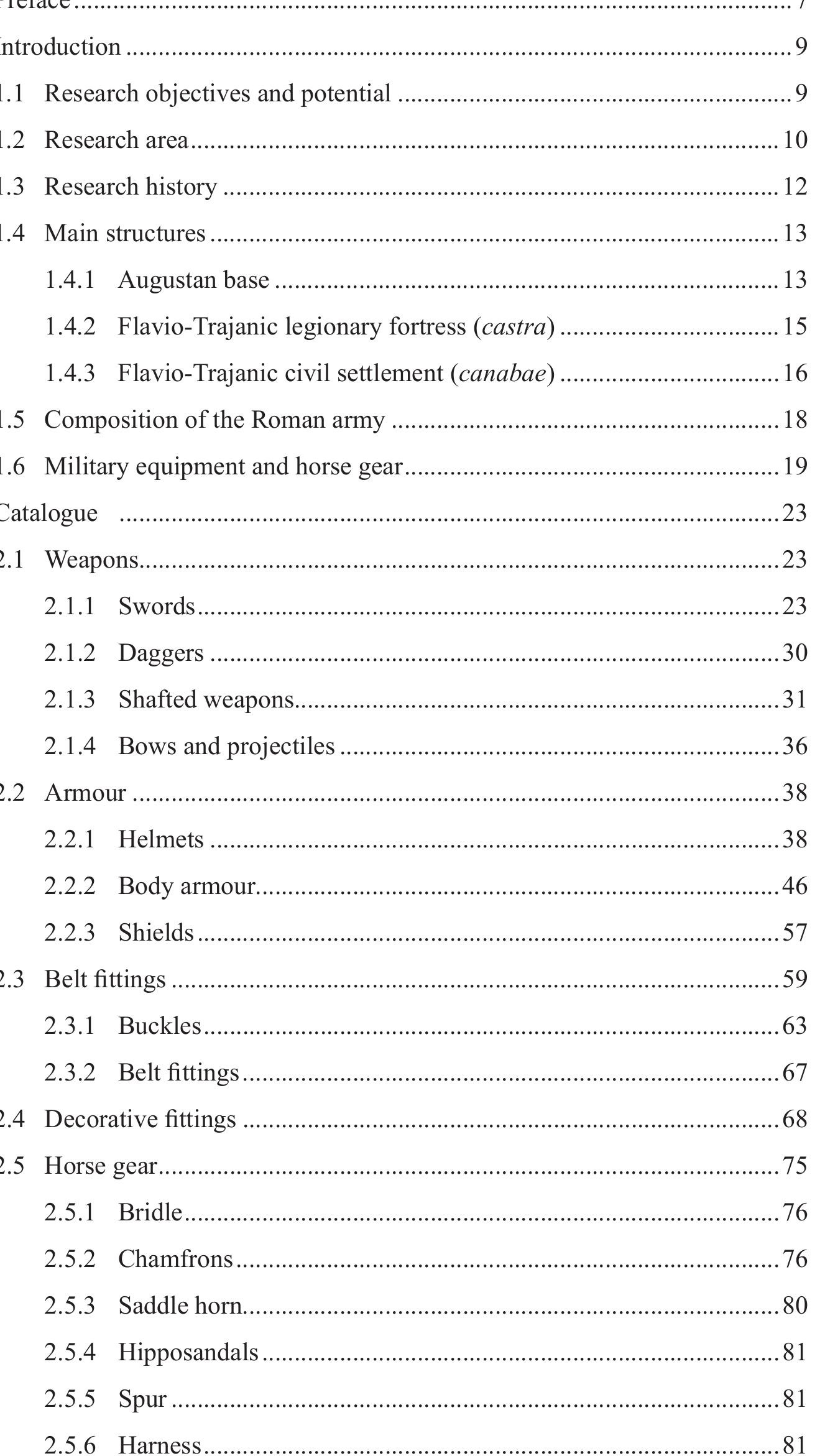 The selected categories are: terra sigillata potters’ stamps, coins, tile stamps, military equipment, horse gear and (gendered) brooches. Some of the topics addressed are the chronology of both sites, construction and repair activities, the composition of the fortress’ garrison, evidence for production and recycling of military equipment and the presence of civilians - and women in particular - living or working in the fortress.