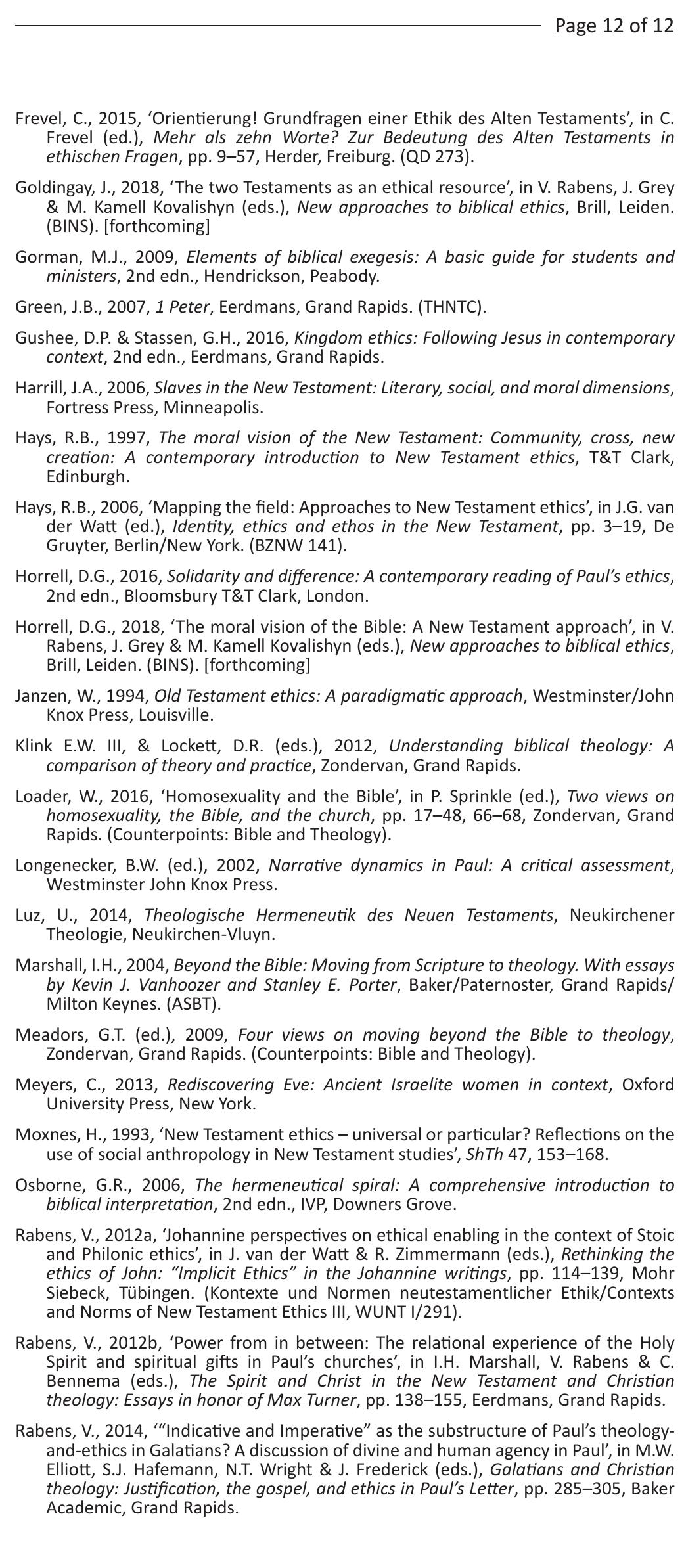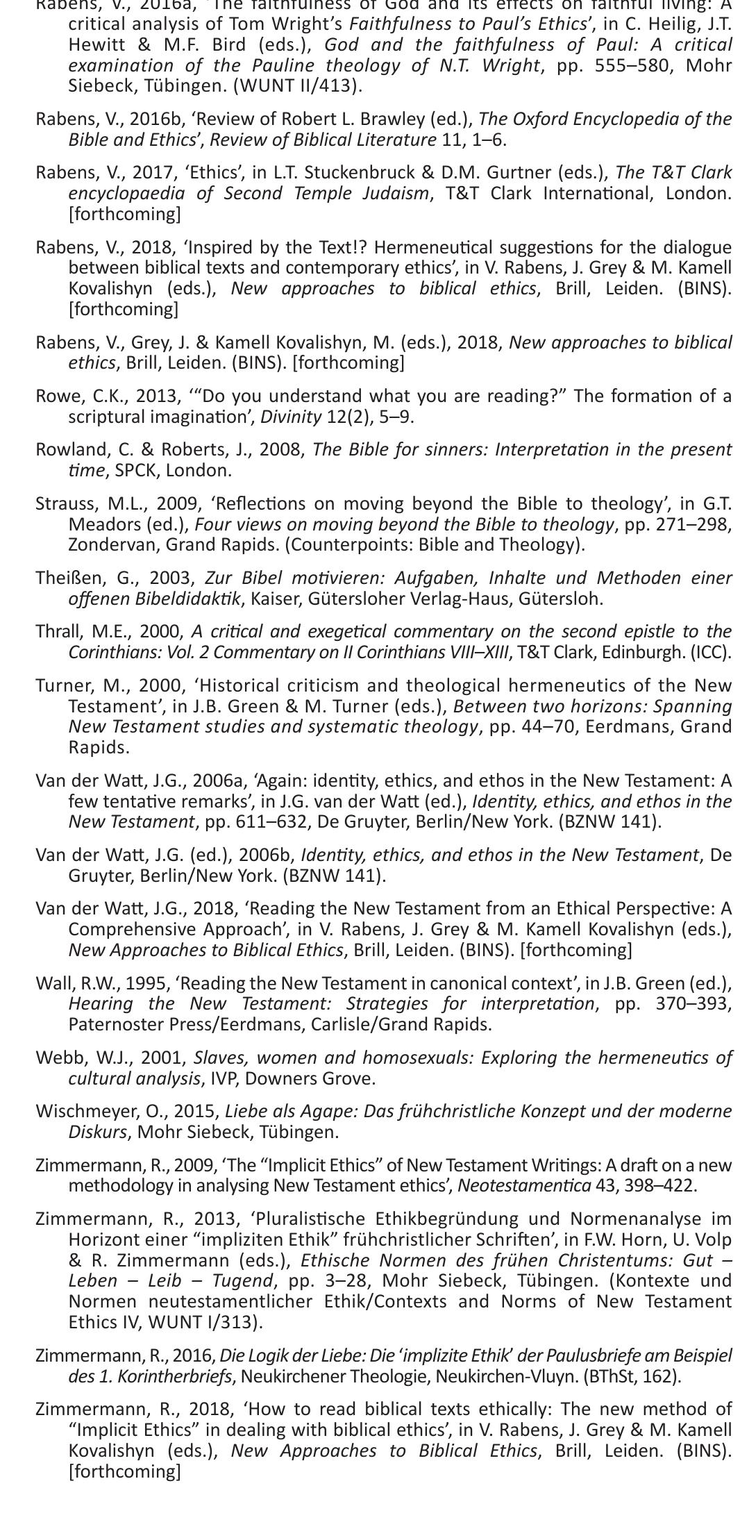 This chapter provides practical guidance for moving from the Bible to ethics. The Bible is often ... more This chapter provides practical guidance for moving from the Bible to ethics. The Bible is often used and misused in the context of Christian ethics. For this reason, Volker Rabens’ programmatic chapter “Inspiring Ethics: A Hermeneutical Model for the Dialogue between Biblical Texts and Contemporary Ethics” starts with a number of critical reflections on why and how the Bible may nonetheless inspire ethics today. The main part of the chapter is then devoted to presenting and illustrating four dynamic perspectives for the dialogue between biblical texts and contemporary concerns of religious-ethical life. The four dynamic perspectives of his hermeneutical model – the Organon 2.0 – invite discussion of the potential interplay of (1) cultural differences and transcultural analogies, (2) cultural limitations and countercultural inclinations, (3) canonical diversity and canonical consistency, and (4) canonical diversity and canonical centrality. From the perspective of the parameter of canonical centrality, for example, it is argued that the biblical narrative of love as it culminates in the gospel of Jesus Christ may function as a primus inter pares reference point for the dialogue between biblical ethics and ethics today. In the course of a detailed discussion and practical illustration of these hermeneutical perspectives, Rabens also provides a critical review of a number of alternative proposals regarding the relation of the Bible and ethics.