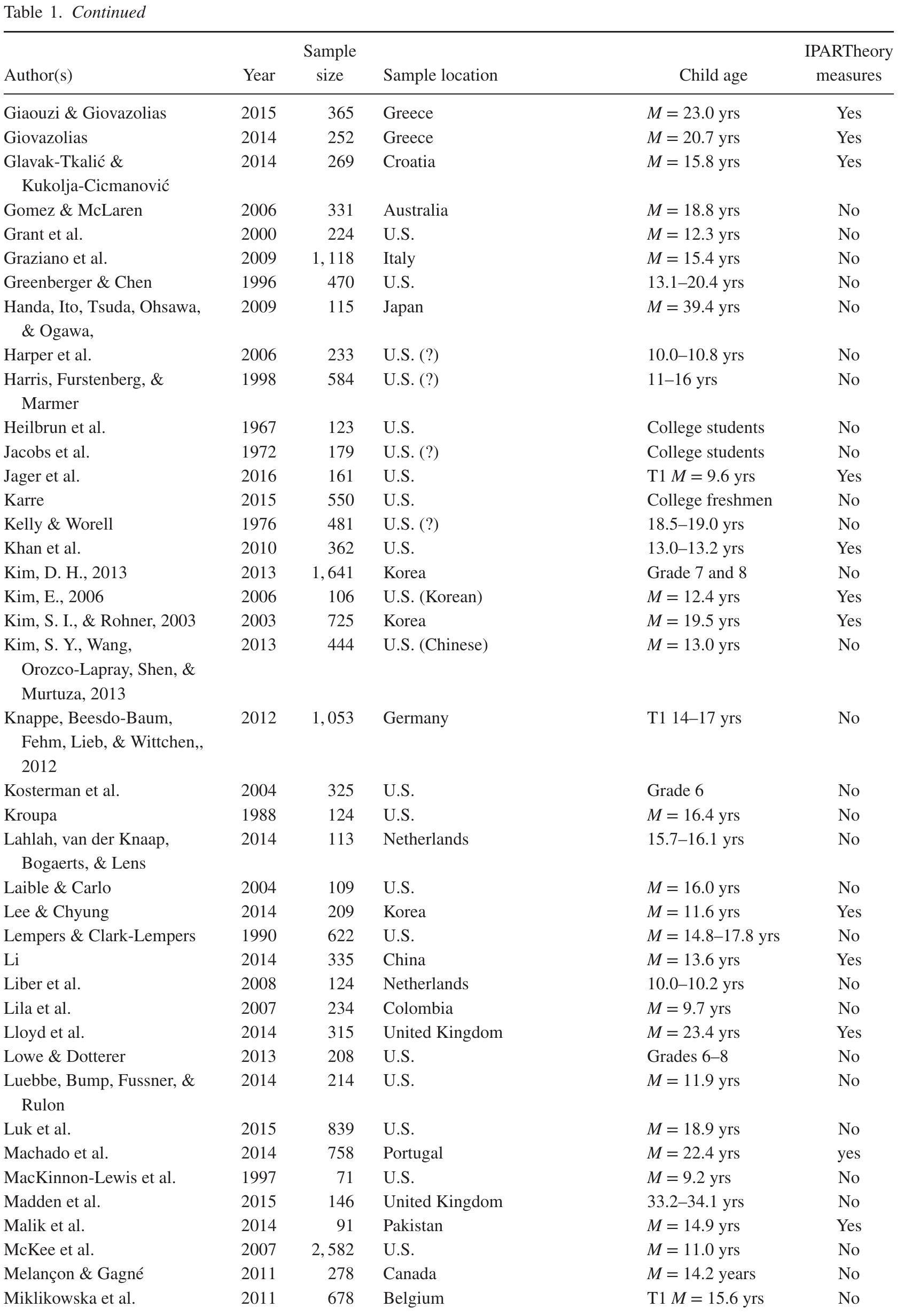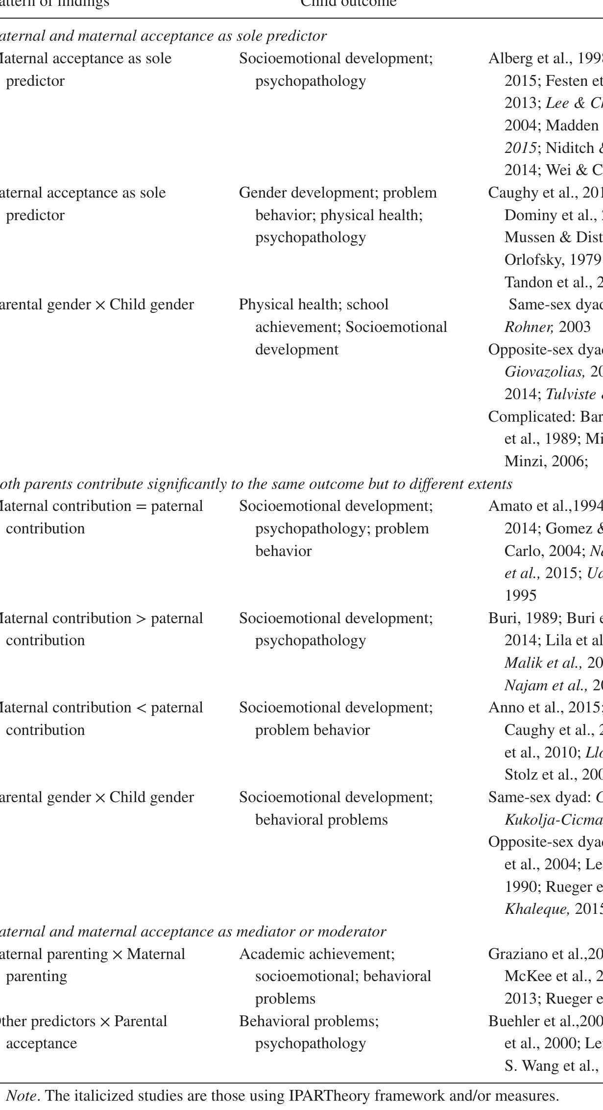 Adjustment Research on child development increasingly includes data on both parents and from diff... more Adjustment Research on child development increasingly includes data on both parents and from different cultures. However, the relative importance of fathers versus mothers for child adjustment is still under debate. The present review compares the contributions of perceived paternal and maternal acceptance to various child adjustment indicators among samples of families around the world. We reviewed 127 published studies that included child-reported paternal and maternal acceptance and developmental outcomes. Regardless of the sex of parent, children benefited from perceived parental acceptance. Fathers and mothers were often found to both predict adjustment significantly to varying degrees. Paternal acceptance tended to be related to children's problem behavior and psychopathology, whereas maternal acceptance was more likely to contribute to socioemotional development. Paternal and maternal acceptance also often jointly contributed to child adjustment through their interaction with each other and with other predictors. Moreover, the link between parental acceptance and adjustment was often moderated by child gender and