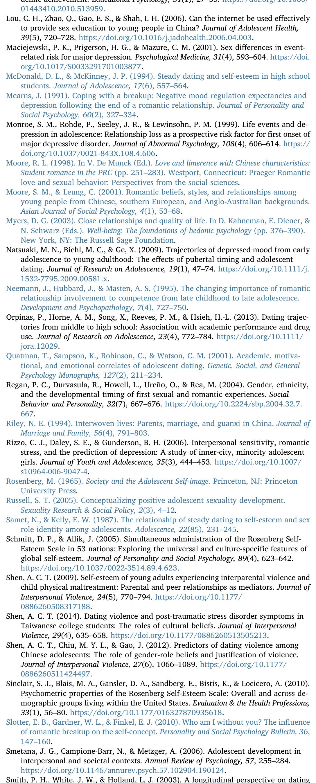 This study explores the effects of romantic involvement and dating behaviors on adolescent academ... more This study explores the effects of romantic involvement and dating behaviors on adolescent academic and psychosocial functioning in Chinese societies, where adolescent dating is generally discouraged and believed to generate adverse outcomes. Adolescents (male = 48.6%; Mean Age = 15.20 years) from Taiwan (N = 1081) and mainland China (N = 684) were recruited through stratified sampling to complete self-report surveys on their academic performance, depressive symptoms, self-esteem, relationship status, and gender-role beliefs. Adolescents with current or past dating experiences were also asked about specific dating behaviors, such as the onset of dating, number of relationships, and breakup experiences. Approximately one-third of Chinese adolescents surveyed (34.2%) have past or ongoing dating experience, who showed poorer academic performance compared to never-dated teens. In the full sample, single adolescents with past dating experiences reported greater depressive symptoms than those currently dating or never-dated teens. Boys with past dating experience showed higher self-esteem than their currently dating or never-dated peers, whereas single girls with past dating experience showed lower self-esteem than their currently dating or never-dated counterparts. Among adolescents with dating experience, early dating, over-dating, sexual activities, and breakup experiences can undermine their academic and psychosocial well-being. These findings have significant implications for practice and policy regarding adolescent education and mental health.