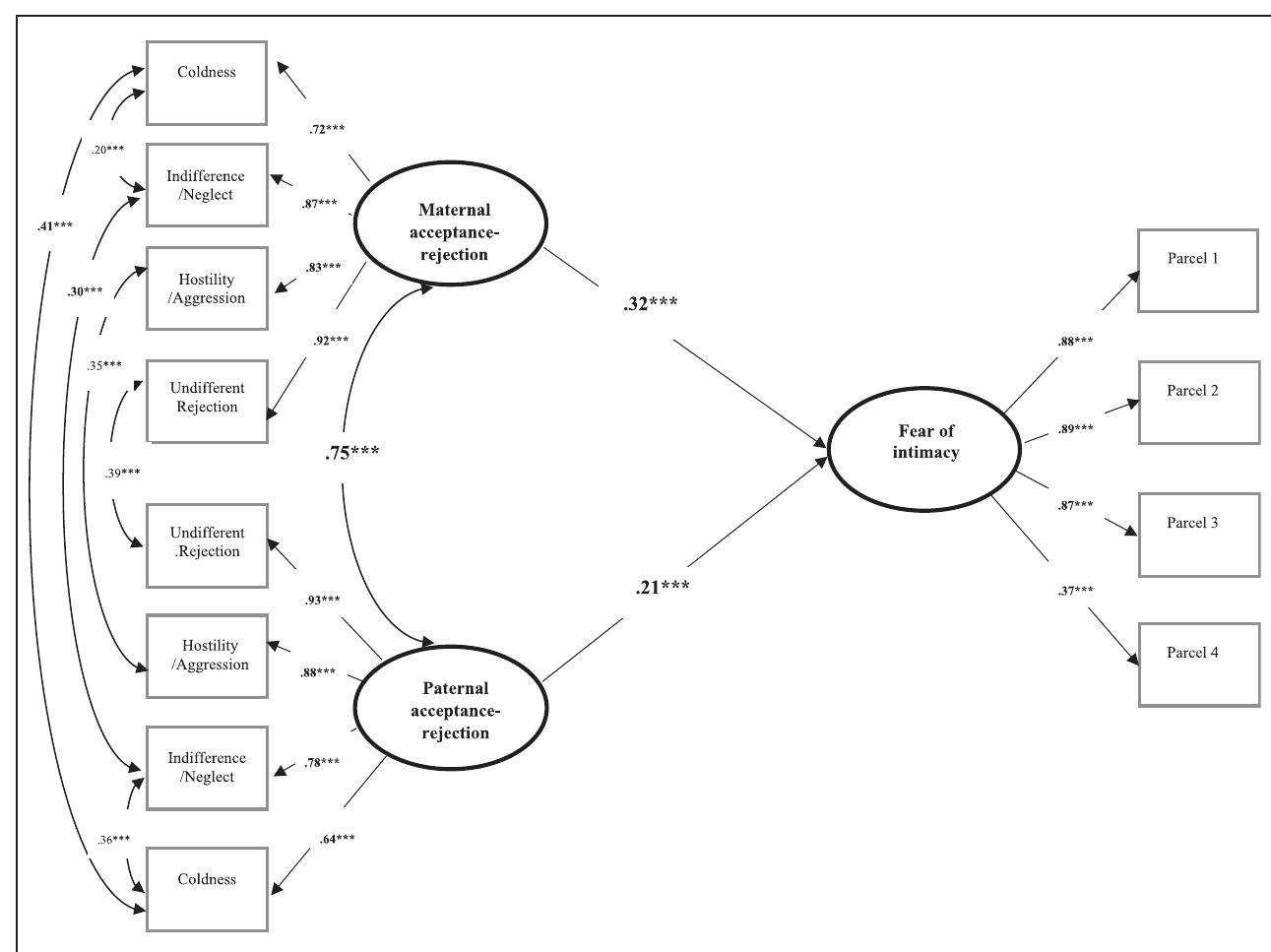 This study assesses interpersonal acceptance-rejection theory’s (IPARTheory’s) prediction that ad... more This study assesses interpersonal acceptance-rejection theory’s (IPARTheory’s) prediction that adults’ (both men’s and women’s) remembrances of parental (both maternal and paternal) rejection in childhood are likely to be associated with adults’ fear of intimacy, as mediated by adults’ psychological maladjustment and relationship anxiety. The study also assesses the prediction that these associations will not vary significantly by gender, ethnicity, language, culture, or other such defining conditions. To test these predictions a sample of 3,483 young adults in 13 nations responded to the mother and father versions of the Adult Parental Acceptance-Rejection Questionnaire (short forms), Adult Personality Assessment Questionnaire (short form), the Interpersonal Relationship Anxiety Questionnaire, the Fear of Intimacy Scale, and the Revised Personal Information Form. Results of multigroup analyses showed that adults’ remembrances of both maternal and paternal rejection in childhood independently predicted men’s and women’s fear of intimacy in all 13 countries. However, remembered maternal rejection was a significantly stronger predictor of adults’ fear of intimacy than was remembered paternal rejection. Results also confirmed the prediction in all 13 countries and across both genders that both maternal and paternal rejection independently predicted adults’ psychological maladjustment and relationship anxiety, which in turn predicted fear of intimacy. In addition, psychological maladjustment partially mediated the relation between remembrances of maternal and paternal rejection, and adults’ fear of intimacy in all 13 countries and both genders.