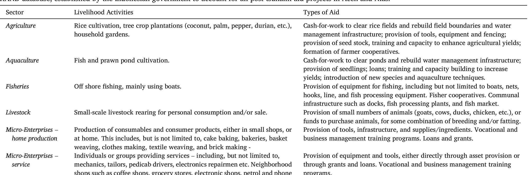This paper presents a field study on the long-term effectiveness and sustainability of livelihood... more This paper presents a field study on the long-term effectiveness and sustainability of livelihood interventions following the 2004 Indian Ocean tsunami in Aceh, Indonesia. We assess the extent to which post-tsunami aid in Aceh helped beneficiaries to stabilize and restore their pre-disaster livelihoods, and/or develop new livelihoods. We draw upon qualitative data captured in 183 in-depth interviews and 38 focus group discussions involving village leaders, livelihood aid participants, and NGO workers. Our results show that livelihood assistance helped people stabilize their household finances and partially restore their pre-disaster livelihoods. Furthermore, we found that aid programs were able to help some people without pre-disaster livelihood experience to participate in part-time, ad hoc work. However, aid packages were generally not able to support the development of fulltime, sustainable new livelihoods for people lacking pre-disaster training and experience. Our data suggests that it is difficult to conduct efficient and sustainable livelihood development initiatives within the time pressures and current institutional approaches to large-scale post-disaster reconstruction.