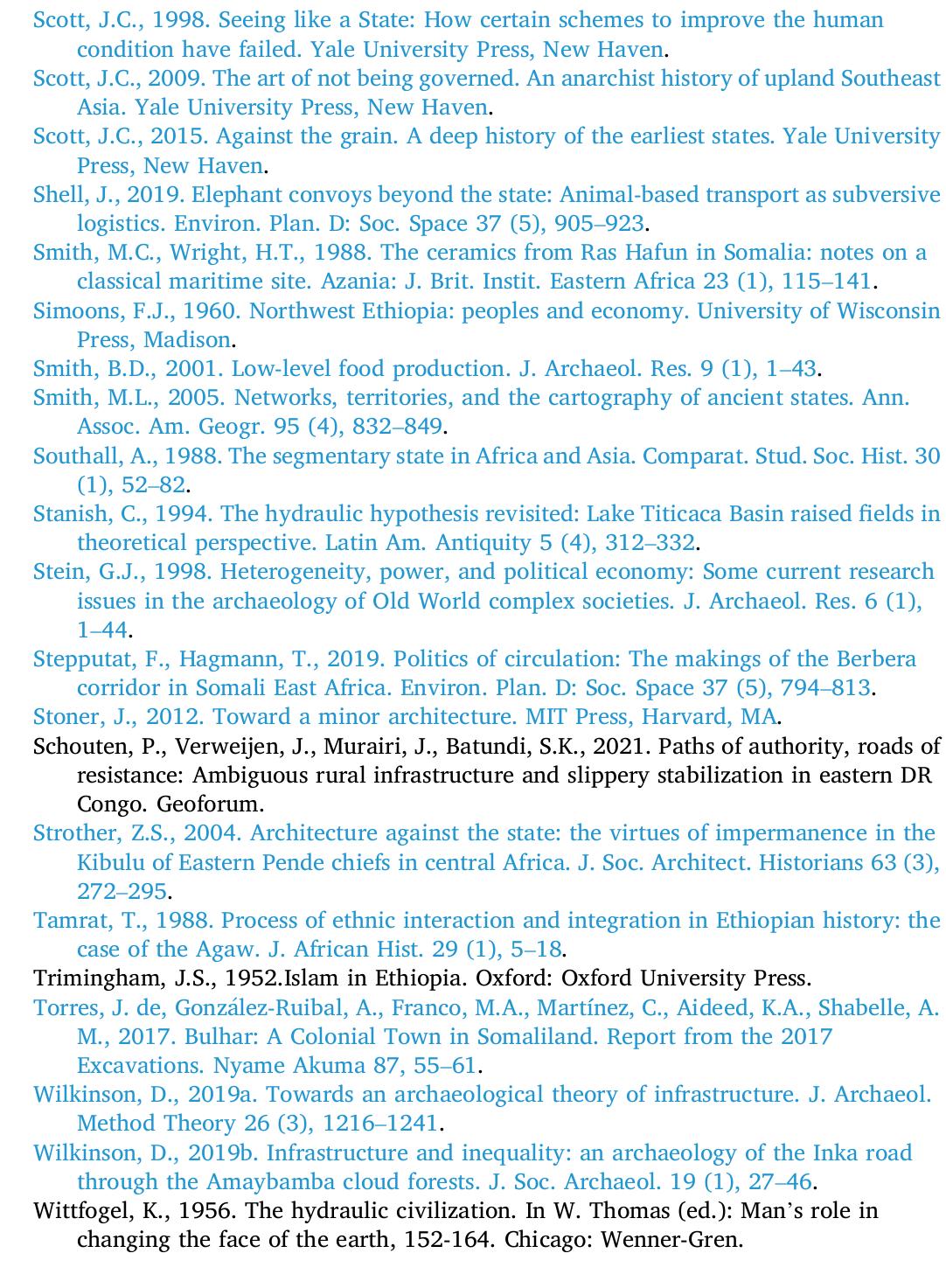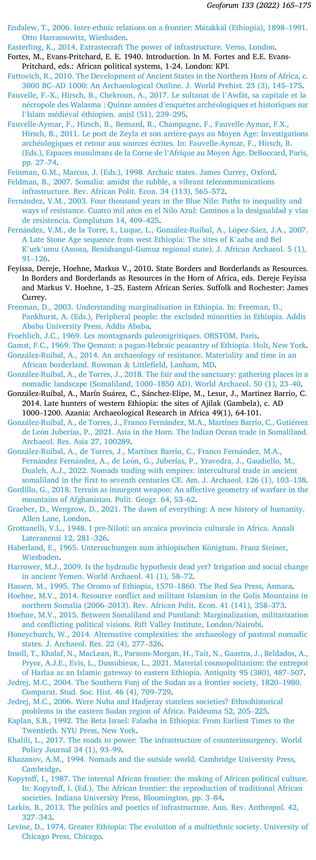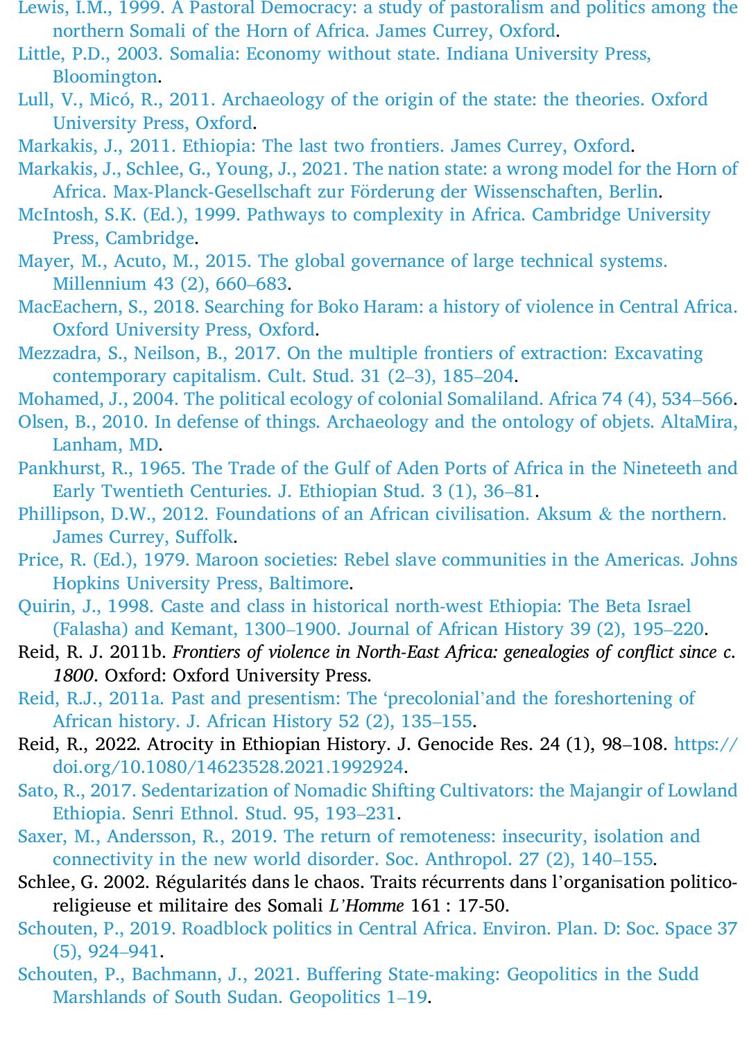 In this article, I intend to use archaeology's understanding of deep time and infrastructure to e... more In this article, I intend to use archaeology's understanding of deep time and infrastructure to explore the ways in which state-making has been challenged in the Horn of Africa during the last two millennia. I will take a longterm approach to state ecology and state resistance so as to eschew the presentist bias that is all too frequent in political analyses, particularly in Africa, and that prevents us from understanding some of the deep undercurrent that explain contemporary phenomena. The Horn is an ideal case for this kind of inquiry because it has some of the oldest state polities south of the Sahara; state trajectories in the region are non-linear and fraught with obstacles, though surprisingly persistent, and small-scale, stateless societies have proved to be extremely persistent, both in the periphery and at the heart of the state. Here I will explore three themes that are illustrative of the relationship between state-building, infrastructures and resistance in the borderlands of the Horn of Africa: the anti-infrastructural ethos of nomadic pastoralists; internal frontiers or zones of difference, and liminal ecologies, such as swamps and escarpments, which defy state control, technologies and imaginaries.