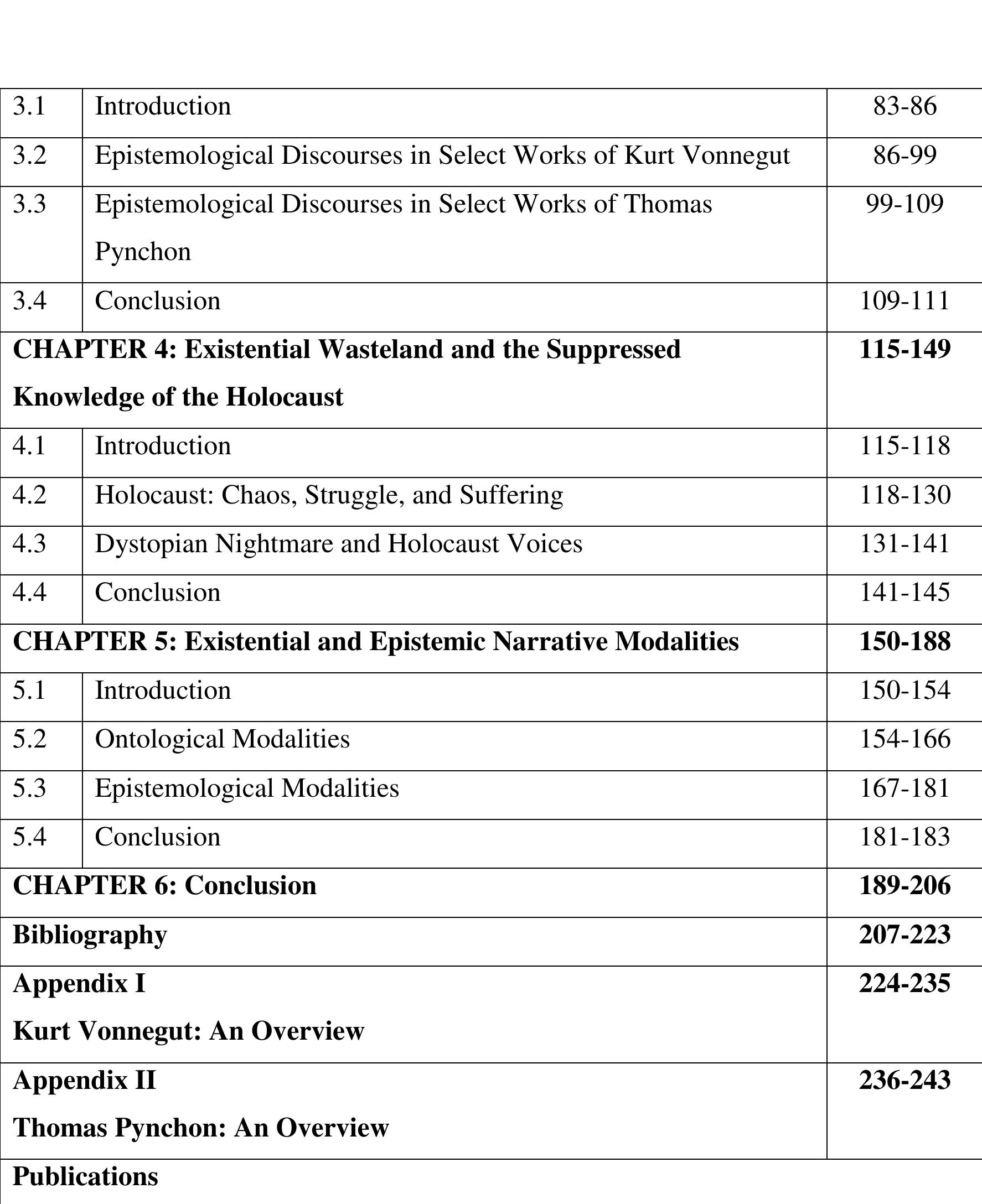 The fifth chapter titled “Existential and Epistemic Narrative Modalities” discusses the narrative... more The fifth chapter titled “Existential and Epistemic Narrative Modalities” discusses the narrative structure of fiction in terms of “modality” which refers to the belief system of the authors. The ontological modalities in the narrative are expressed through existential threats, holocaust, “Denarration”, trauma, apocalypse and post-apocalypse, and pre-apocalyptic atavism. The epistemological modalities are expressed through linguistic aspects using scientific knowledge in forming the narrative of their fictions. The chapter looks at how Vonnegut and Pynchon make use of science and technology to manipulate the epistemological as well as ontological structures of their fictions.