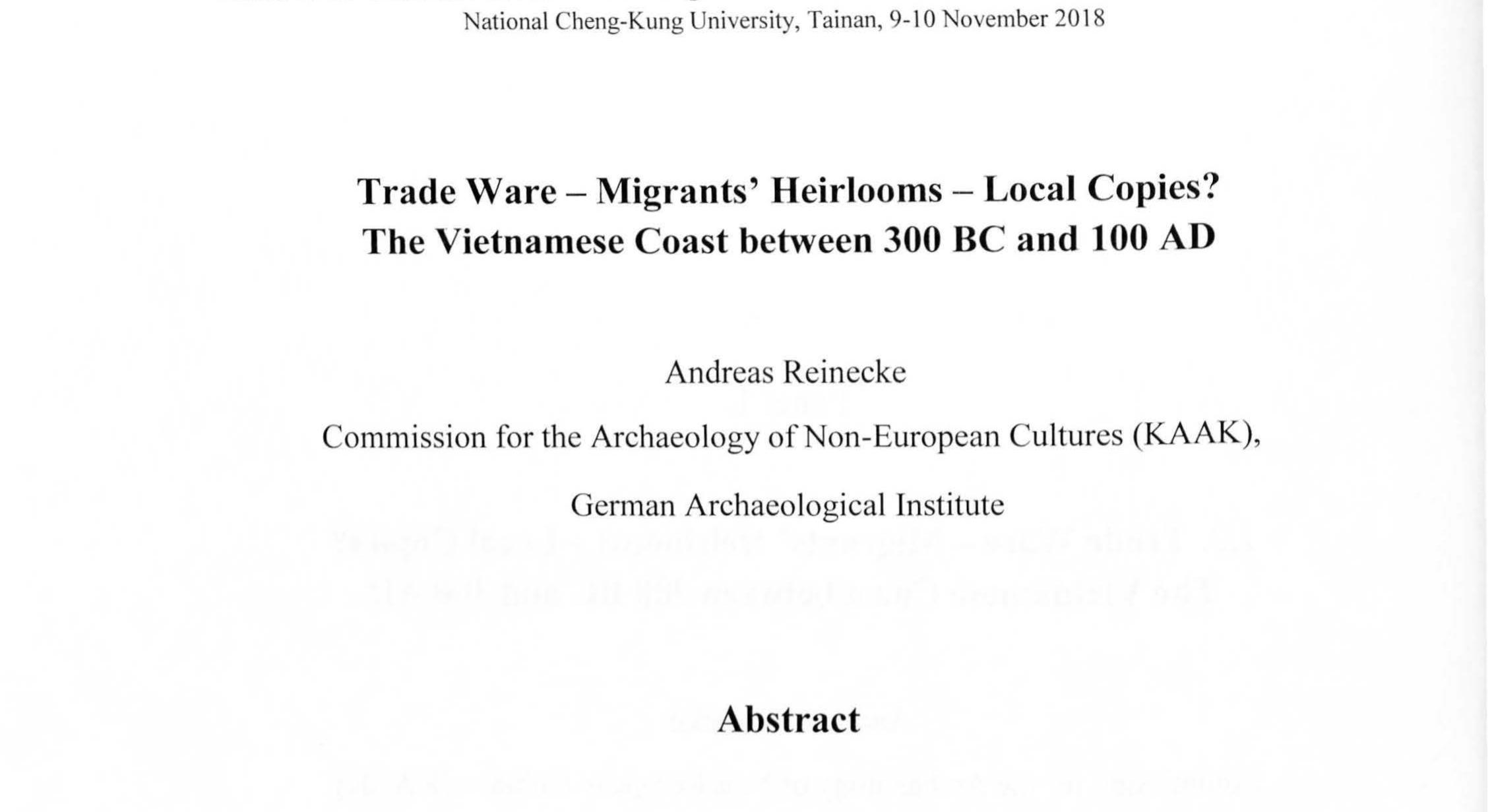 During the last 30 years, about a dozen large archaeological sites with more than 1000 burials of... more During the last 30 years, about a dozen large archaeological sites with more than 1000 burials of the Early Iron Age were excavated along the Vietnamese coast. While we know what artefacts typical of the region and era look like, many objects can be identified and classified as originating from locations far from the site where they were excavated. The findings include bronze drums, mirrors, vessels and coins from the north (China or northern Vietnam) as well as precious stone ornaments, glass, the first gold and silver or special ceramic ware from the west (India via the Thai-Malay Peninsula or via the "silver road" through northern Burma and along the Mekong River). However, not every strange-looking" item is proof of"trade" along the maritime silk route.
