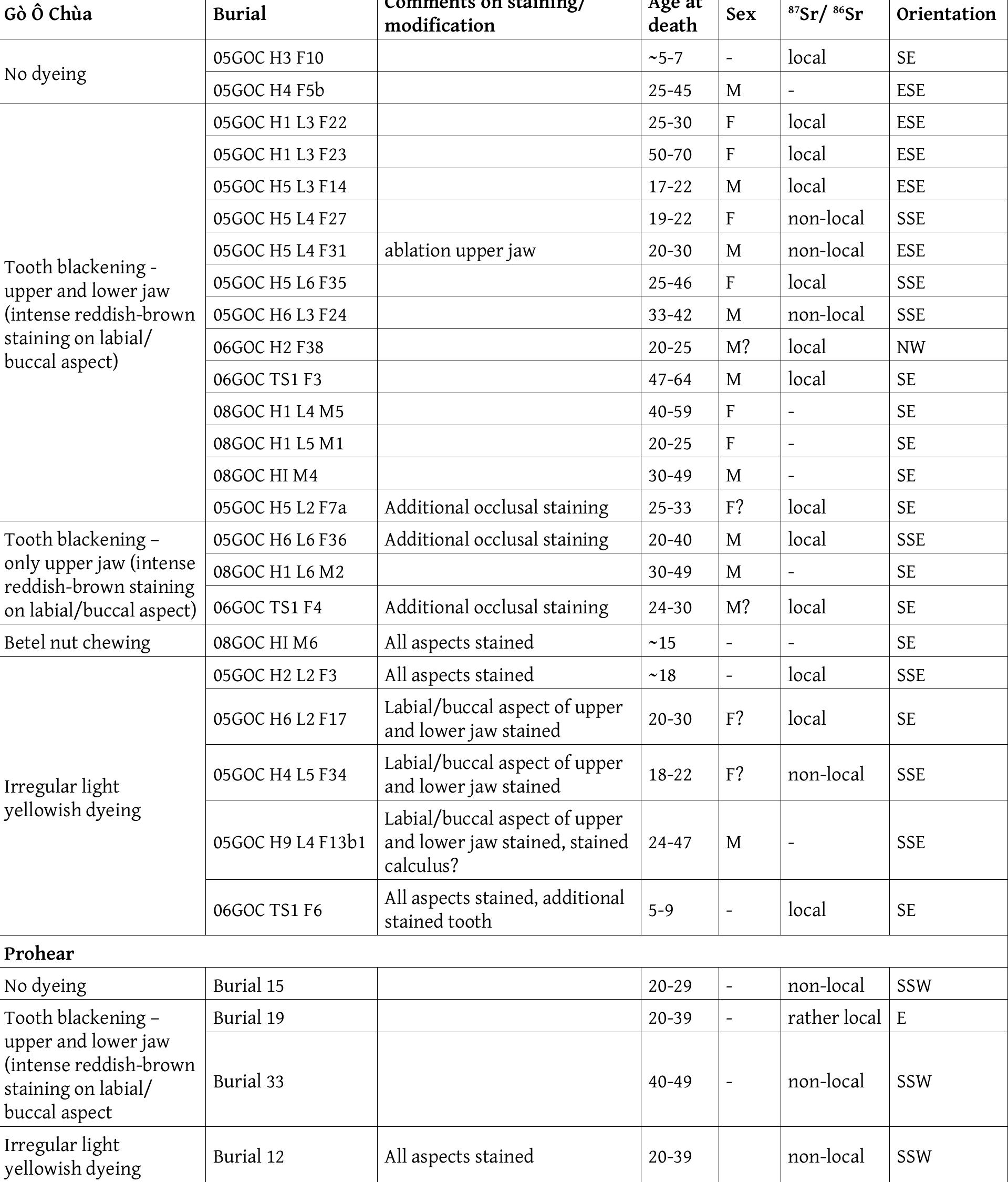 Human teeth play a significant role in the reconstruction of biological life parameters. Dental m... more Human teeth play a significant role in the reconstruction of biological life parameters. Dental modifications supply additional valuable insights into past human cultural behavior. At the Early Iron Age sites of Gò Ô Chùa (400-100 BC) and Prohear (main mortuary period 200 BC-AD 100), various patterns of intravitam dental staining have been found. Systematic visual analysis is presented here as a method for the thorough documentation and subsequent differentiation of specific staining patterns. Using evidence from ethnographical, historical and archaeological studies, the main pattern seen is interpreted as intentional tooth blackening. Since tooth blackening affects almost all adult individuals from Gò Ô Chùa, the custom was of high social relevance. Additionally, one individual shows staining interpreted as the unintentional result of betel nut chewing.