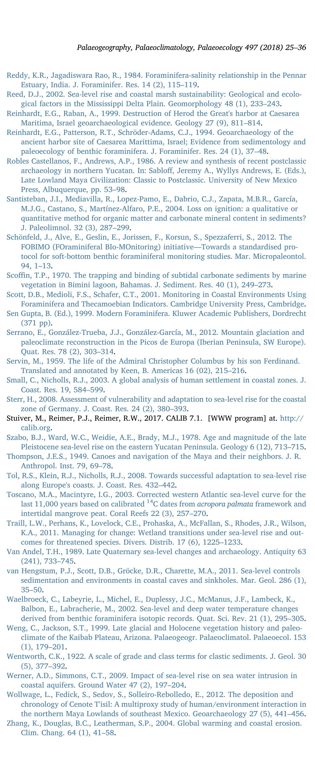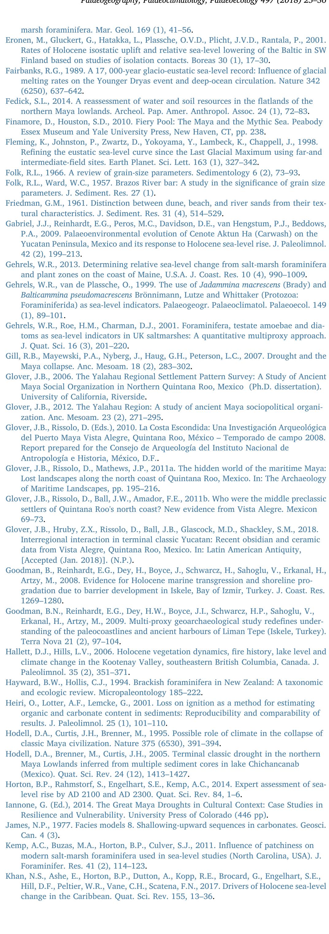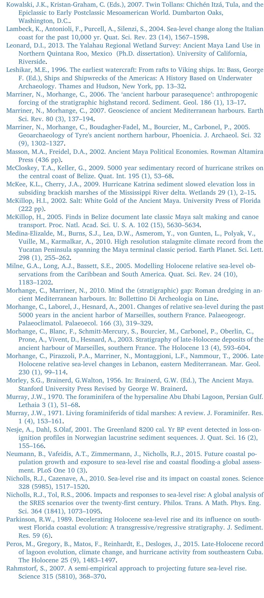 A B S T R A C T Past coastal reconstruction is useful for understanding archaeological coastal se... more A B S T R A C T Past coastal reconstruction is useful for understanding archaeological coastal settlements and predicting how coastal change might affect modern populations. The ancient Maritime Maya inhabitants of Vista Alegre in the northeastern Yucatan were active seafaring peoples. However, the past coastal landscape environmental history is unknown. Previous research concentrated on the fully terrestrial component of the site, and did not approach the issue from an earth sciences, sedimentological perspective. In this study, a sediment core campaign in the shallow offshore of Vista Alegre aimed to reconstruct the coastal and environmental changes that occurred over the past 3000 years, and specifically identify the changes in sea-level. Nine cores were analyzed using a multi-proxy approach including a range of sedimentological parameters such as granulometry, micropaleontology (foraminifera), radiocarbon dating, and loss on ignition. The sediment cores provided an archive of environmental changes related to sea-level change, anthropogenic influence, and shifting microenvironments which can be associated with cultural time periods. The environmental phases and shifts show some linkage to the archaeological chronology, suggesting an association between the environmental conditions and human activities. Sea-level changes and shifting shorelines have always been, and still are, a challenge for coastal settlements, and ancient sites can be a harbinger of what to anticipate in the future. In addition to this, current natural and anthropogenic pressures on coastlines are placing archaeological sites at increasing risk and thereby threatening this important scientific and cultural archive. Therefore, efforts to identify, characterize, and record natural and anthropogenic pressures prior to destruction are increasingly important.
