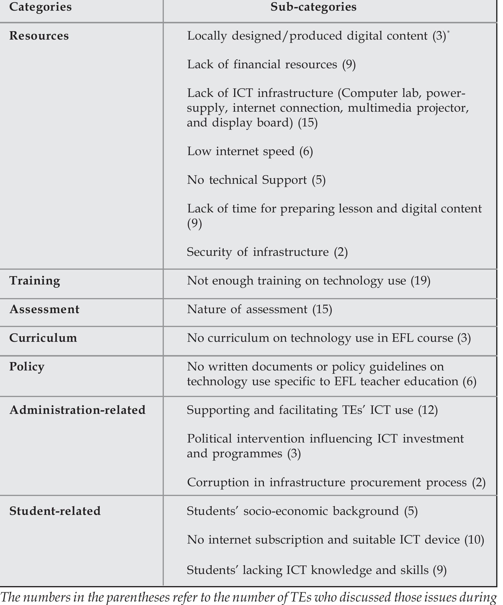 policymakers. The analyses of the policy data and interviews reveal that multiple factors constrain TEs’ digital practices. A key finding of the study is that factors related to ICT policies, training for TEs and resources hindered the use of technology by TEs. Implications of these are discussed.