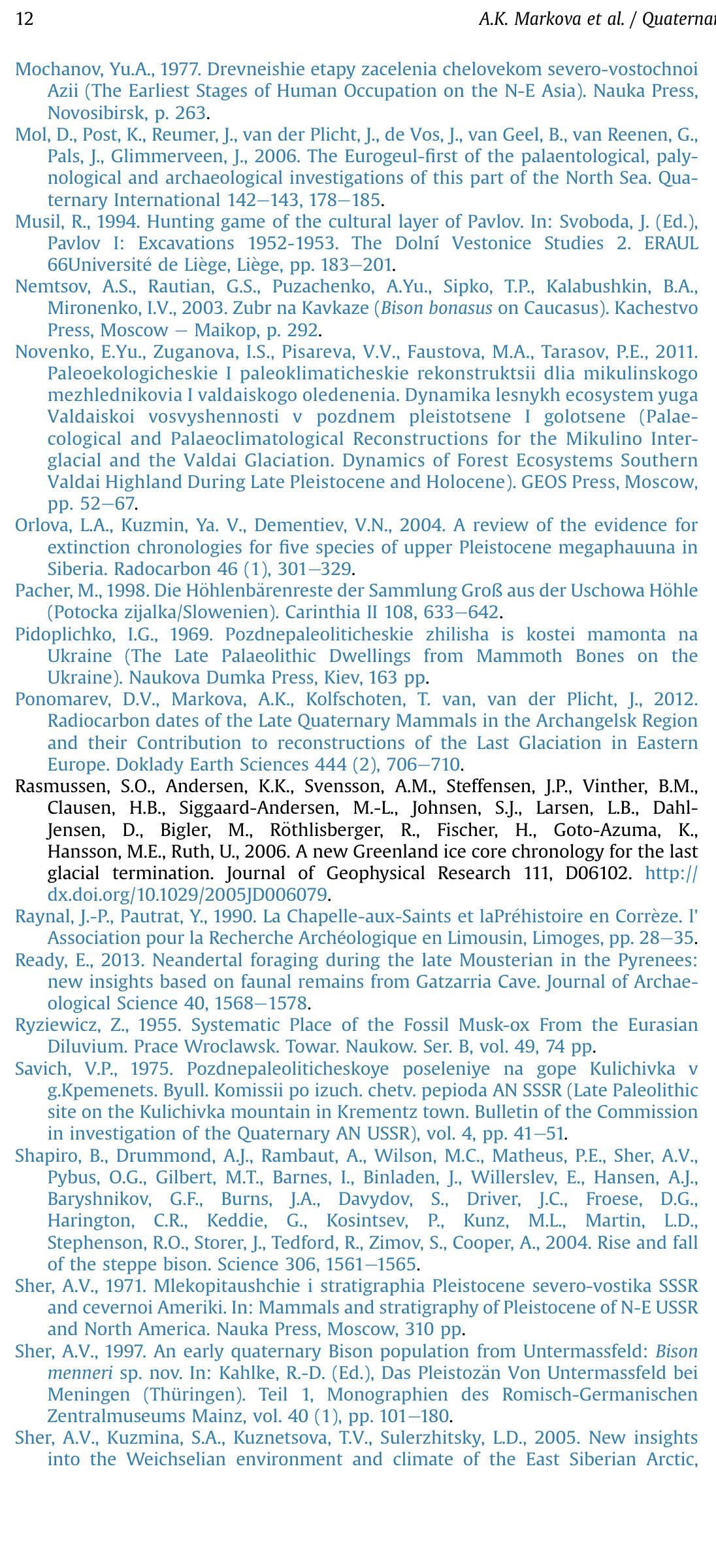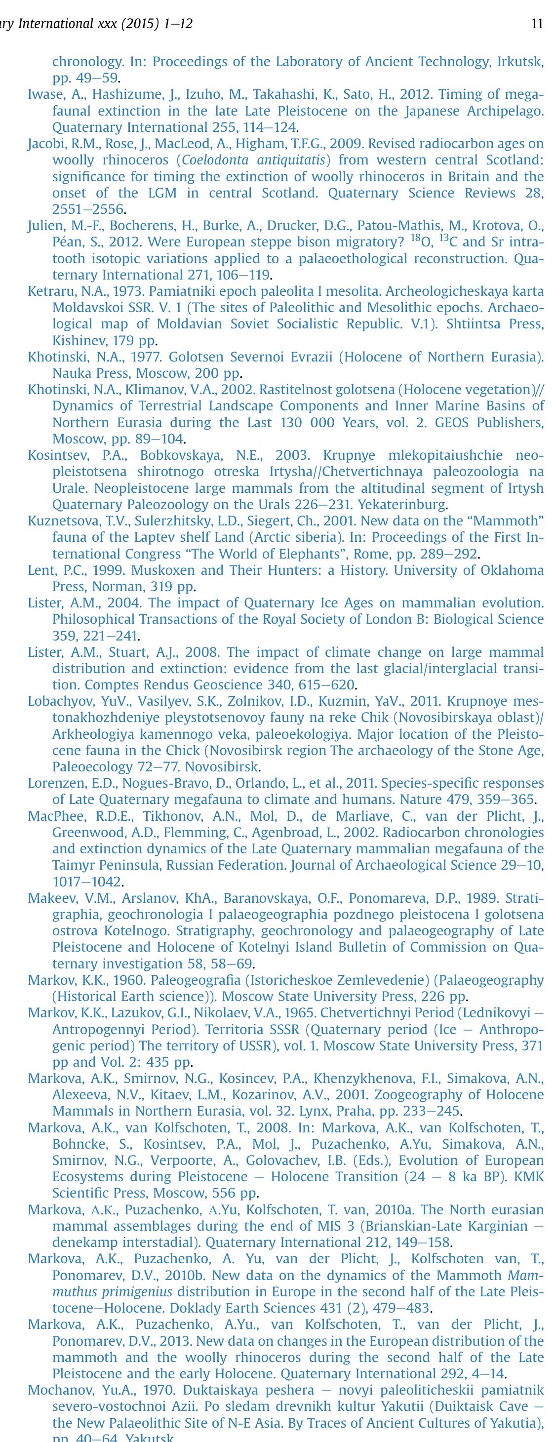 A recent update of the PALEOFAUNA database (including new 14 C dates) revealed new insights in th... more A recent update of the PALEOFAUNA database (including new 14 C dates) revealed new insights in the changes in the geographical distribution and the (local) extinction of larger mammals in Northern Eurasia during the second part of the Late Pleistocene and the Holocene, a period with dramatic changes in climate. In this paper, we present and discuss the observed changes in the distribution of two herbivore species: the musk ox Ovibos moschatus and the extinct bison Bison priscus, which are the major components of the "mammoth steppe" mammalian assemblage. The decrease of their ranges and their extinction during the Holocene (as a part of the Megafauna extinction in Eurasia) was primarily connected with changes in climate and partly the result of Anthropogenic pressure. Quaternary International xxx (2015) 1e12 Please cite this article in press as: Markova, A.K., et al., Changes in the Eurasian distribution of the musk ox (Ovibos moschatus) and the extinct bison (Bison priscus) during the last 50 ka BP, Quaternary International (2015), http://dx.