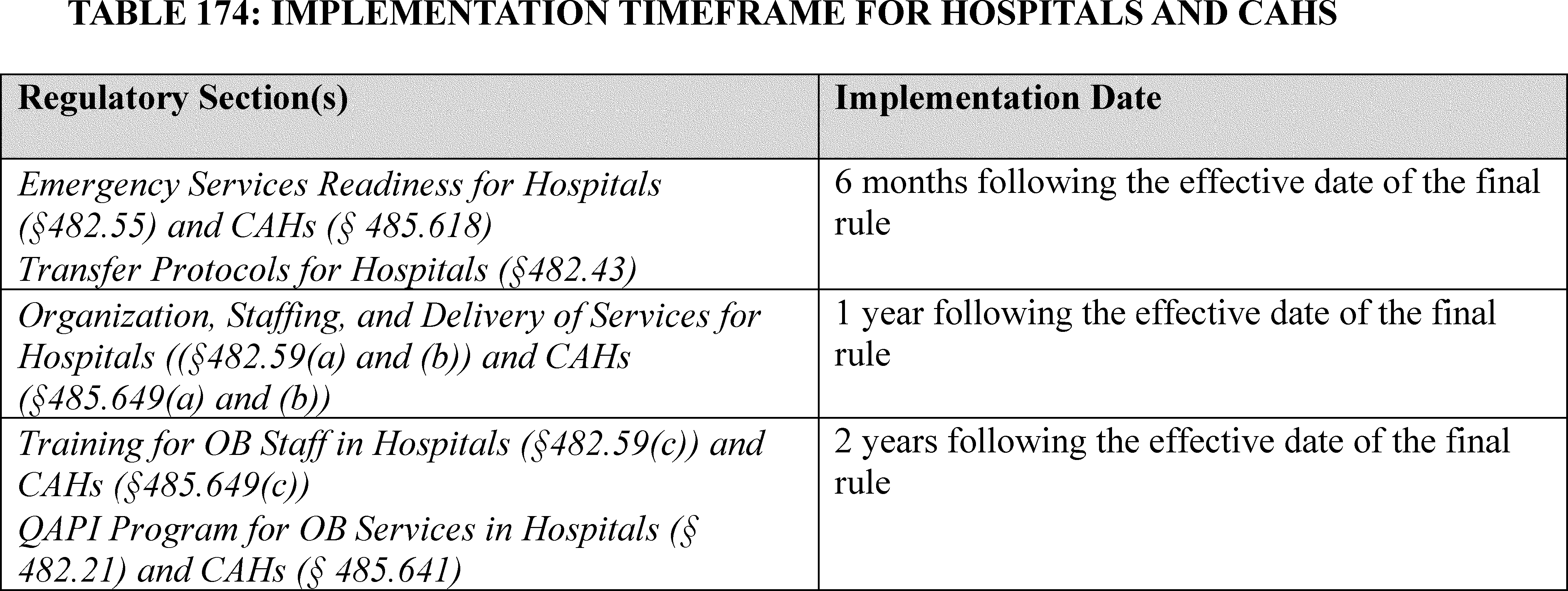 Implementation date: Except as set forth in this section, the regulations at §§ 482.43(c), 482.55(c), and 485.618(e) must be implemented by July 1, 2025; the regulations at §§ 482.59(a) and (b) and 485.649(a) and (b) must be implemented by January 1, 2026; and the regulations at §§ 482.21(b)(4) and (e), 482.59(c), 485.641(d)(4) and (e)(2), and 485.649(c) must be implemented by January 1, 2027.