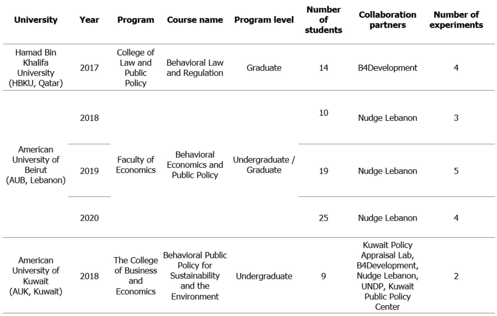 This paper presents the development and implementation of experiential behavioral economics cours... more This paper presents the development and implementation of experiential behavioral economics course in three Middle East universities. Experiential learning has proven to have many benefits for students because of putting them at the center of the learning process and allowing them to learn by doing. More specifically, as part of the practical sessions, students were tasked to design, implement and report on one field experiment conducted in collaboration with a nudge unit. We believe that this approach whereby students apply their knowledge through experimentation to address issues relevant to their communities and environment can be more effective and impactful than traditional teaching or relying only on classroom-based experiments. In this paper, we share the lessons learned from the journey of delivering several experiential behavioral economics courses.