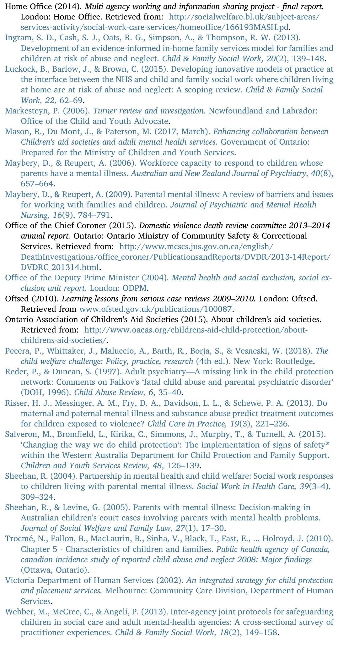 Collaboration between child welfare and adult mental health service providers is important to add... more Collaboration between child welfare and adult mental health service providers is important to address parental risk factors that may affect child wellbeing. The aim of this paper is to describe findings from a survey which identified barriers and facilitators to collaboration between these two sectors. A semi-structured instrument,