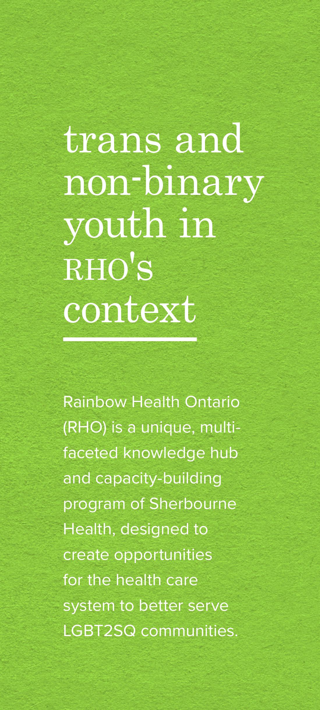 Rainbow Health Ontario (RHO), a program of Sherbourne Health, led a needs assessment to learn abo... more Rainbow Health Ontario (RHO), a program of Sherbourne Health, led a needs assessment to learn about ongoing concerns and challenges faced by trans and non-binary children and youth; their parents and caregivers; and their service providers. In this report, we review the current literature on trans and non-binary children and youth and share their perspectives, along with those of their caregivers, on their health and social needs. We also offer evidence for policy and service development in support of these populations, and provide cross-sectoral recommendations for public and community sector agencies to better address the needs of these youth and their families.