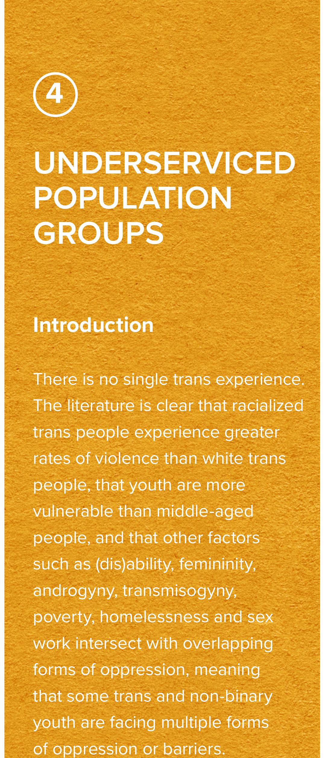 Canada and the City of Toronto. Between 2018 to 2019, mixed-method research activities were undertaken with a trauma-informed, community-based approach. This report summarizes the findings of an online survey, focus groups, and individual interviews with 154 diverse Two-Spirit, Nonbinary, Trans, gender non-conforming, and gender questioning community members in the Greater Toronto Area.