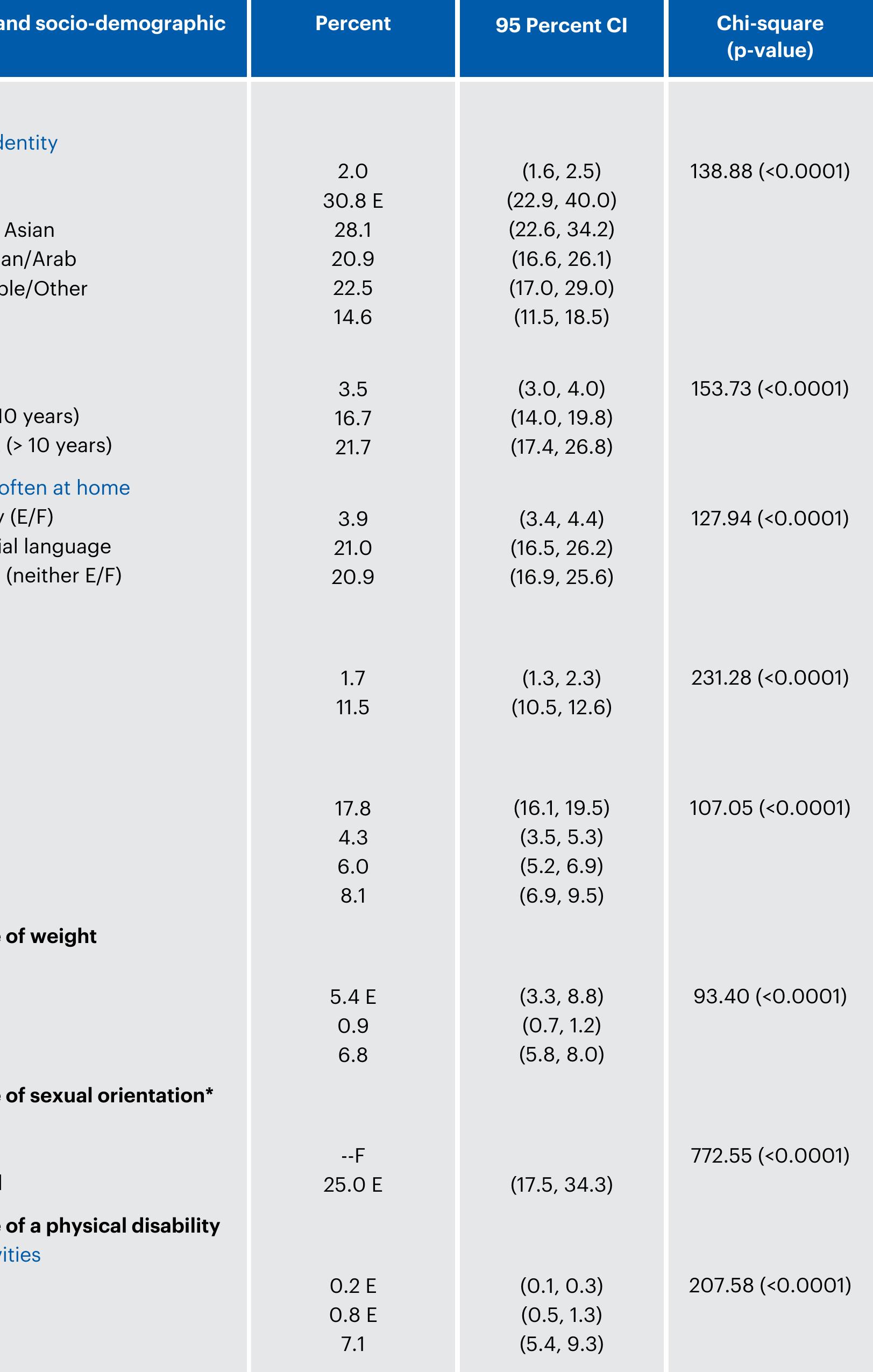 Discrimination impacts many areas of life including health, social and economic participation. To... more Discrimination impacts many areas of life including health, social and economic participation. To date, national research on discrimination in Canada is slim. The goal of this paper is to present data on everyday discrimination in Canada and explore its socio-demographic and health related predictors. The main source of data was the Canadian Community Health Survey, which in 2013 included a special module on everyday discrimination (EDS). The study variables included: geographic region, gender, age group, education, income, racialized/Indigenous status, immigration status, language spoken, sexual orientation, weight, and physical / mental disability status. Descriptive statistics were used to describe the characteristics of the sample and frequency of discrimination by EDS items and attributions. Bivariate analysis were used to examine associations between specific types of discrimination (for example, discrimination due on race) and study variables. Logistic regression analyses were conducted to examine the unadjusted and adjusted relationships between everyday discrimination and study variables. Results showed that the proportion of the Canadian population experiencing everyday discrimination was quite high (46.2%). The frequency of everyday discrimination was higher among population sub-groups on the grounds of their human rights classification. The significant predictors of experiencing everyday discrimination were: geography, gender, age group, racialized status, Indigenous status, non-immigrant status, education and income. The largest odds ratios of experiencing everyday discrimination was among youth and young adults (12-29 years) who experienced 4.49 times the odds of experiencing discrimination compared to seniors 70+ years. Understanding the prevalence and predictors of discrimination can help inform the development of health and social policies aimed at reducing population inequities.