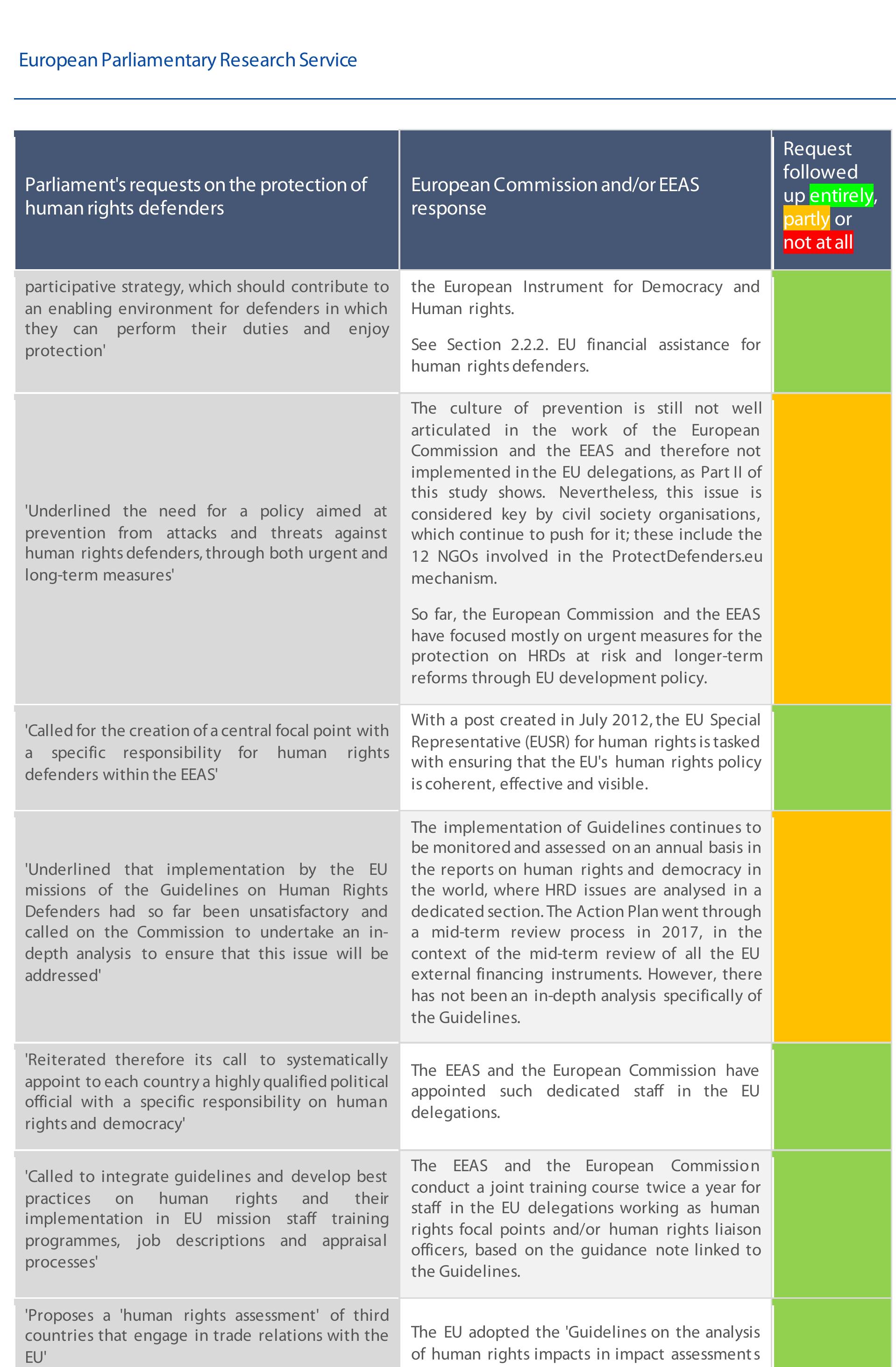 The first part of the study, written internally, provides an institutional perspective of the implementation of the Guidelines. It assesses the development of the EU framework to support human rights defenders, including EU Member States' emergency measures, and evaluates the coordination of such efforts. It also examines the European Parliament's support for human rights defenders and considers its impact on the EU's overall work on defender protection.