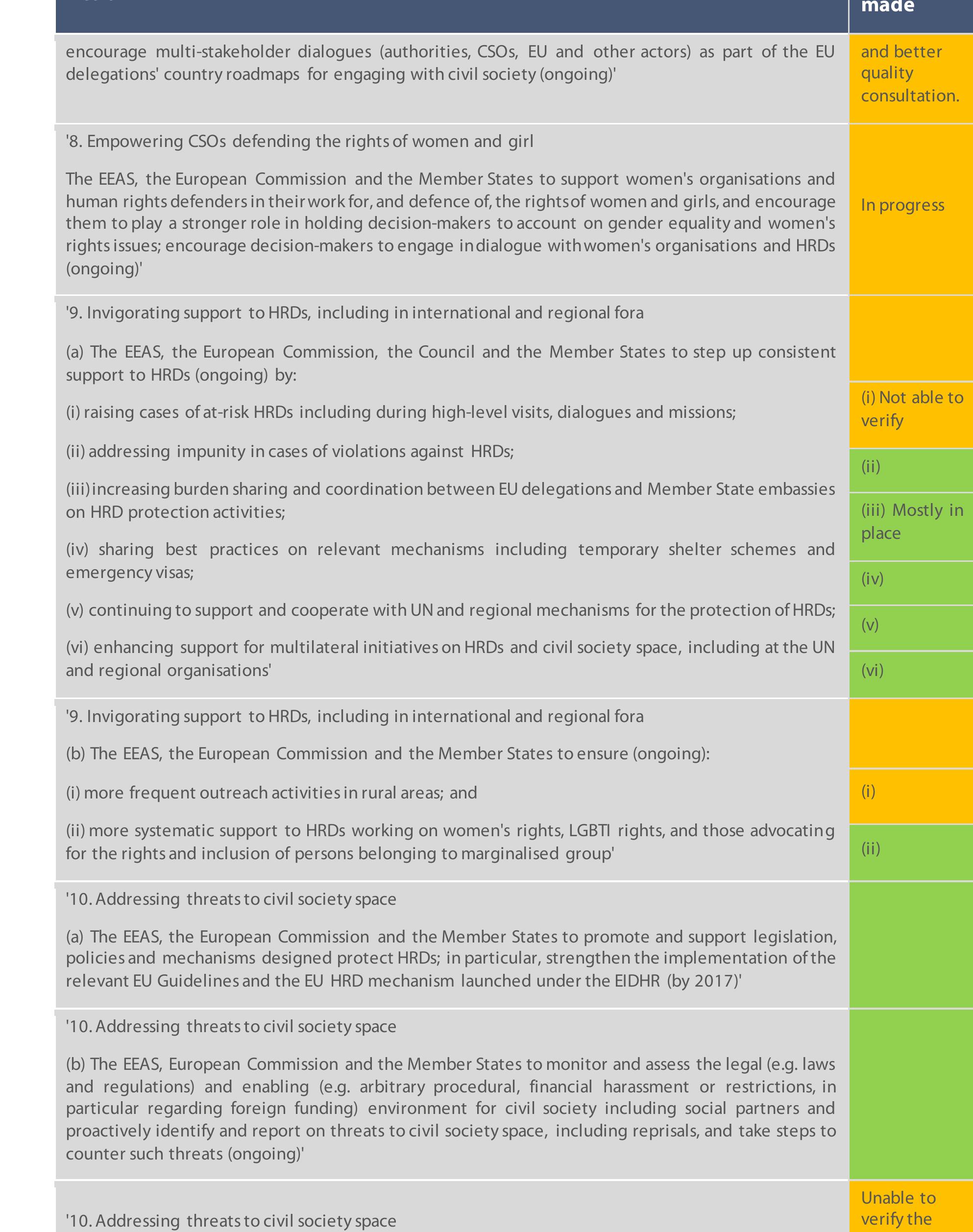 implementation of the Guidelines from a bottom-up perspective. It provides an evidence-based analysis of how EU missions apply the Guidelines in countries where rights and freedoms are particularly challenged for human rights defenders, and assesses when and why the measures have not been applied.