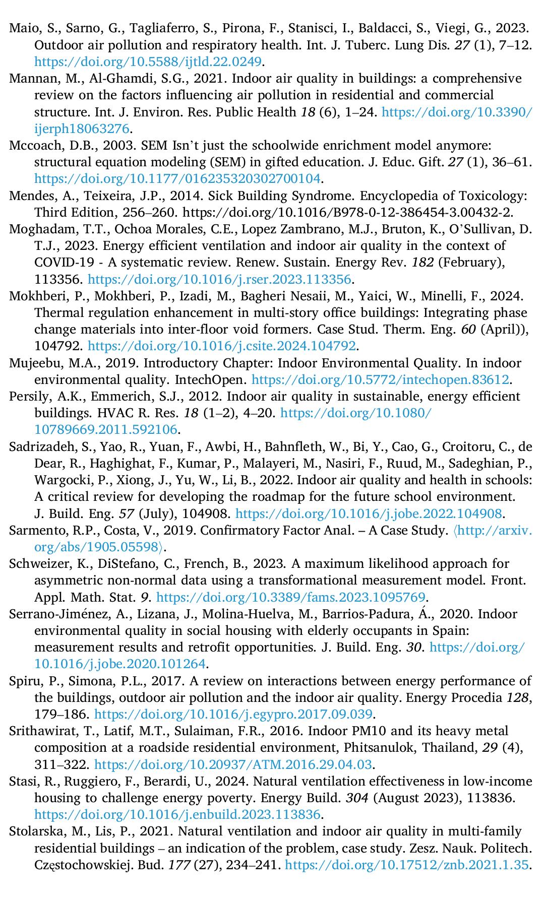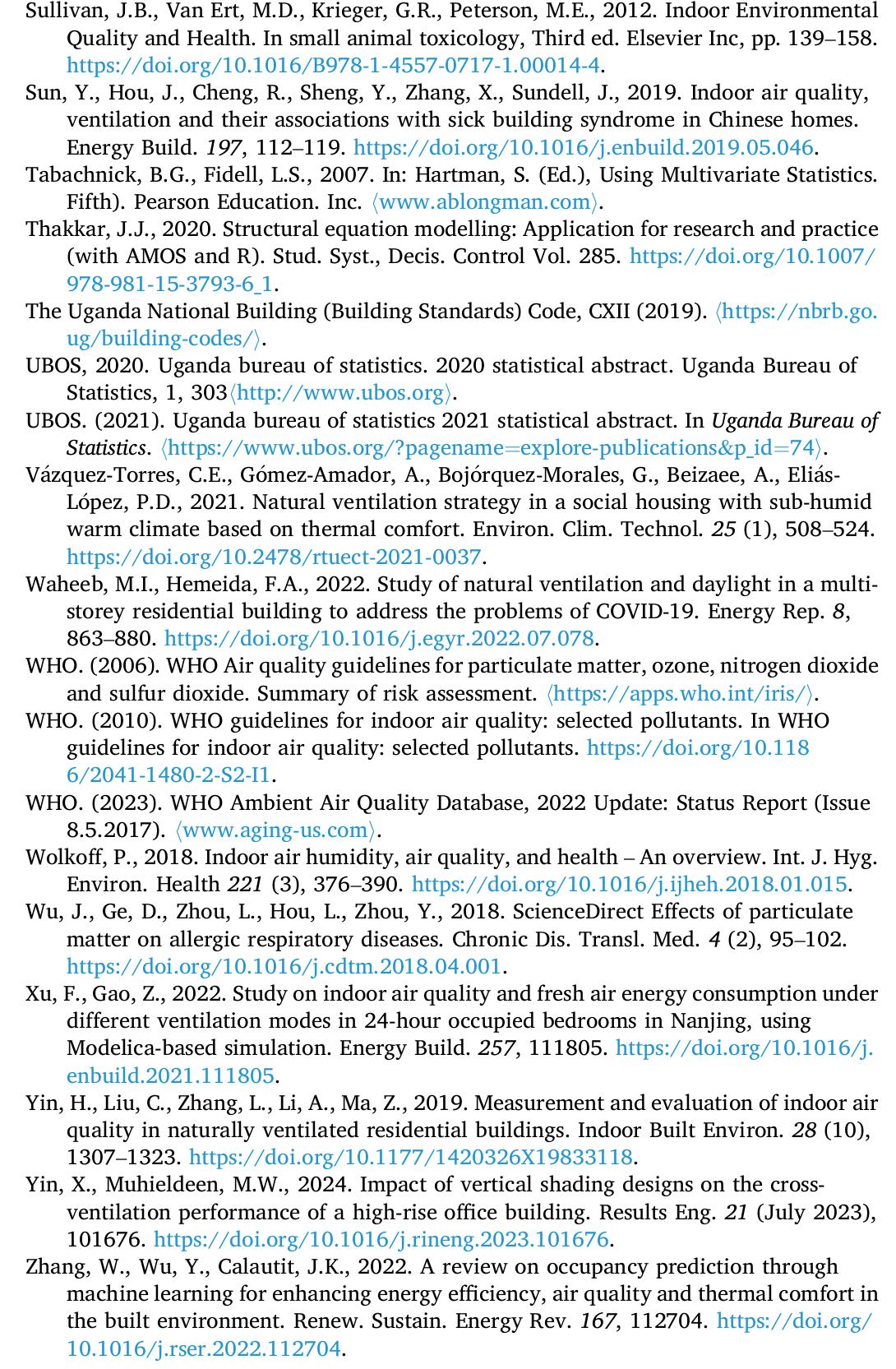 Ventilation is pivotal in mitigating indoor pollutants and ensuring comfortable Indoor Air Qualit... more Ventilation is pivotal in mitigating indoor pollutants and ensuring comfortable Indoor Air Quality (IAQ) levels globally. The outdoor environment and ventilation mechanisms significantly impact indoor air quality and occupant health. This research investigated the impact of natural ventilation (NV) and outdoor environment (OE) on indoor air quality (AQ) and occupant health (HI) in low-income housing in Kampala City, Uganda. The study followed a mixed methodology approach by employing self-administered questionnaires and statistical modeling using IBM® SPSS® Amos V24 to analyze the relationships between Natural Ventilation (NV), indoor Air Quality (AQ), Outdoor Environment (OE), and occupant health (HI). The research reveals a strong correlation (0.76) between NV and AQ. In contrast, correlations between AQ and OE (0.16) and NV and OE (0.08) are weak. Model comparative fit indices (CFI: 0.984, SRMR: 0.029, RMSEA: 0.053) indicate an excellent fit. Reliability is high with Cronbach's alpha (NV: 0.800, AQ: 0.862, OE: 0.782) and AVE values (NV: 0.832, AQ: 0.869, OE: 0.786). Significant positive relationships were found between NV and AQ and AQ and HI, highlighting the importance of natural ventilation in improving indoor air quality and occupant health. The study supports SDGs 3, 11, and 13, promoting sustainable building practices and promoting health, enhanced living conditions, and lower greenhouse gas emissions.
