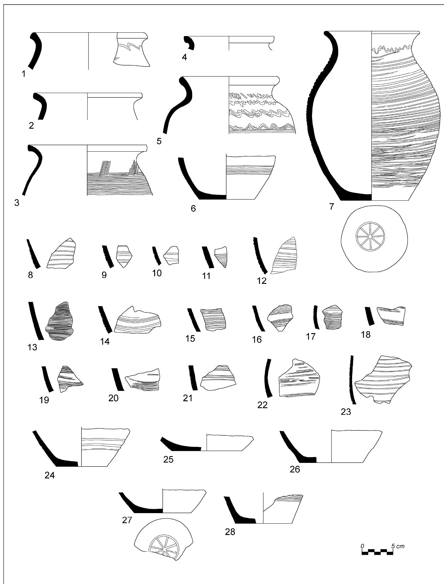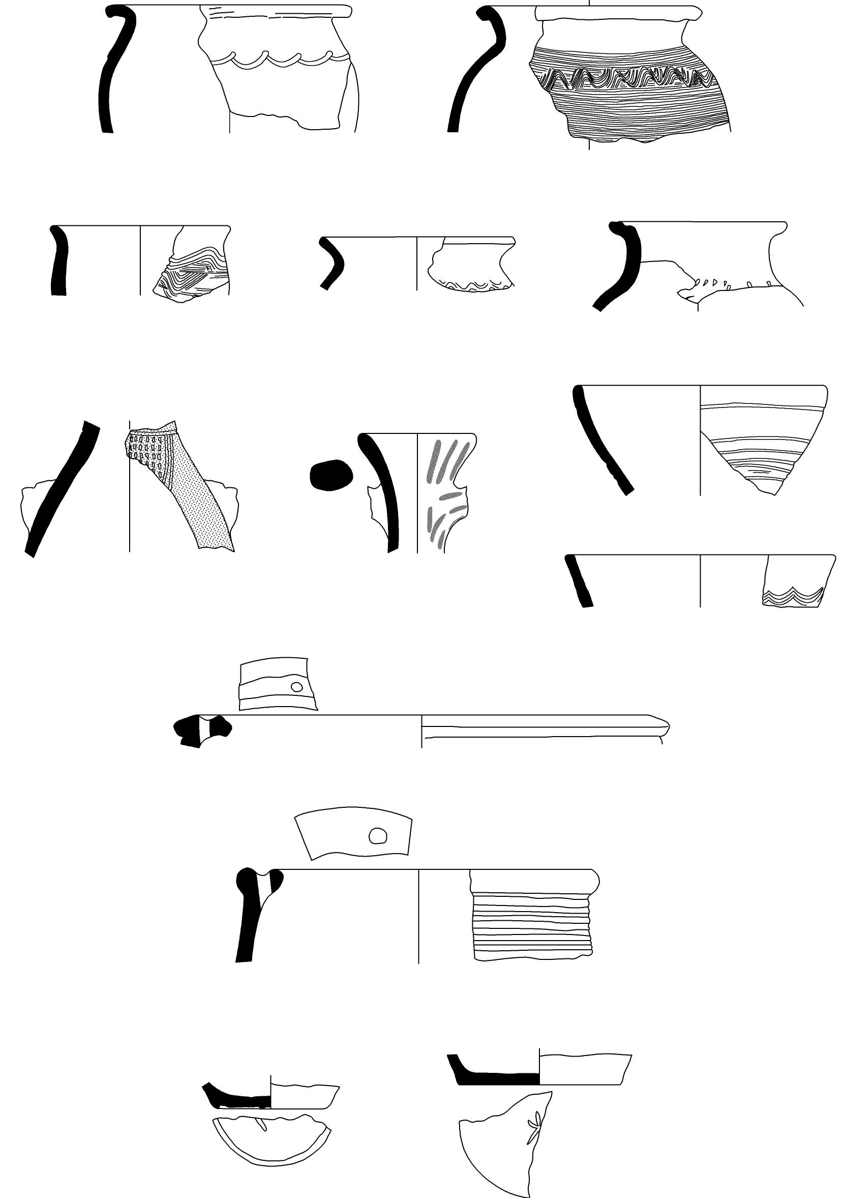 TG VI: Gray pottery (Fig. 10). This refers to the so called „burnished pottery“ but not all vessels of this group were decorated. That’s why the group is divided on the basis of the quality of the shards, respectively light gray poorly fired pottery (TSG VI/1) and dark gray to black well fired pottery (TSG VI/2). Most shards of the first subgroup are not burnished. This group was in use in all periods registered at the site.