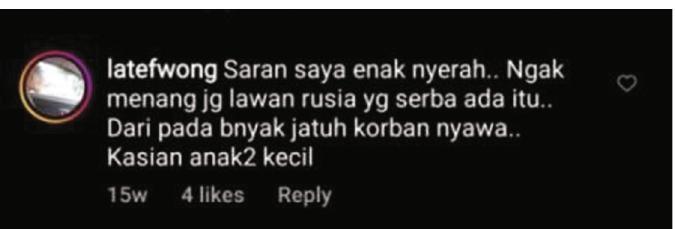 Russia began its military operation against Ukraine on February 24 th , 2022. This event has the ... more Russia began its military operation against Ukraine on February 24 th , 2022. This event has the attention of everyone worldwide, including the Indonesian people, who share their opinions on the Instagram platform. Therefore, the researcher is interested to know netizen comments and their relationship with politeness strategy. This study aims to investigate the politeness strategy employed by Indonesian online commenters in chosen news sites' Instagram accounts covering conflicts in Russia and Ukraine and find out about influences on politeness. This study applied the descriptive-qualitative research method. The data were taken from comments, and the source of data used multiple news sites' Instagram accounts, such as CNBC, CNN Indonesia, Detik.com, and Tempo.com. The documentation technique was chosen as the data collection technique. The study discovered all types of politeness strategies found in netizens' comments. Positive politeness appeared more frequently when the netizens commented on news sites' Instagram accounts. In addition, the researcher only found 2 (two) out of 4 (four) factors that affected politeness strategy: language styles, slang, and solidarity.