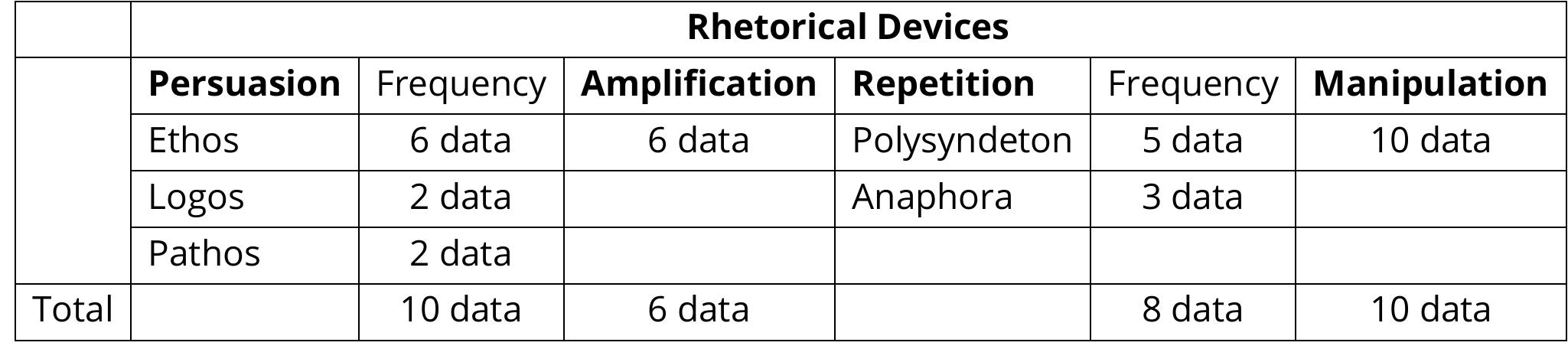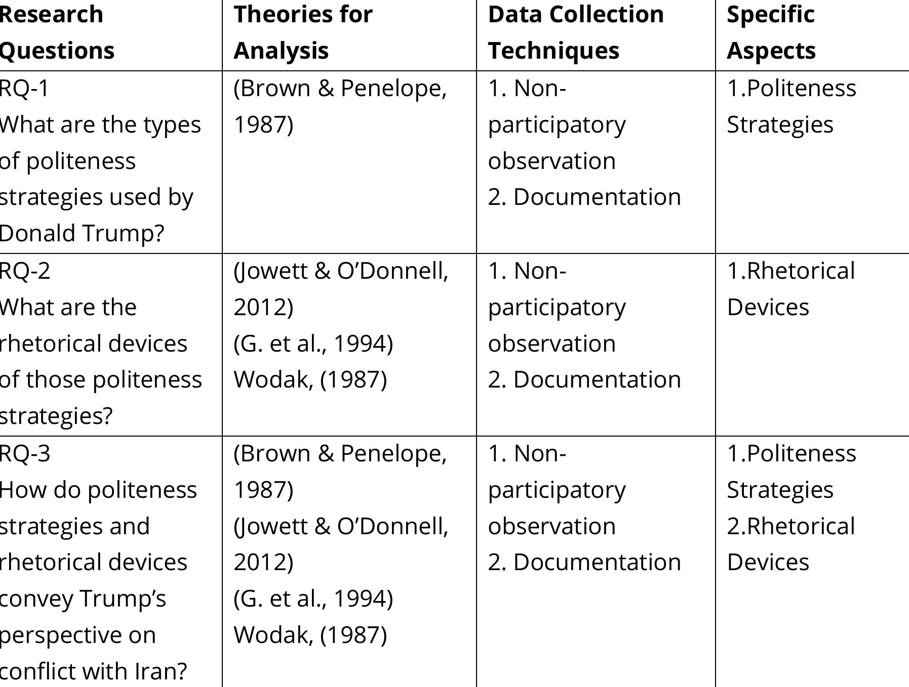 The research aims to figure out the use of politeness strategies and rhetorical devices used by T... more The research aims to figure out the use of politeness strategies and rhetorical devices used by Trump and attempt to reveal the behavior and purpose behind the speeches delivered by Donald Trump during the conflict with Iran taken by the videos in The White House channel on YouTube which are published on January 4th and 9th, 2020. This study employs a descriptive qualitative method by involving the theories by (Brown & Levinson, 1987), (Jowett & O’Donnell, 2012), (G., Preminger, & Brogan, 1994), and Wodak (1987). This study found that Donald Trump mostly uses positive politeness to attend his audience’s attraction to reach his goals and based on the data of the occurance of rhetorical devices, Donald Trump mostly uses Ethos in persuasion which means he frequently shows his good characteristic to reveal people’s trust and followed by using manipulation in each of his in order to manipulate people for achieving his purposes.
