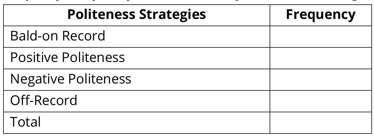 In interaction, there are situations where someone‟s face is likely to be threatened. Utterances ... more In interaction, there are situations where someone‟s face is likely to be threatened. Utterances that disrupt the balance of face maintenance are called Face Threatening Acts (FTAs). The research is based on Pragmatics study. The aims of the research are to give an overview of the politeness principles, to describe and to explain the types and functions of Face Threatening Act uses in relation with politeness in the conversation by the characters in Princess Diaries 1 and Princess Diaries 2: The Royal Engagement movies. The oral utterances that appear in the movie are analyzed and interpreted descriptively based on Brown and Levinson‟s Face Threatening Acts theory. This research employs descriptive qualitative method. The data are taken from the dialogs in the film entitled Princess Diaries 1 and Princess Diaries 2: The Royal Engagement movies, that contain FTA that used by characters. To collect the data, the researcher uses some steps; collecting the conversation of all the charac...