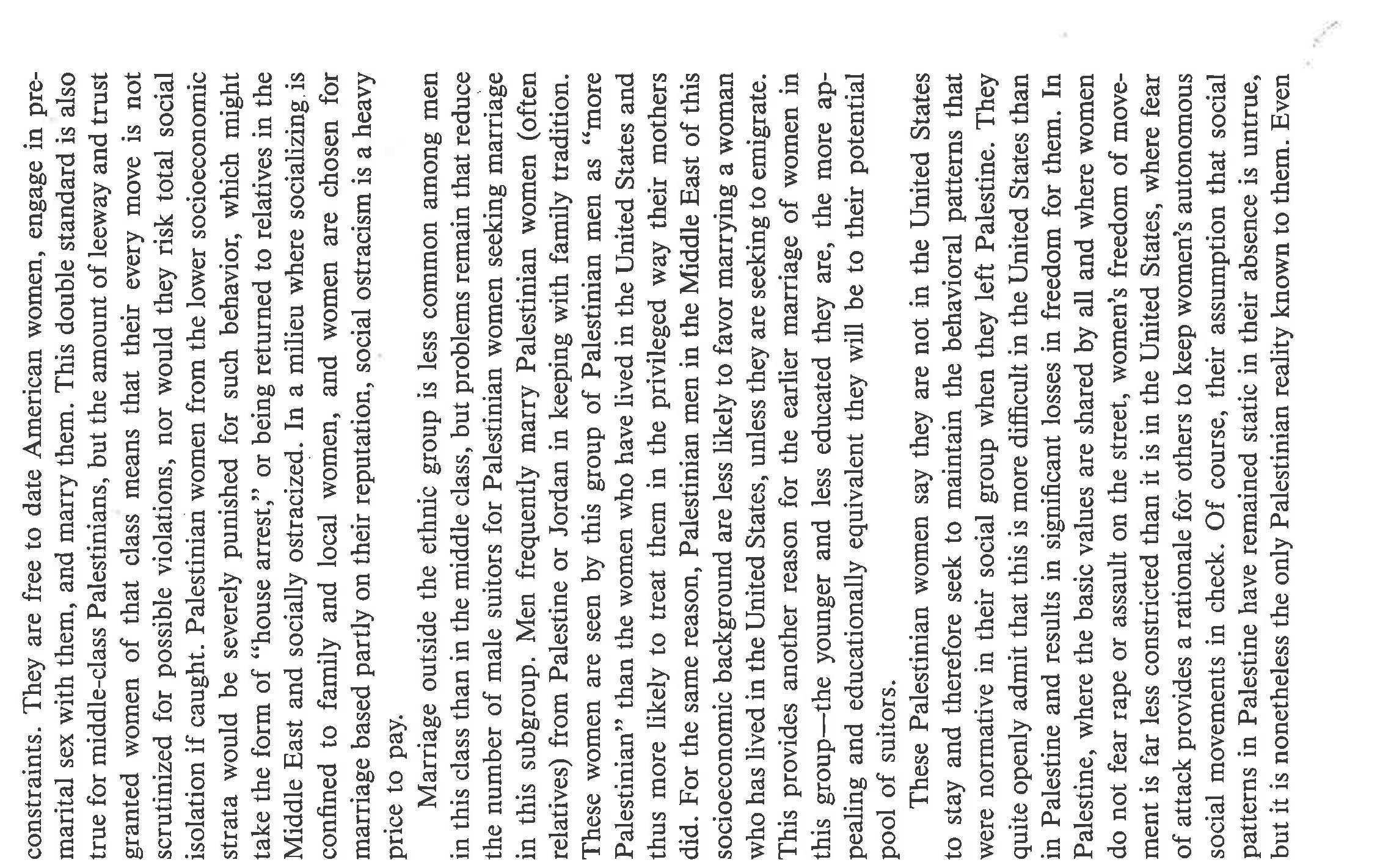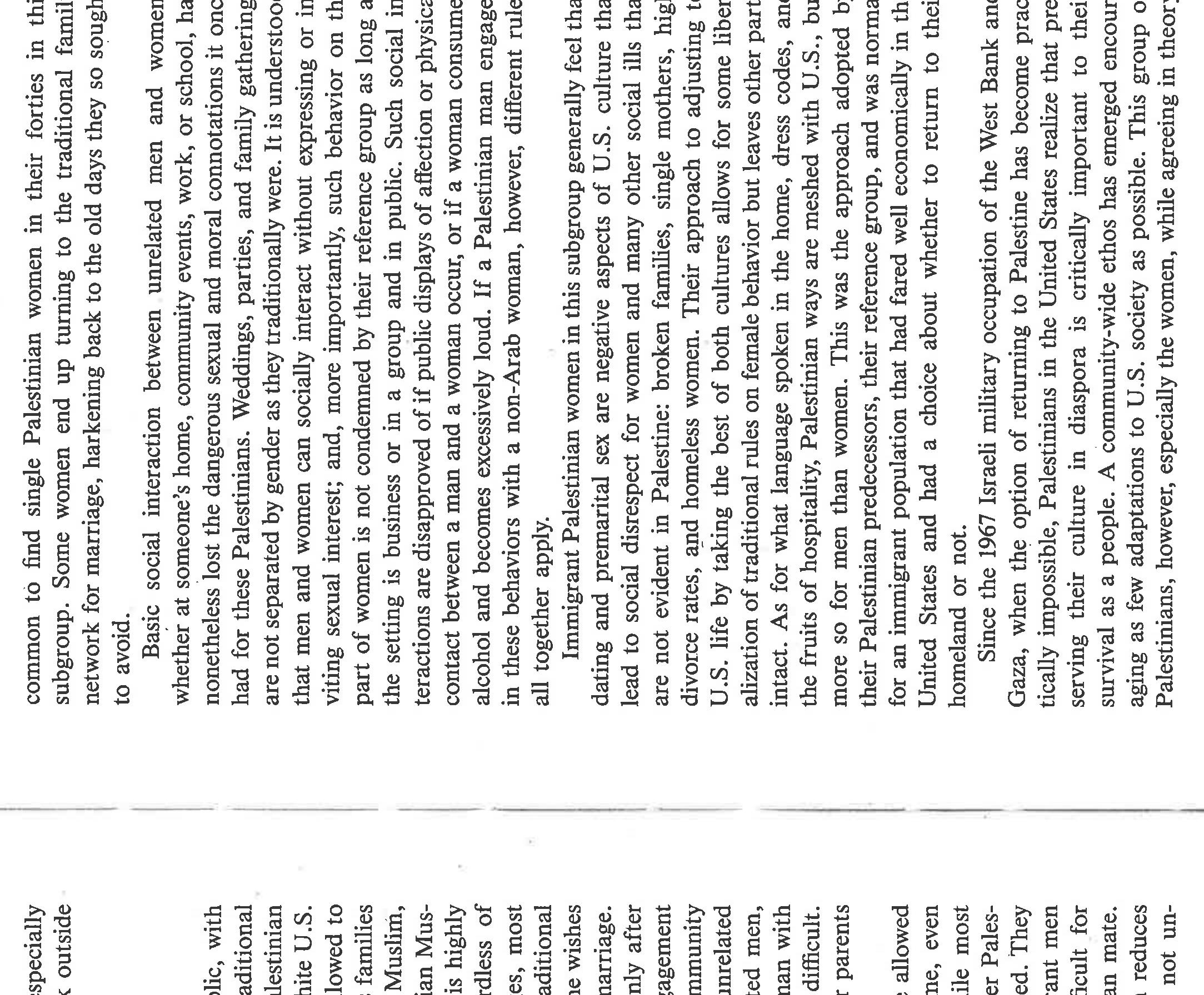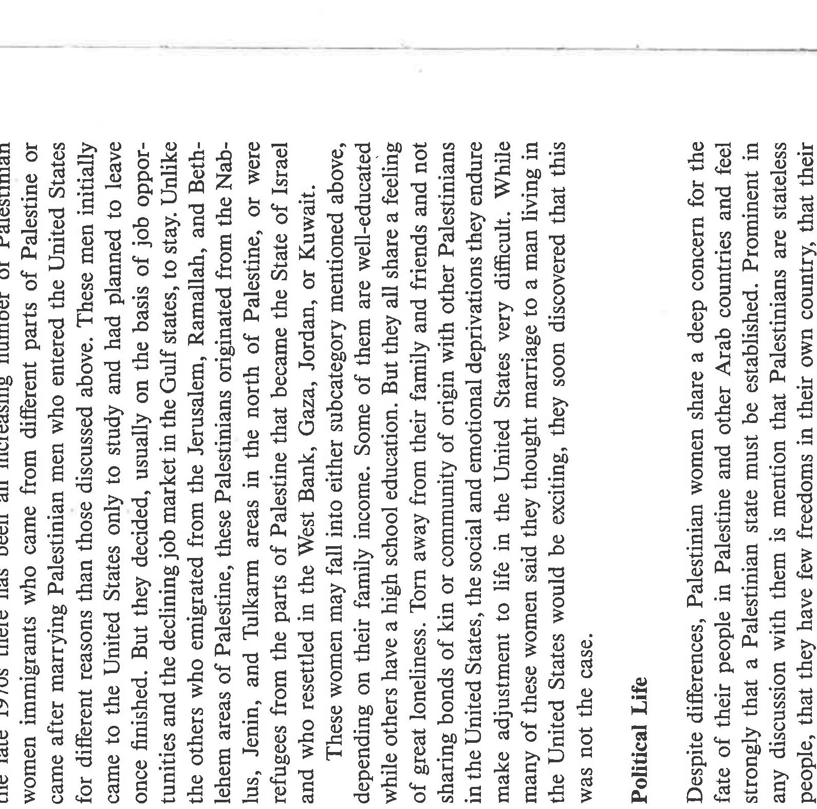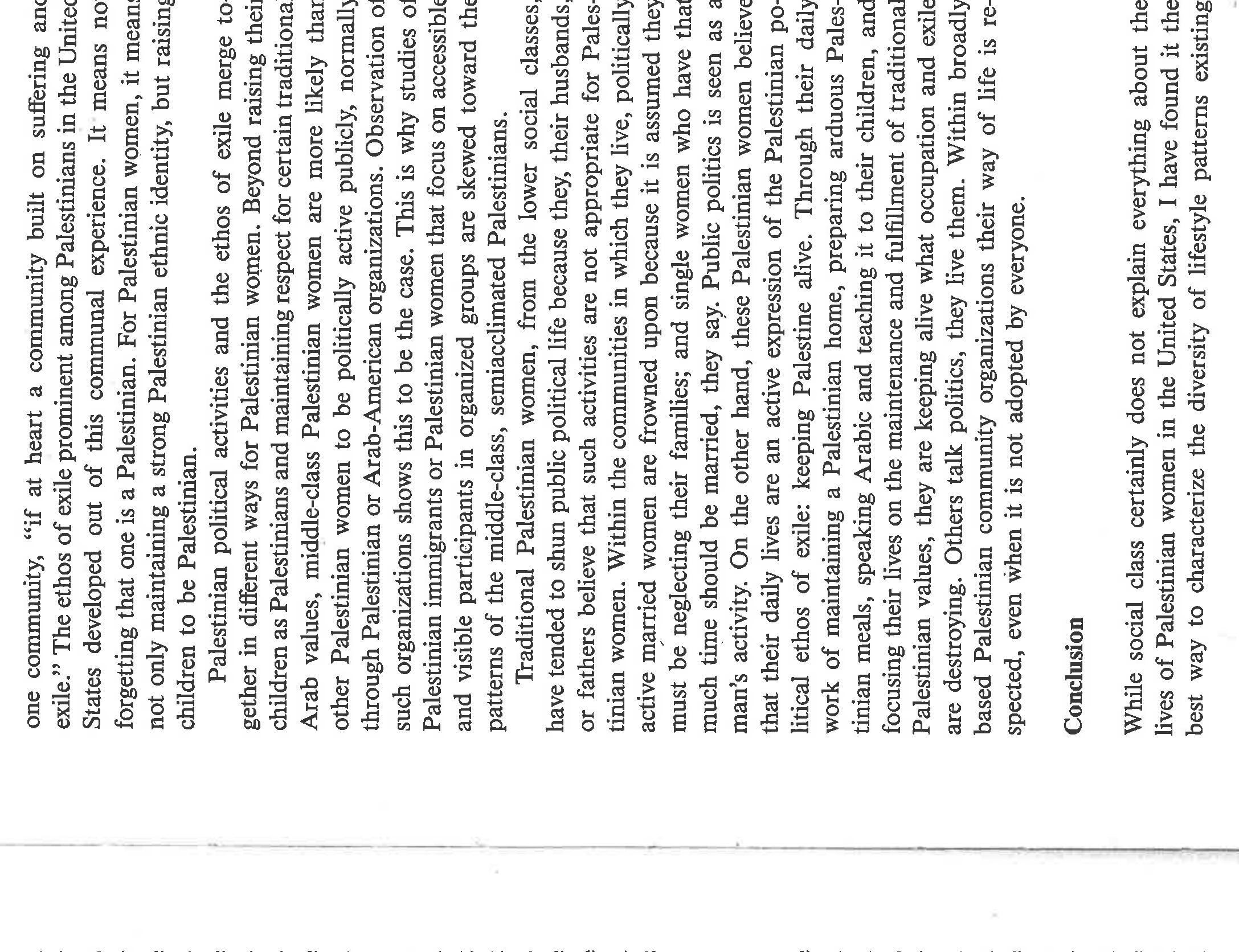 The paper highlights the ways in which gender and politics [Palestinian statelessness; US support... more The paper highlights the ways in which gender and politics [Palestinian statelessness; US support for Zionism and deprecation of Palestinians] intersect among Palestinians in Chicago. Based on life history interviews with Palestinian women, it narrates the primary ways in which these women chose to evaluate their lives as women. They compare them to their mothers, to Palestinian men, to American women, and to people who have a country. Overall, they see that they have more power than their mothers and less than Palestinian men. They feel there was less gender inequality in Palestine because both men and women had social expectations placed upon their behavior; not so in the US. They see positives and negatives for US women, would not trade places with them, and detest the stereotypes of Arab women existing in US culture. Finally, they speak eloquently about how statelessness and violence impacts their daily lives, even while living in the US, and about the tentativeness of their lives in exile. If I wrote this paper today, I'd frame it differently, using notions of race, empire, intersectionality, and transnationalism. Yet the substance of the women's narratives remains the same.