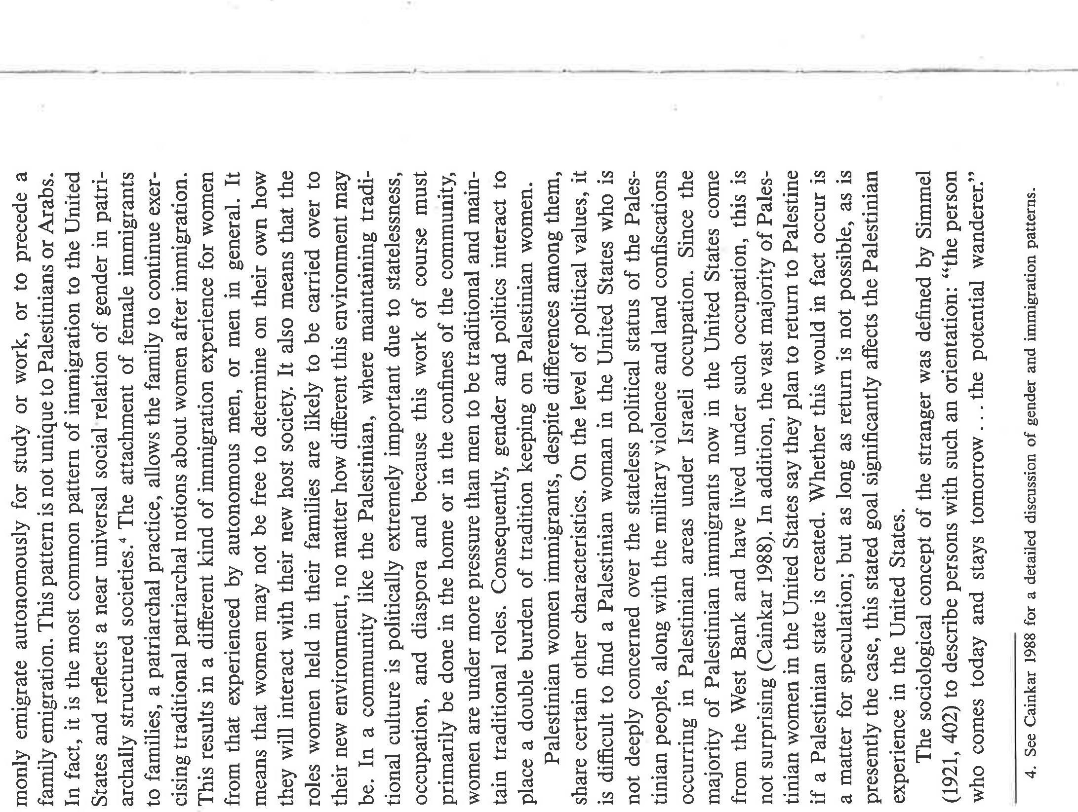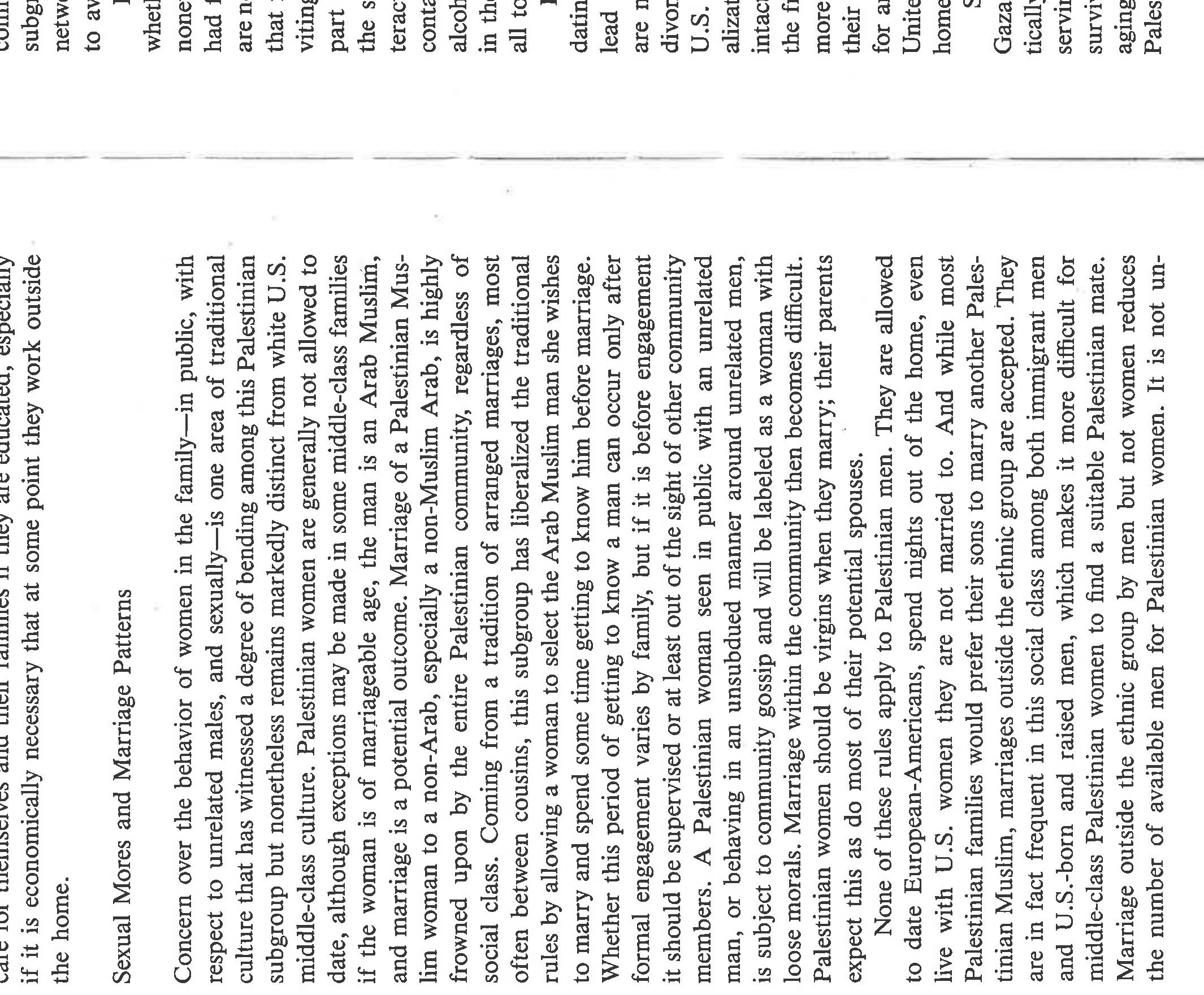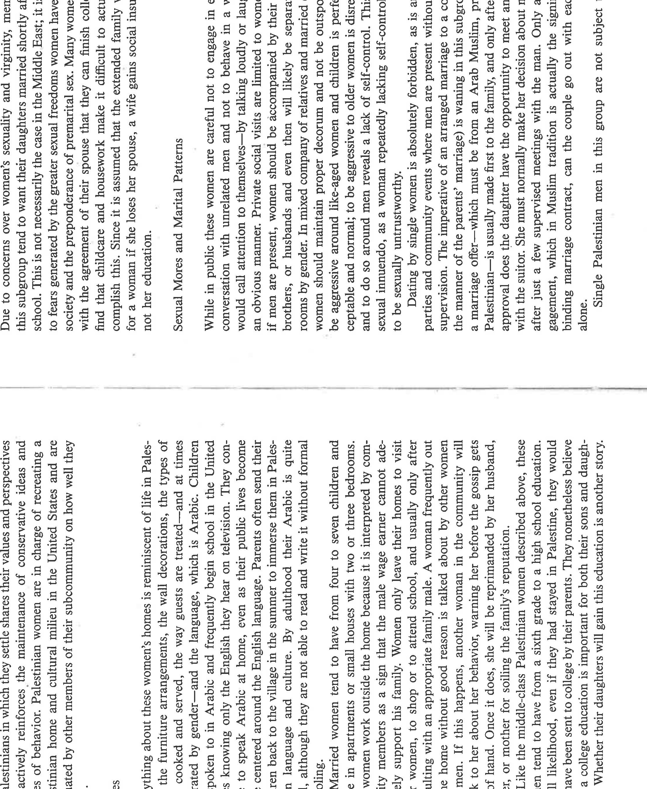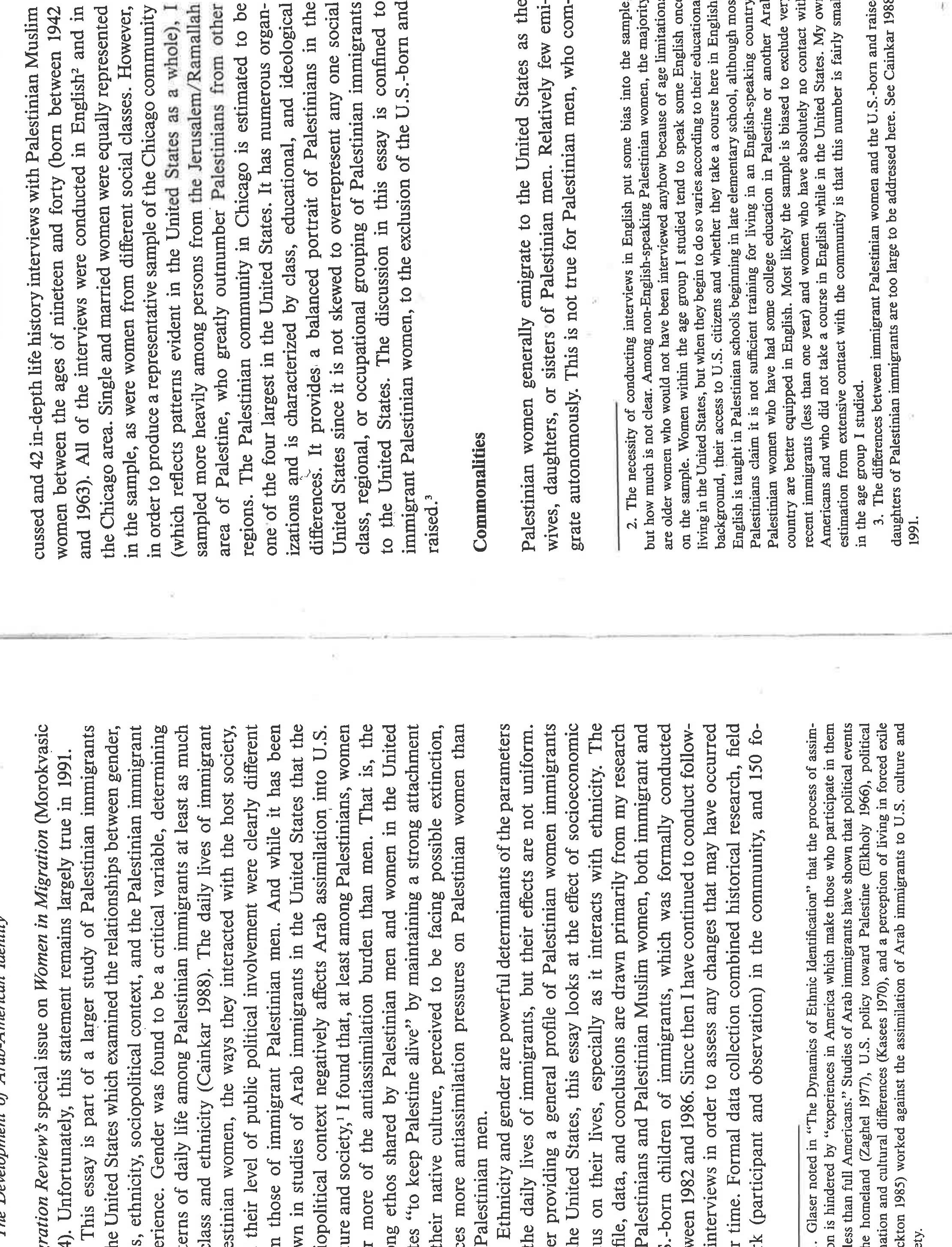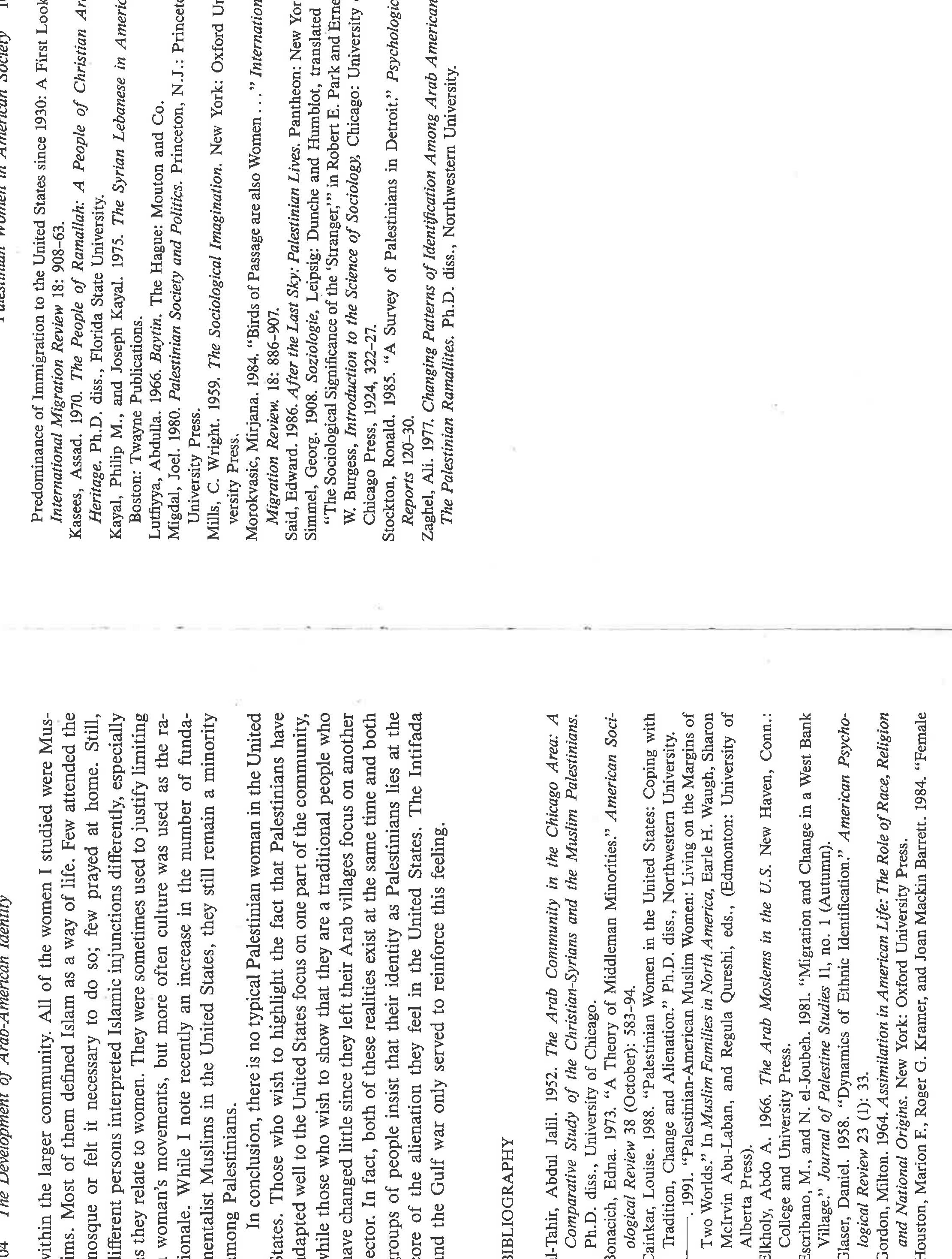 The paper highlights the ways in which gender and politics [Palestinian statelessness; US support... more The paper highlights the ways in which gender and politics [Palestinian statelessness; US support for Zionism and deprecation of Palestinians] intersect among Palestinians in Chicago. Based on life history interviews with Palestinian women, it narrates the primary ways in which these women chose to evaluate their lives as women. They compare them to their mothers, to Palestinian men, to American women, and to people who have a country. Overall, they see that they have more power than their mothers and less than Palestinian men. They feel there was less gender inequality in Palestine because both men and women had social expectations placed upon their behavior; not so in the US. They see positives and negatives for US women, would not trade places with them, and detest the stereotypes of Arab women existing in US culture. Finally, they speak eloquently about how statelessness and violence impacts their daily lives, even while living in the US, and about the tentativeness of their lives in exile. If I wrote this paper today, I'd frame it differently, using notions of race, empire, intersectionality, and transnationalism. Yet the substance of the women's narratives remains the same.