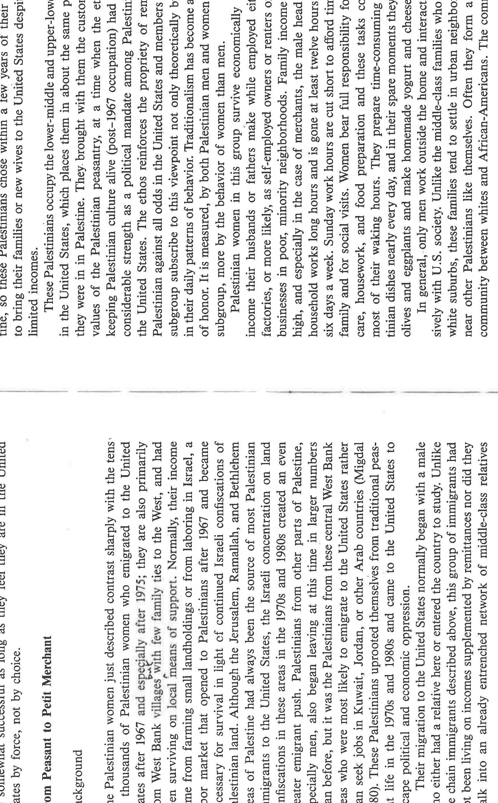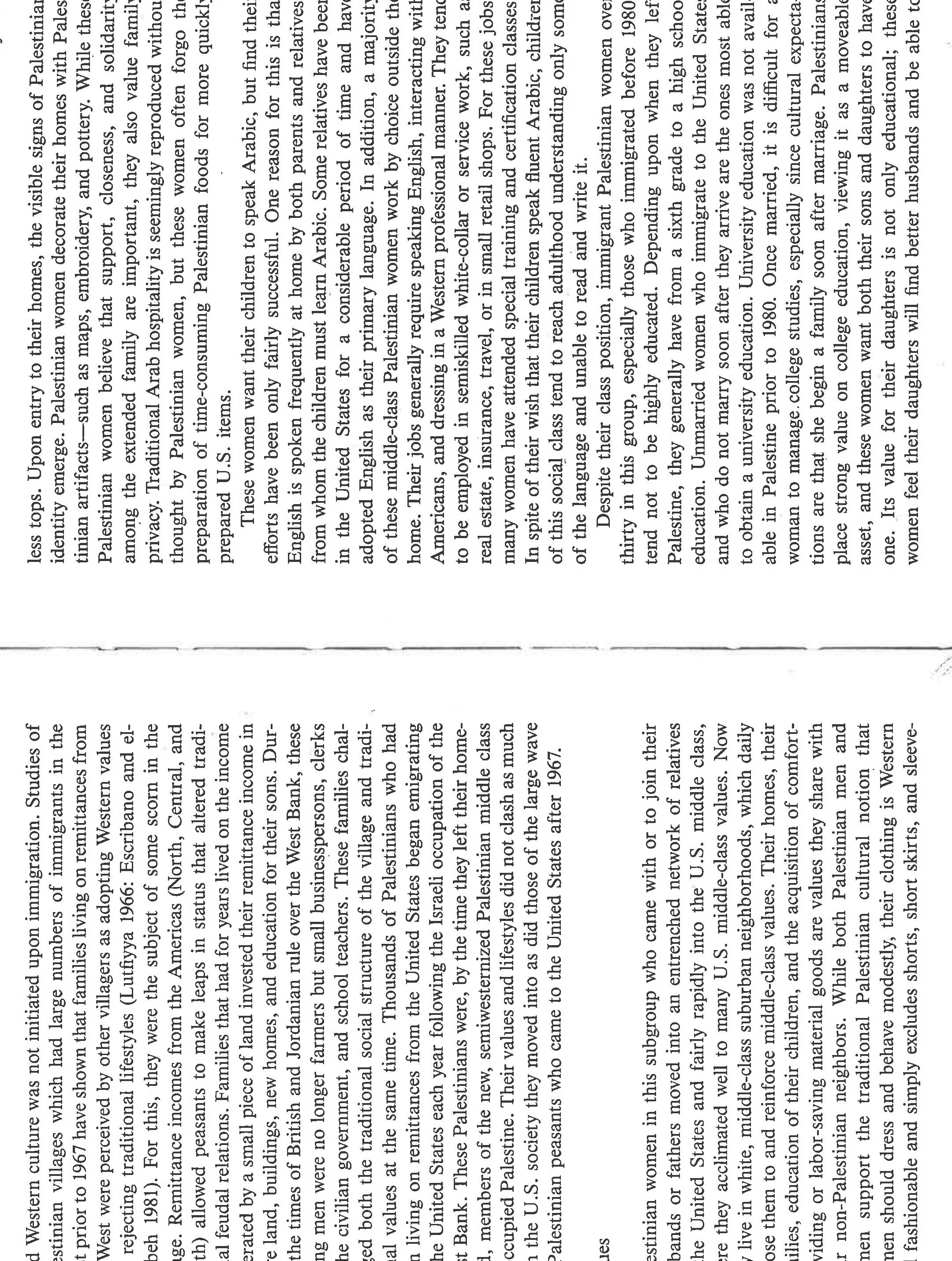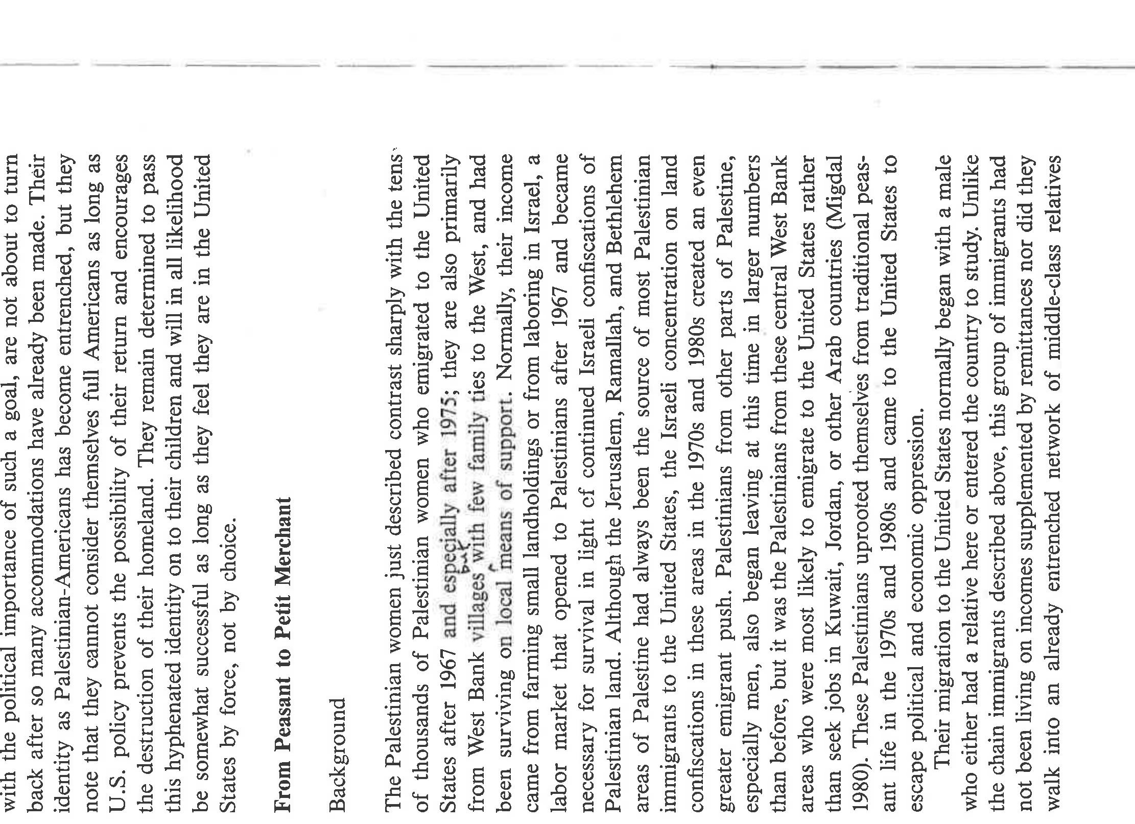 An ethnographically-based social class analysis of Palestinian women living in the US in the 1980... more An ethnographically-based social class analysis of Palestinian women living in the US in the 1980's, especially in how they enact womanhood and Palestinianness in a US society generally hostile to their narrative and aspirations. Also notes variations in migration patterns and gendered differences. This paper was written prior to the scholarly rise of notions of racialization, transnationalism, and intersectionality, and in the nascence of post-colonial studies, yet one can easily see how these analytics would apply. It also glimpses an emerging Islamic revival, using the word "fundamentalist" [a word I wish I could change]. The ethnographic detail is sound; the writing is a product of its time.