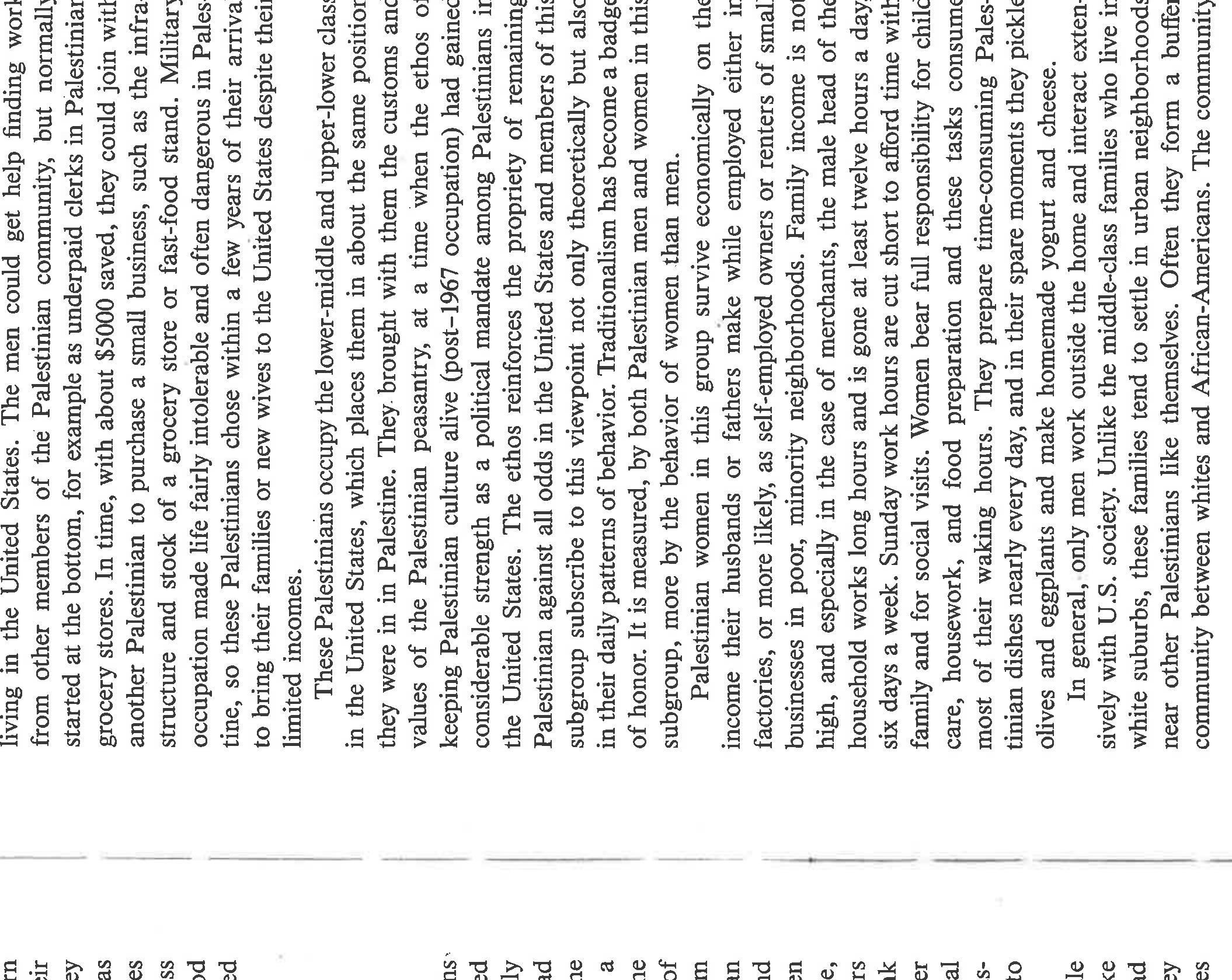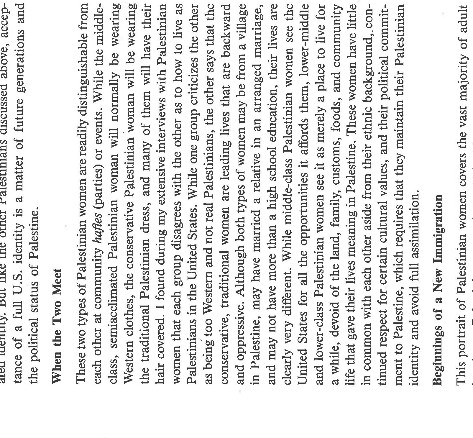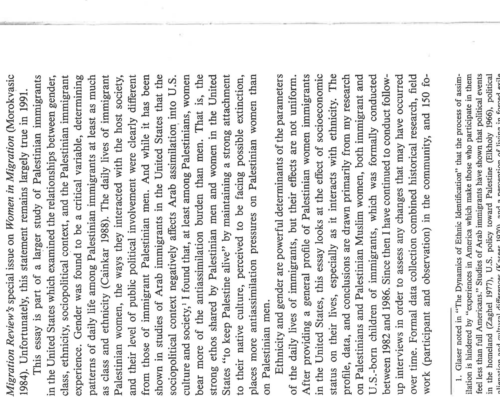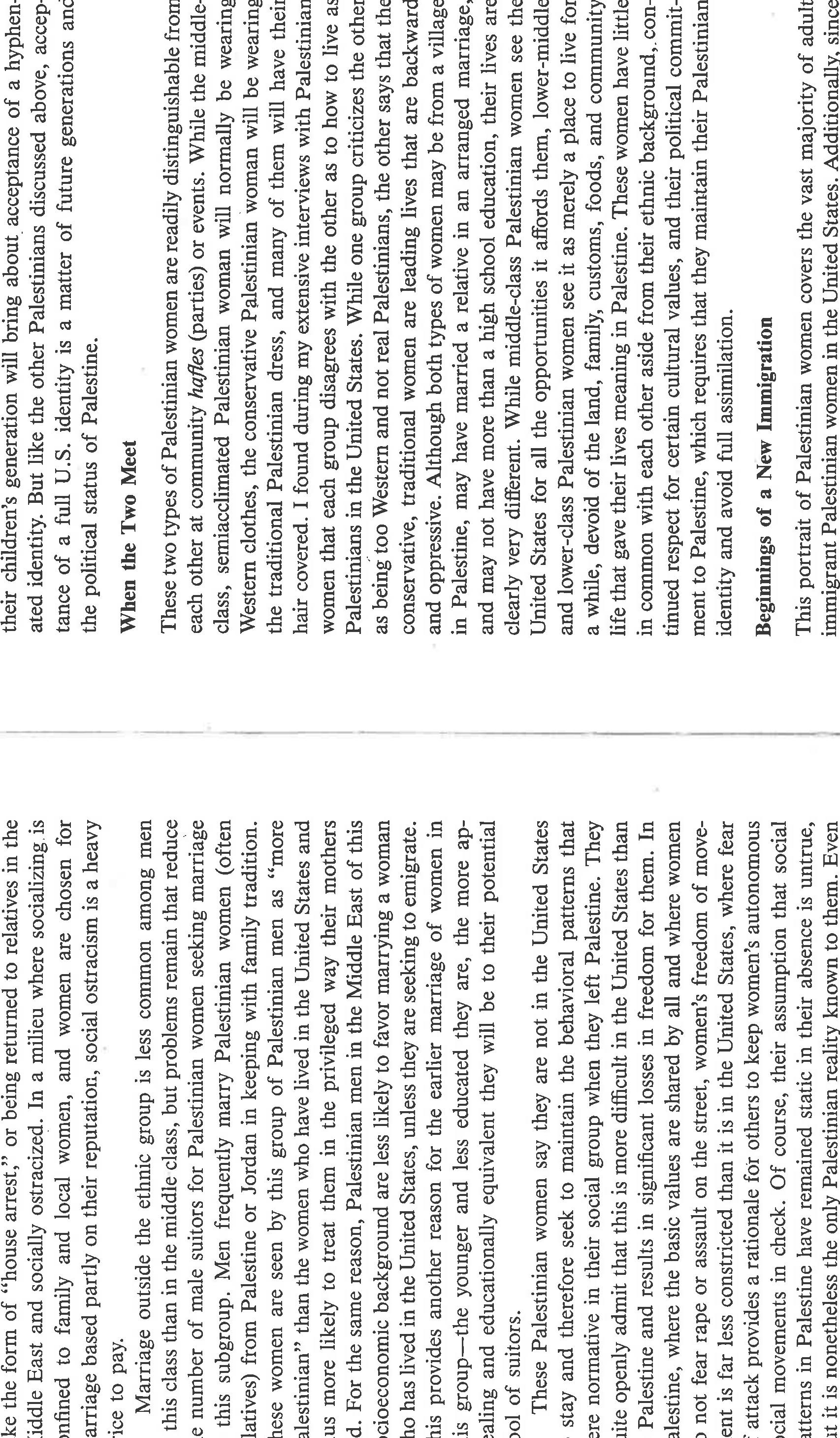 An ethnographically-based social class analysis of Palestinian women living in the US in the 1980... more An ethnographically-based social class analysis of Palestinian women living in the US in the 1980's, especially in how they enact womanhood and Palestinianness in a US society generally hostile to their narrative and aspirations. Also notes variations in migration patterns and gendered differences. This paper was written prior to the scholarly rise of notions of racialization, transnationalism, and intersectionality, and in the nascence of post-colonial studies, yet one can easily see how these analytics would apply. It also glimpses an emerging Islamic revival, using the word "fundamentalist" [a word I wish I could change]. The ethnographic detail is sound; the writing is a product of its time.
