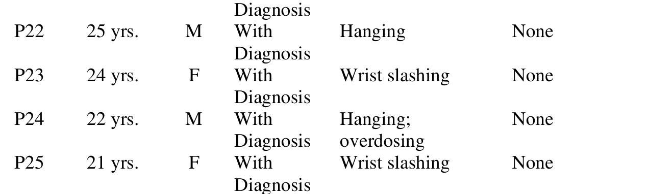 Suicide is now the second leading cause of death among the 15- to 29-year-old age group (WHO in: ... more Suicide is now the second leading cause of death among the 15- to 29-year-old age group (WHO in: Preventing suicide: a global imperative, executive summary, World Health Organization, Geneva, 2014. Retrieved from www.who.int/mental_health/suicideprevention/exe_summary_english.pdf). Current research supports the observation that suicidality is a critical concern among lesbian, gay, bisexual, and transgender populations, who may be at greater risk than their heterosexual peers. Phenomenological methods were used to study the dynamics of lesbian women and gay men suicidality in the Philippines. A selection of five self-identified gay men and four self-identified lesbian women met the inclusion criteria of the study and, individually, went through an in depth interview, consisting of two parts, namely the robotfoto and the semi-structured interview. Analyses went through reduction, description, and finding the essence. Three distinct but interrelated themes surfaced: effervescing dilemma, pressurizing turmoil, and fizzling explosion. These themes suggest that Filipino lesbian women and gay men may suffer from internalized stigma and heaving emotional turmoil, which contribute to suicidal ideation and self-injurious behaviors. Difficult life events may trigger an explosion of pent-up negative emotions, culminating in attempted suicide.