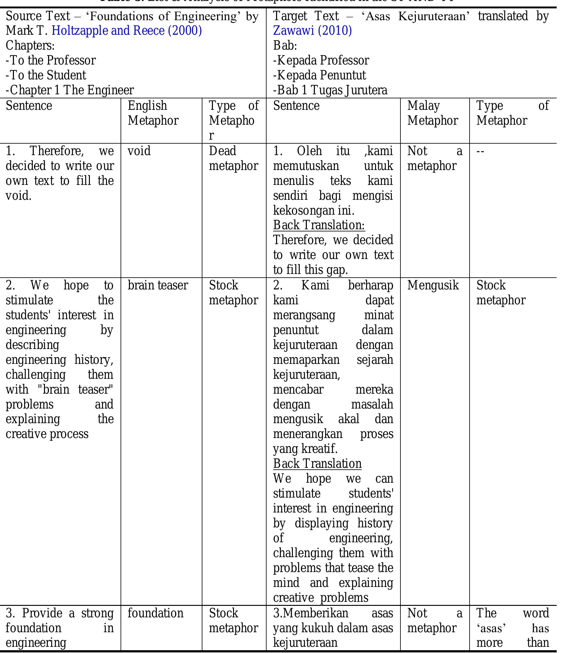 Effective and skilful translation of technical texts is not easy to achieve. A translator of tech... more Effective and skilful translation of technical texts is not easy to achieve. A translator of technical texts often has to manage the selection of appropriate equivalents such as words, terms, styles, descriptions, proper exposition, discussion and presentation of the scientific concepts and ideas in the target language. This paper is a preliminary study that investigates the extent to which metaphors are used in the translation of English to Malay technical texts the study highlights particular challenges in translating technical texts from English to Malay with the focus on the use and translation of metaphors. Metaphor is significant as it opens alternatives for both translators and authors to present the required information to be in a manner that is more reader-friendly. The discussion of this paper not only centres on metaphors playing an important role in the explanation of scientific and technical concepts but also investigates the extent to which metaphors are used in the translation of English to Malay technical texts. The discussion will look into the hypothesis on how the usage of metaphors in the ST (source text) compares to that in the TT (target text). The analysis will indicate the main ways in which metaphorical expressions are rendered from English to Malay.