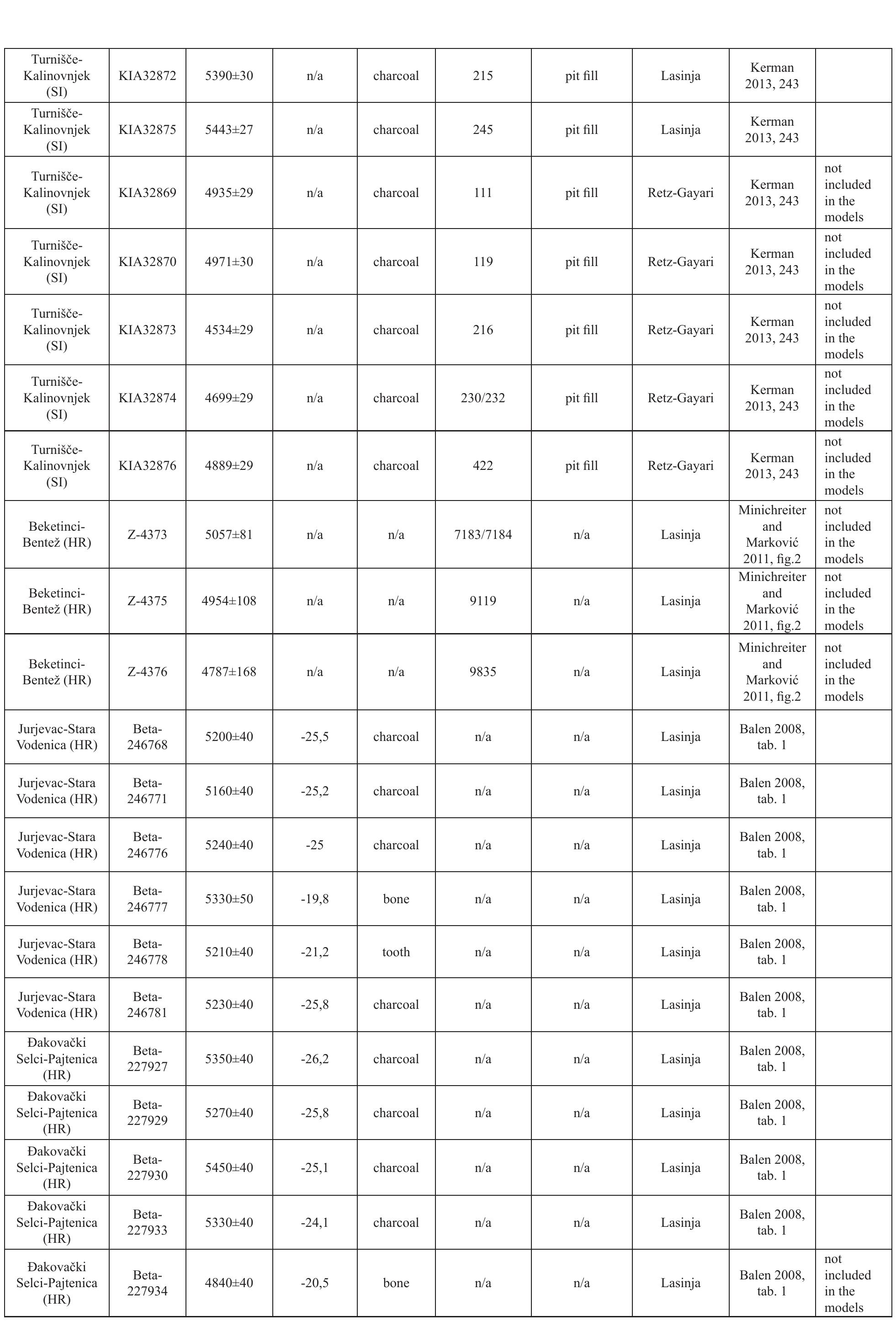 In the paper, Bayesian analysis of 14C dates implemented in the OxCal program is used to develop ... more In the paper, Bayesian analysis of 14C dates implemented in the OxCal program is used to develop calendric time-scale chronologies of individual sites and archaeological cultures of the 5th millennium calBC in Slovenia and Croatia. Case studies are presented in which 14C dates are analysed and reinterpreted with the aid of contextual archaeological data. At the site level, stratigraphic sequences are used in models to constrain and then precisely date activities within them. At the regional level, the results of the chronological modelling of archaeological cultures are used to present them on a calendric time-scale and within a broader spatial framework of Central and Southeastern Europe. Special emphasis is placed upon critical comparison of modelled calendar and cultural sequences. On the basis of this comparison, some inconsistencies and contradictions in the relative chronological schemes of periods and archaeological cultures are presented.