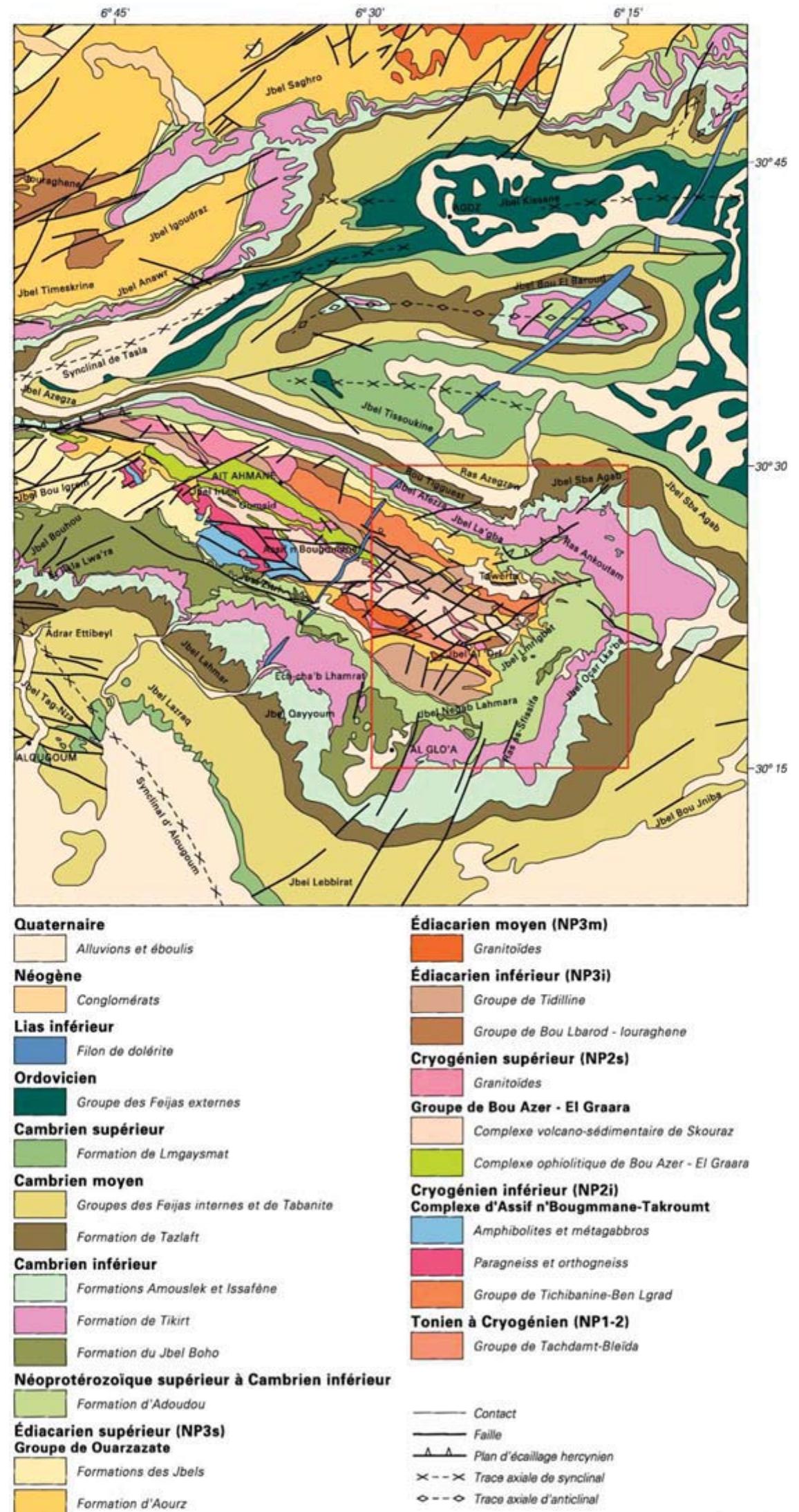 The Tifnoute valley Cu-Mo±Au mineral occurrences are located NW of Siroua massif in the central M... more The Tifnoute valley Cu-Mo±Au mineral occurrences are located NW of Siroua massif in the central Moroccan Anti-Atlas. This mineralization appears to be associated to the Imourkhssan granite and the Asskaoun granodiorite dated respectively 561 ± 3 and 558 ± 2 Ma. These highly potassic granitoids show an arc signature and are in-placed in an extensional tectonic setting typical of the post-collision Late Pan-African period. In places, these rocks are strongly to slightly affected by hydrothermal alterations of phyllic, propylitic and argillic types with development of a pyritic facies around the Imourkhssan granite. The mineralization can be divided into two types: A molybdenite mineralization and some sulphides spatially linked to the Imourkhssan granite. It is disseminated in the granite or appears in lamellar or pluri-millimetric fragments. It also occurs as spots and nets along chloritized fractures planes oriented NNE-SSW and dipping 40 to 60 SE. The paragenesis consists of molybdenite, pyrite, chalcopyrite and sphalerite. Talat N'Lbnour Cu-Au mineralization linked to NS fractures affecting Askaoun granodiorite. The vein is about 0.5 to 2 m thick that extends about 400 m. The mineralized fractures are filled essentially with quartz, siderite and chlorite. Metallographic study reveals a diverse paragenesis that consists of pyrite, chalcopyrite, gold, bornite and chalcocite. The secondary paragenesis consists of chalcopyrite, covellite, bornite, malachite, azurite and hematite. These features of these mineralizations are discussed in the context of an arc-type Cu-Mo±Au porphyry mineralization.