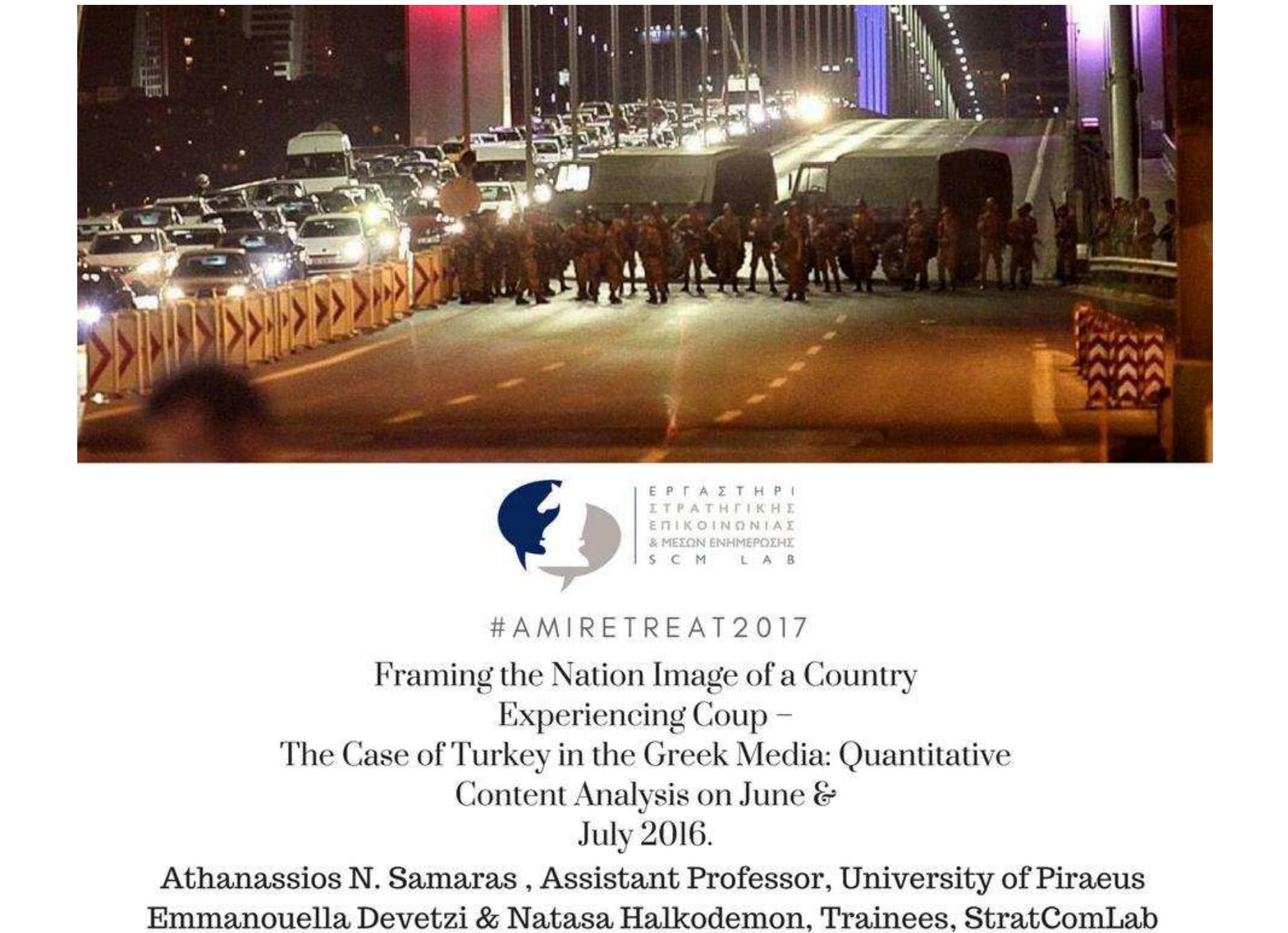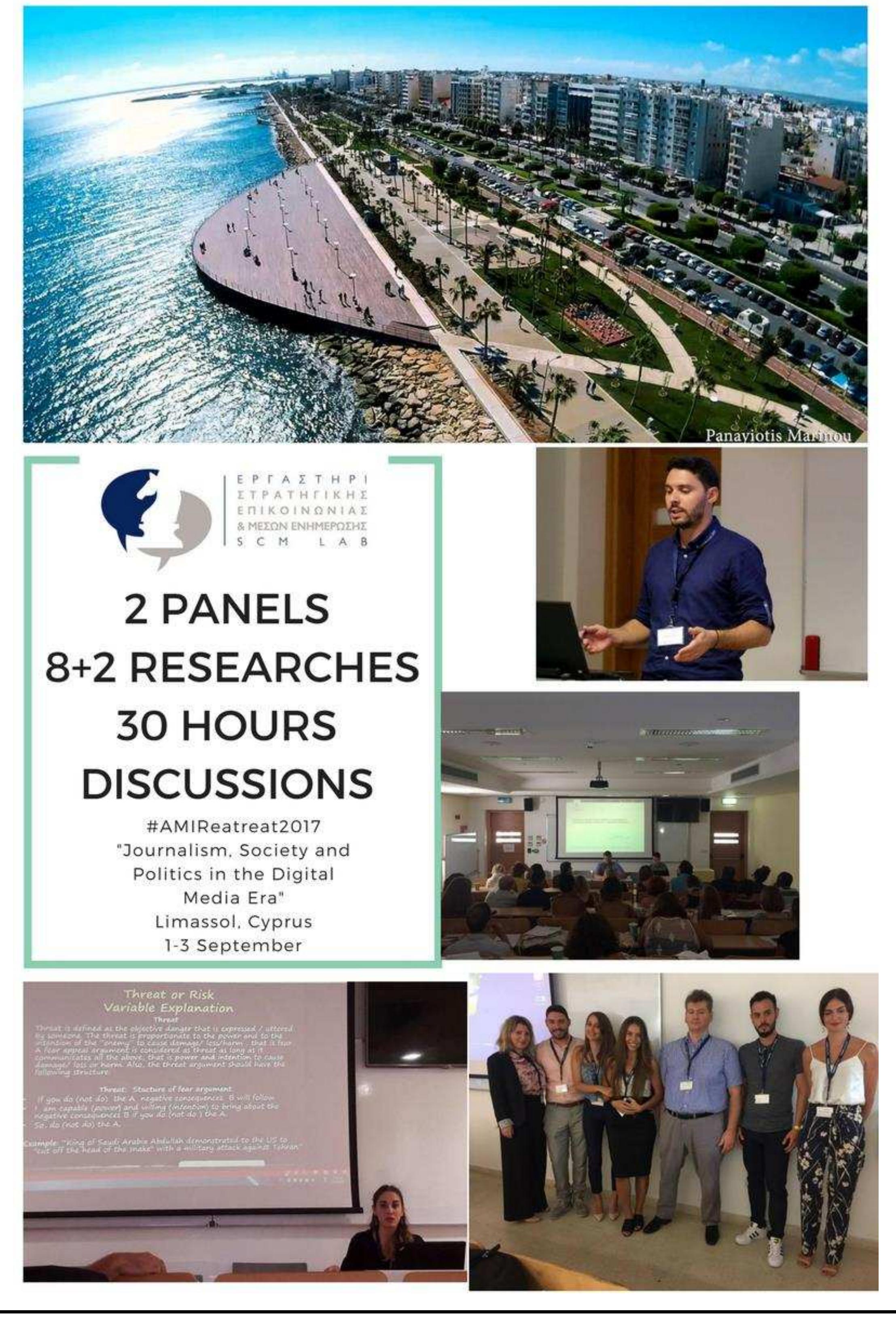The Strategic Communication and News Media Laboratory participated at the international conference: #AMIRetreat2017: Journalism, Society and Politics in the Digital Media Era, organized by the Advanced Media Institute, Open University of Cyprus and Cyprus University of Technology with two panels and eight research presentations. The Laboratory of Intelligence and Cyber-Security, University of Piraeus joined the panels with two more papers.This presentation includes only the abstracts of the panels and the papers of the two Laboratories that were presented at the conference.