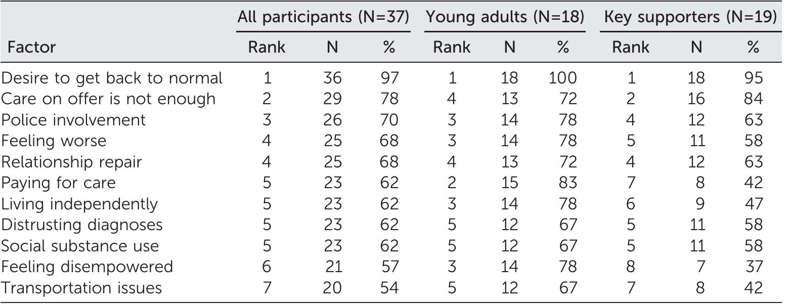 Objective: This study elicited factors that shaped treatment decision making for young adults and... more Objective: This study elicited factors that shaped treatment decision making for young adults and their key supporters after an initial hospitalization for psychosis to generate hypotheses about how to improve service engagement.