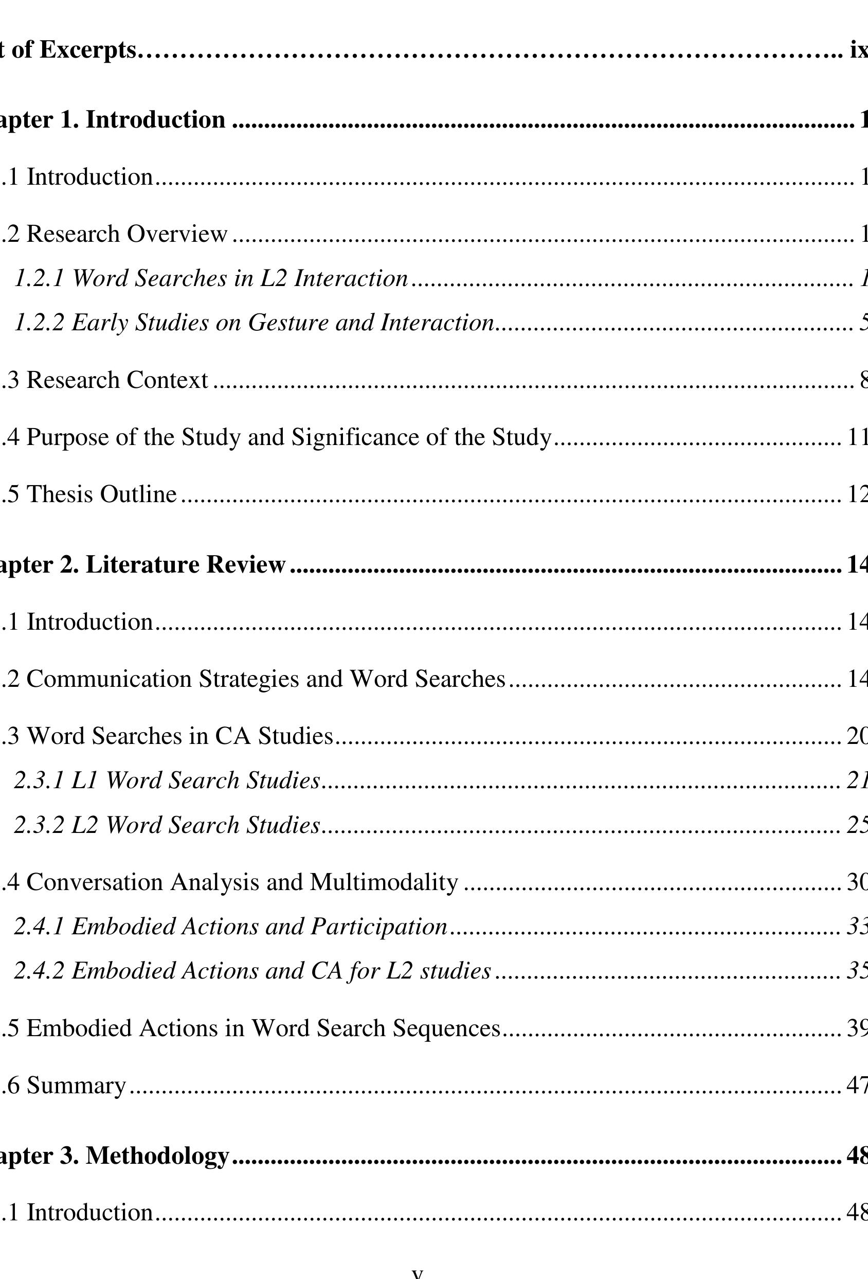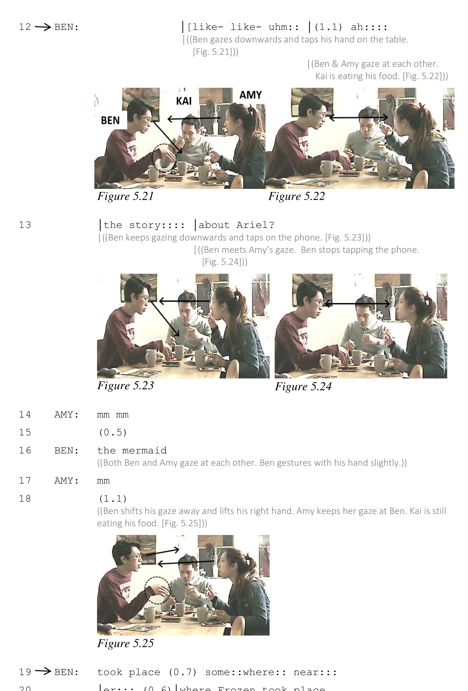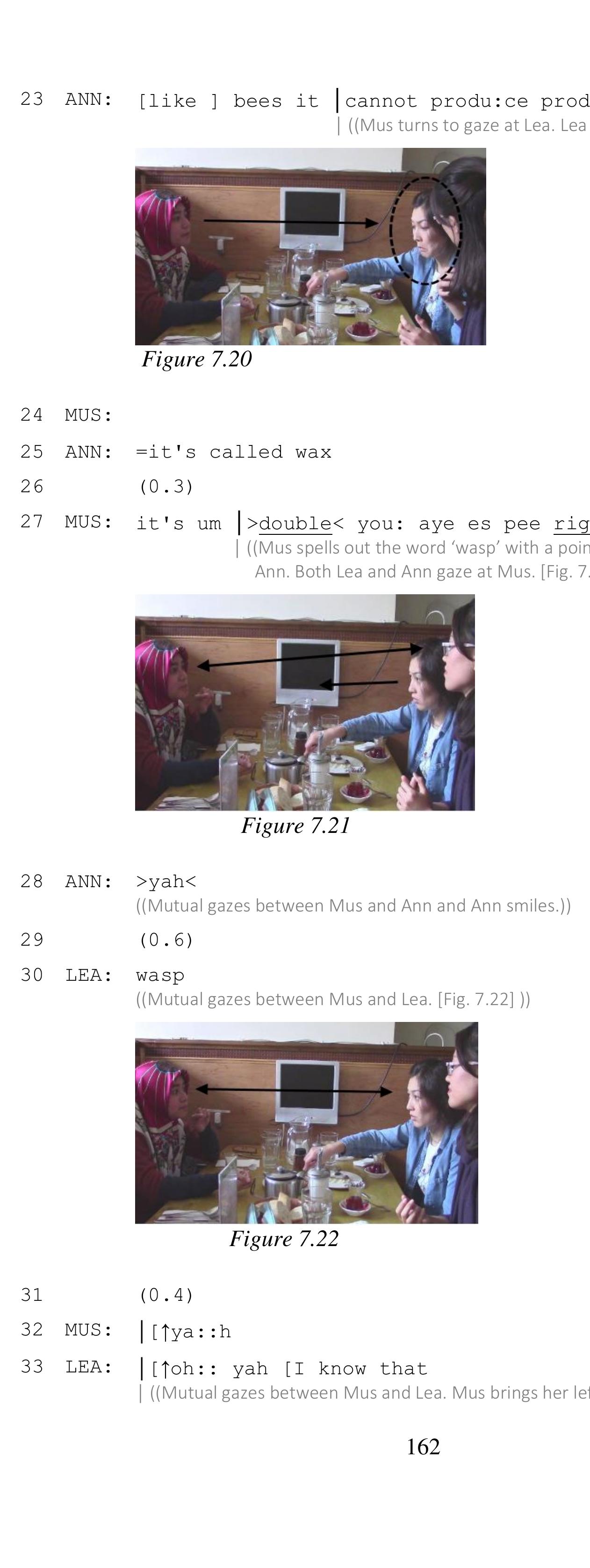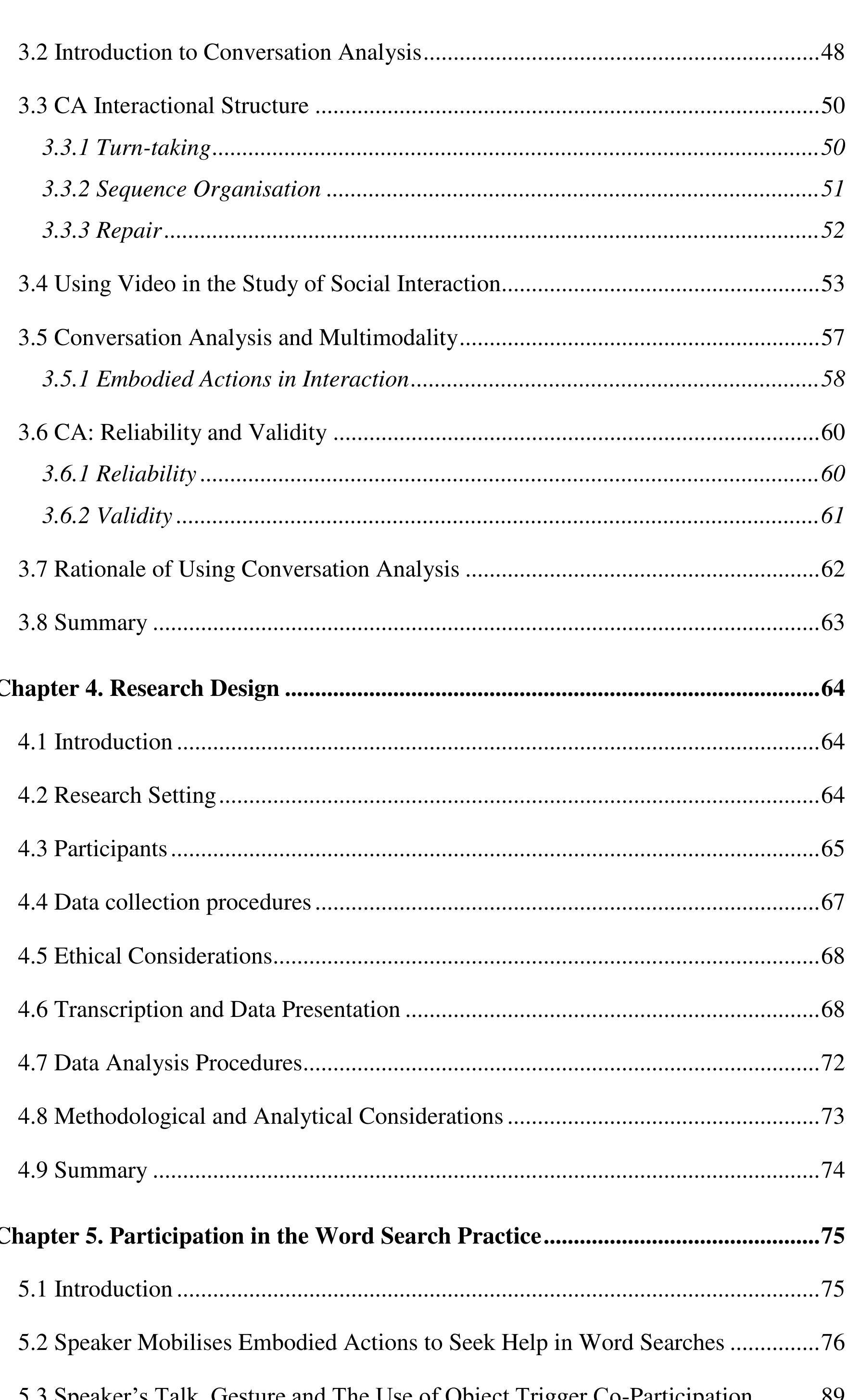 Studies on face-to-face interactions have demonstrated how spoken language involves not only verb... more Studies on face-to-face interactions have demonstrated how spoken language involves not only verbal but also a mutual collaboration with embodied actions. Embodied actions, such as gaze, gestures, body posture and physical movement are part and parcel of the details of ordered social interaction, and they can be significant resources in interaction (Hazel et al., 2014). This study has investigated the embodied actions displayed in word search phenomenon in L2 interaction. Word search is regarded as a type of self-initiation repair in which the progressivity of the speaker's indebted to the Kulliyyah of Languages and Management and the International Islamic University of Malaysia for giving me the opportunity to make a step forward to pursue my PhD and providing me with further support during my research. I wish to thank my close friend Anna Zareena for helping me get through the difficult times, providing the emotional support, and going out with me for coffee breaks. My thanks also go to my friends Somporn,
