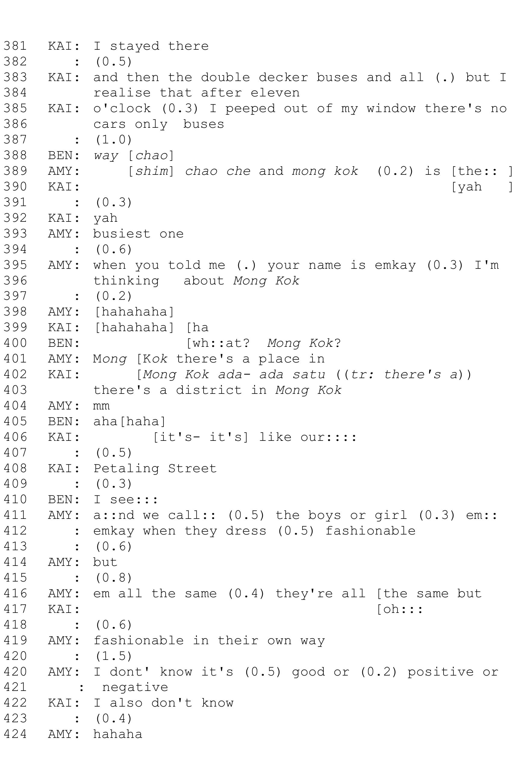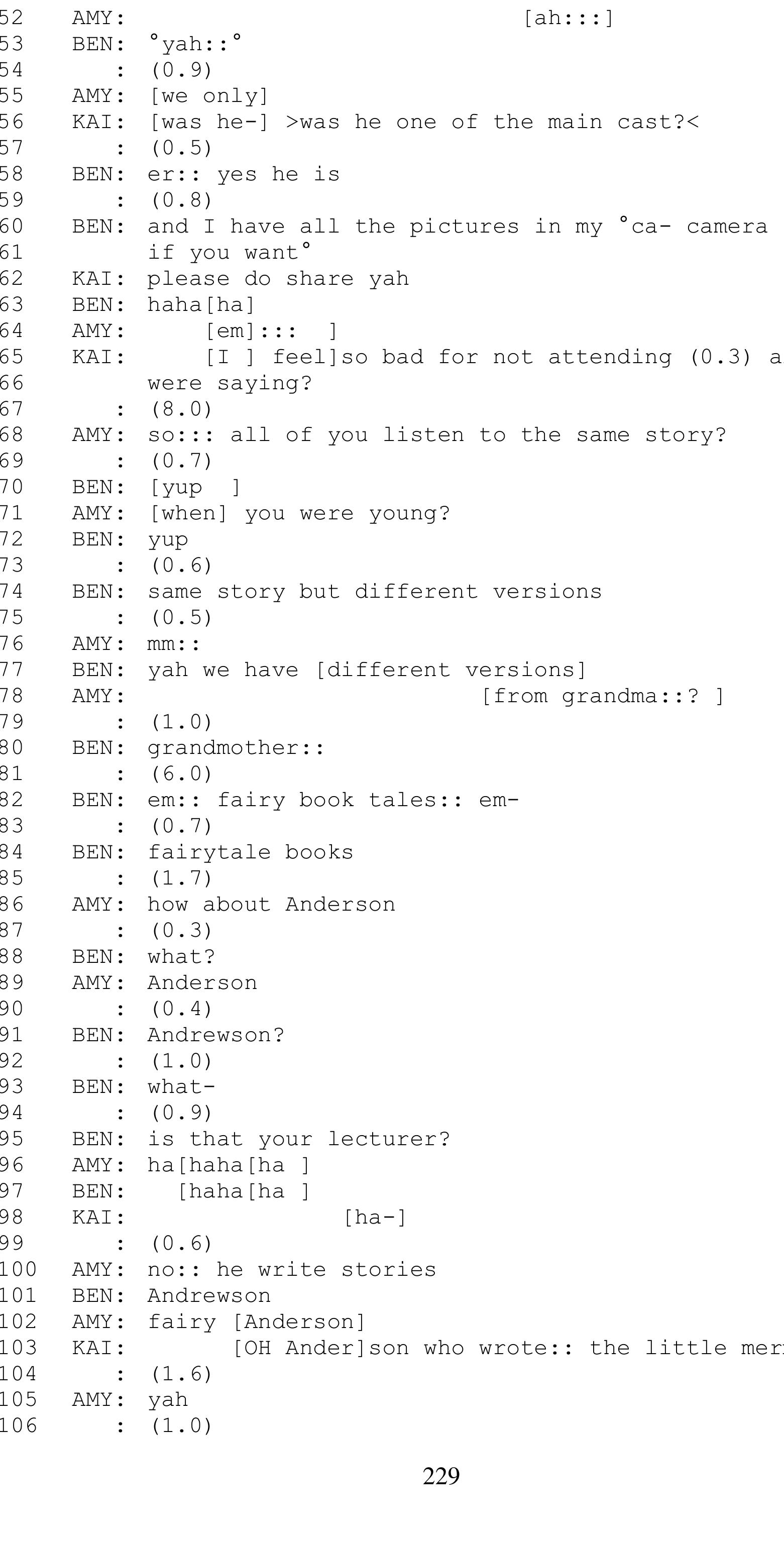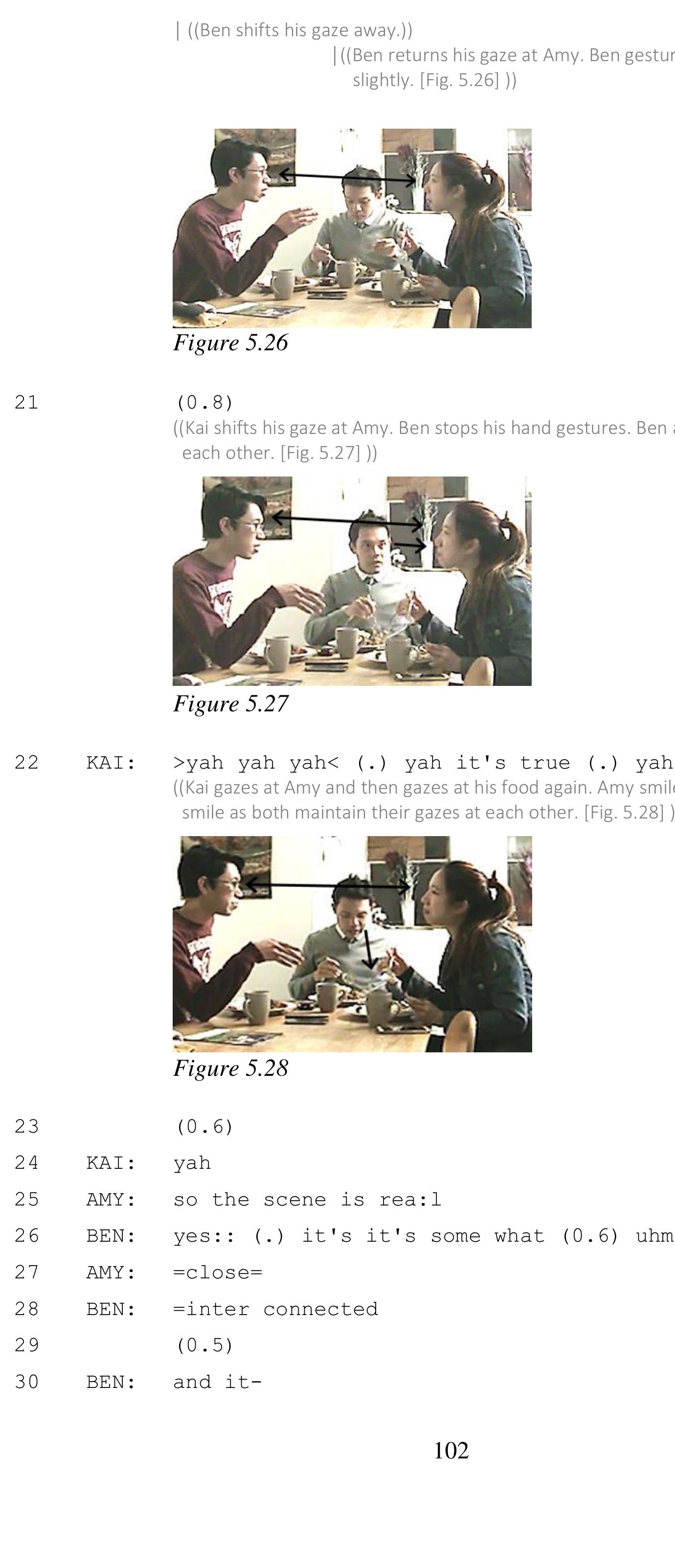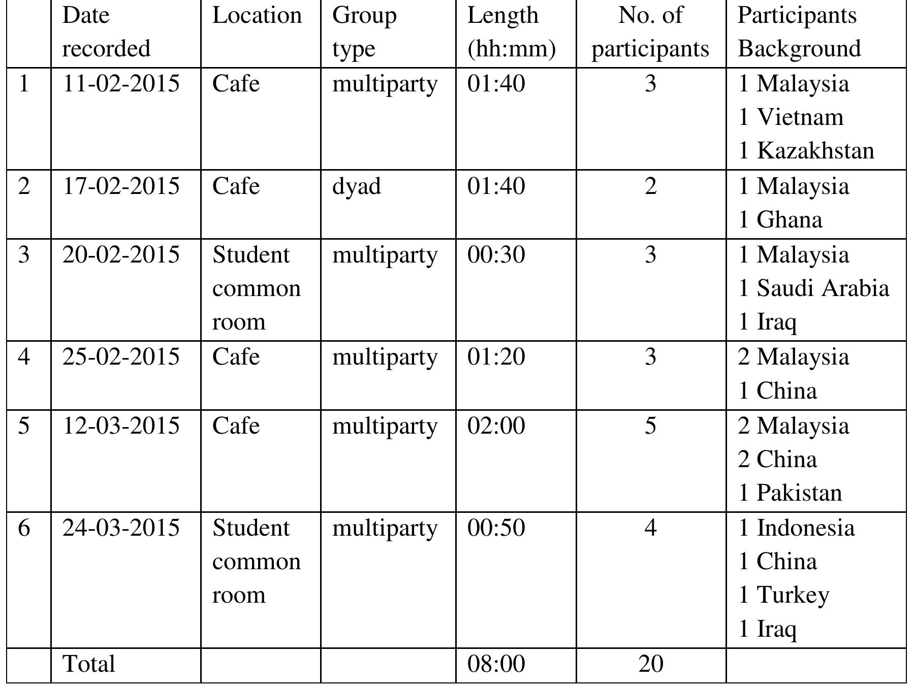 The focus of this study is to investigate what do international students do ‘in the wild’, that i... more The focus of this study is to investigate what do international students do ‘in the wild’, that is, in a mundane, everyday, out-of-classroom second language talk. In face-to-face interactions, spoken language involves not only verbal but also a mutual collaboration with other non-linguistics resources, such as gaze, gestures and bodily behaviour (Goodwin, 1981). This study aims to add to the growing body of second language (L2) research which goes ‘beyond the language classroom’, outside educational settings (Firth and Wagner, 1997; Wagner, 2004) particularly among L2 speakers who do not share the first language. The data for this study consists of casual conversation among international university students having dinner at a cafe which is video-recorded. Using conversation analysis or sometimes referred to as ‘CA-SLA’ (Kasper and Wagner, 2011), this study aims to explore how participants with different language background exploit language and other non-linguistic resources in secon...