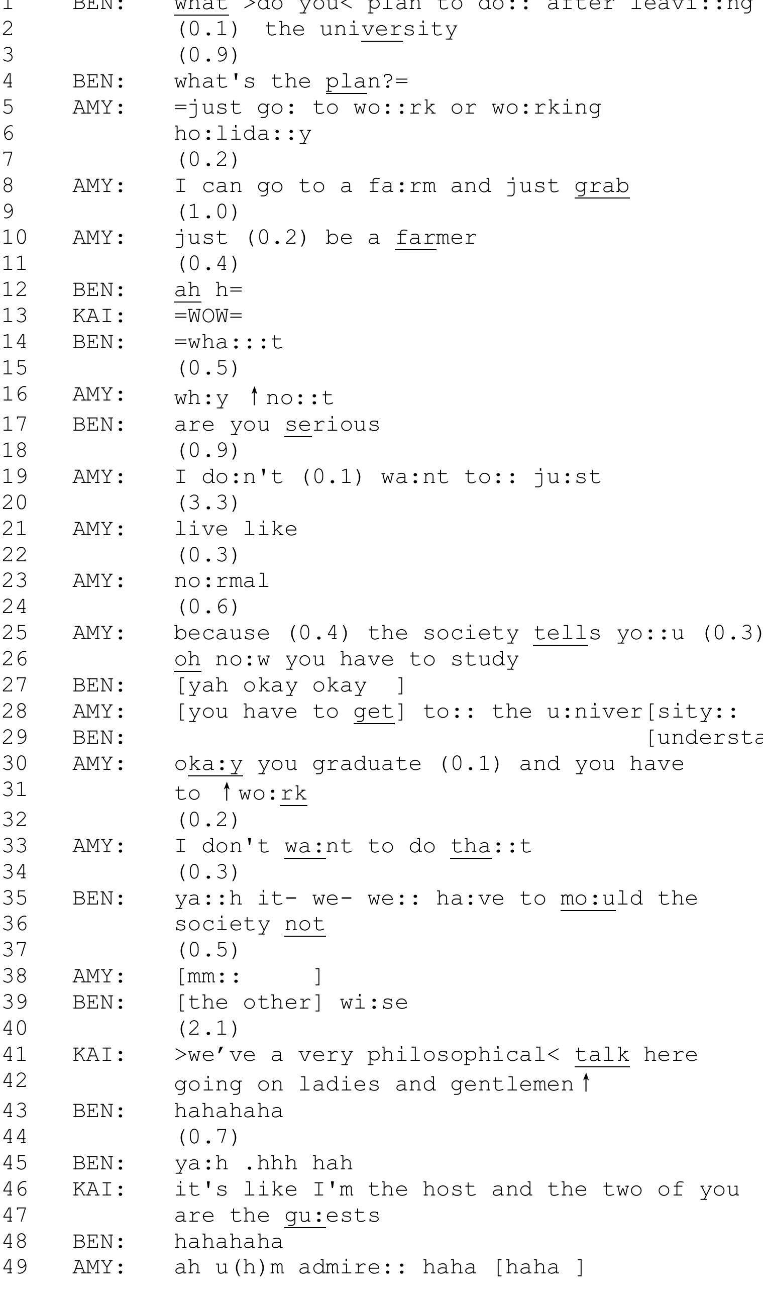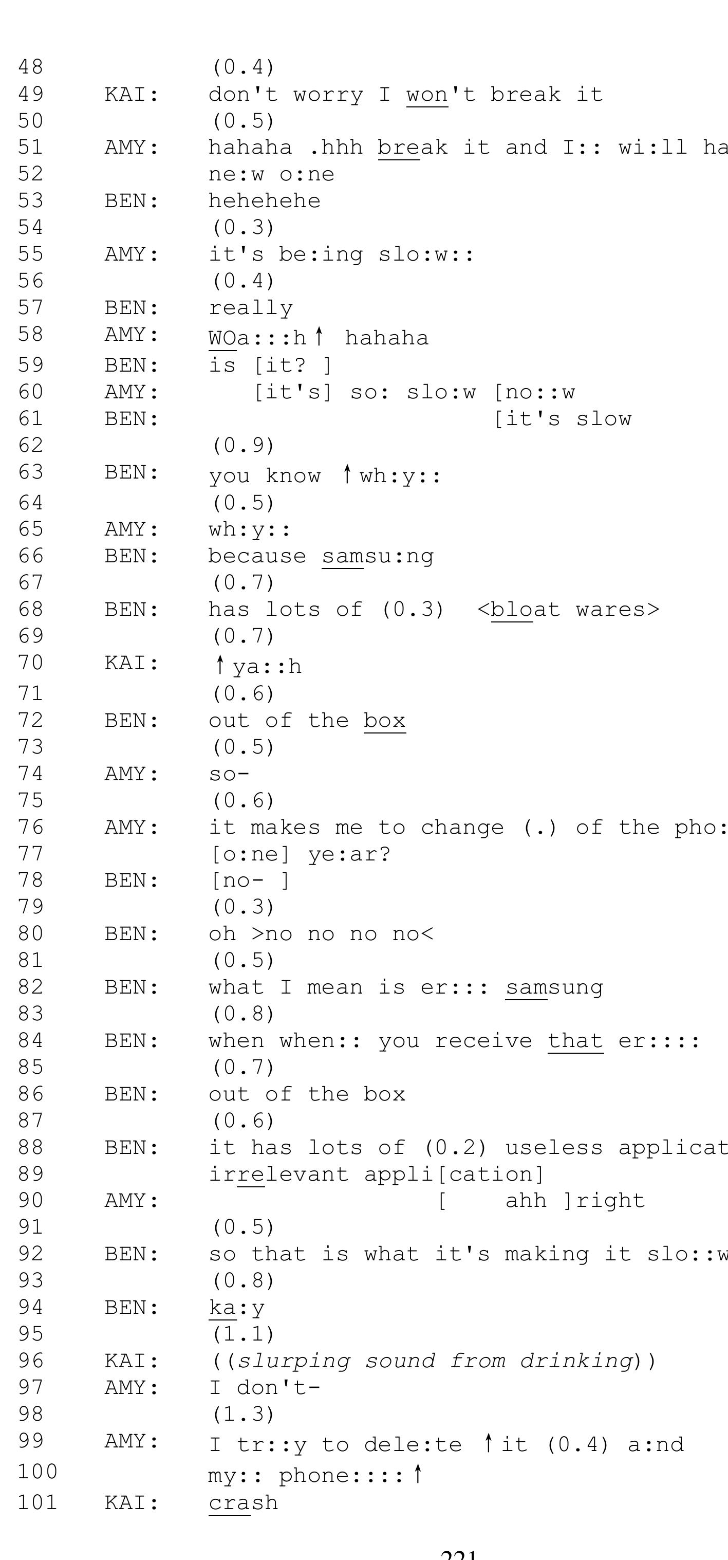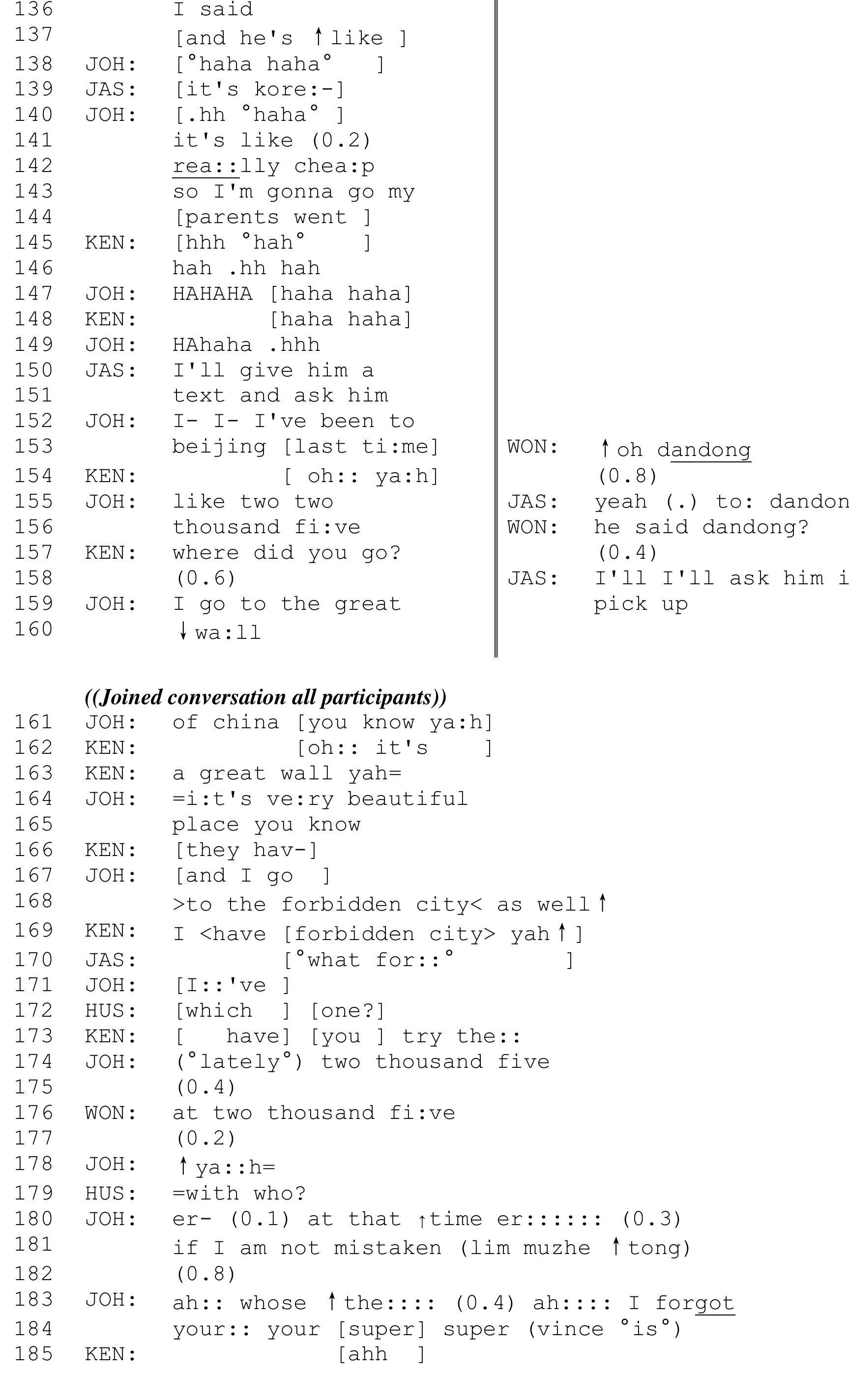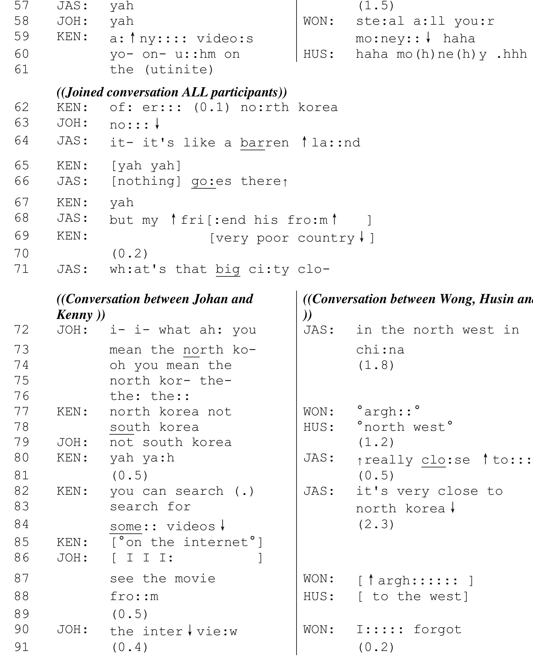The focus of this study is to investigate what do international students do ‘in the wild’, that i... more The focus of this study is to investigate what do international students do ‘in the wild’, that is, in a mundane, everyday, out-of-classroom second language talk. In face-to-face interactions, spoken language involves not only verbal but also a mutual collaboration with other non-linguistics resources, such as gaze, gestures and bodily behaviour (Goodwin, 1981). This study aims to add to the growing body of second language (L2) research which goes ‘beyond the language classroom’, outside educational settings (Firth and Wagner, 1997; Wagner, 2004) particularly among L2 speakers who do not share the first language. The data for this study consists of casual conversation among international university students having dinner at a cafe which is video-recorded. Using conversation analysis or sometimes referred to as ‘CA-SLA’ (Kasper and Wagner, 2011), this study aims to explore how participants with different language background exploit language and other non-linguistic resources in secon...