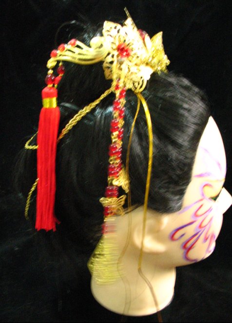 Elevate your traditional performance with this exquisite gold filigree crown, featuring a striking red centerpiece and intricate detailing inspired by ancient Chinese royalty. Designed specifically for Peking Opera and classical dance, this headpiece includes long side hairpins adorned with cascading red bead chains that sway gracefully with movement. Crafted for durability and visual impact, it serves as a stunning accessory for Hanfu enthusiasts, stage actors, and cultural cosplayers looking for authentic period styling. The piece captures the elegance of traditional Chinese aesthetics, making it an essential addition to any theatrical wardrobe or cultural collection.
