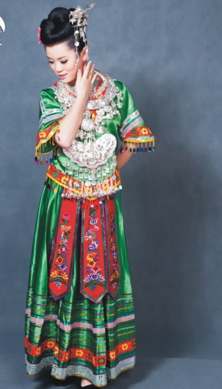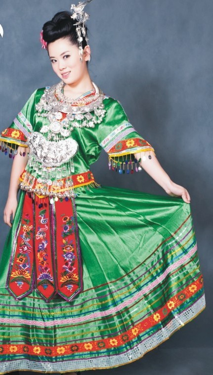 Immerse yourself in the rich heritage of China's Miao minority with this exquisite green folk dance costume, crafted from lustrous satin and featuring vibrant floral embroidery. The outfit is distinguished by its signature heavy silver jewelry, including intricate neck rings and a dangling chest plate that symbolize wealth and beauty in traditional culture. Designed for stage performances and cultural festivals, this complete ensemble combines a striped long skirt with a decorative red apron for a stunning visual impact.