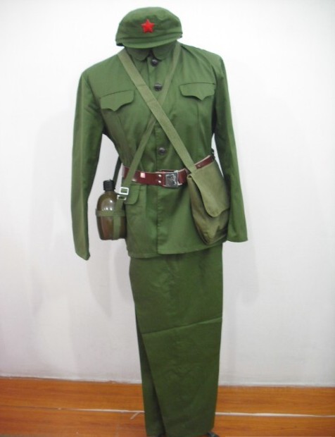 This authentic reproduction of the iconic Chinese PLA Type 65 military uniform captures the distinctive historical style of the 1960s and 70s. Crafted from durable olive-green fabric, the complete set features a classic tunic jacket with four pockets, matching trousers, and a peaked cap adorned with a red star. Perfect for historical reenactments, theater productions, or cultural performances, this costume includes the signature red collar tabs that define the era's aesthetic. Embrace a unique piece of history with this high-quality traditional outfit designed for both men and women.