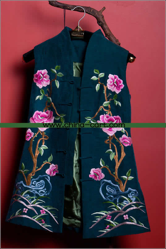 Crafted from luxurious black silk, this sleeveless Tang suit vest features exquisite floral embroidery with vibrant peony blossoms that symbolize prosperity and honor in Chinese culture. The garment showcases traditional frog buttons and a classic collar design, offering a perfect blend of ancient elegance and modern comfort. Ideal for tea ceremonies, cultural festivals, or adding a unique ethnic touch to your daily wardrobe, this top is a timeless piece of oriental fashion.