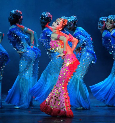 This stunning magenta dance costume features intricate gold and green coin embellishments that shimmer brilliantly under stage lights, designed to captivate any audience. Perfect for professional stage performances and cultural showcases, the ensemble includes a supportive halter top, a flowing skirt, and matching accessories like a jeweled headpiece and wrist cuffs. The exotic design draws inspiration from traditional Silk Road aesthetics, blending belly dance elements with folk dance flair for a mesmerizing visual impact. Crafted with high-quality, flexible materials, this outfit ensures maximum comfort and freedom of movement for dancers during energetic routines.