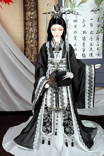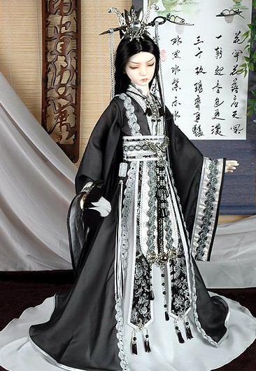 This stunning black and silver Hanfu ensemble captures the elegance of ancient Chinese nobility with intricate embroidery and flowing wide sleeves. The outfit features delicate lace trim, shimmering tassels, and a majestic headdress adorned with feathers and jewels, perfect for high-end doll displays. Designed for traditional culture enthusiasts, this costume embodies the sophisticated aesthetic of the Hanfu movement, bringing historical grandeur to your collection. Ideal for BJDs or collector dolls, this set transforms your figure into a regal character from a classic wuxia drama.