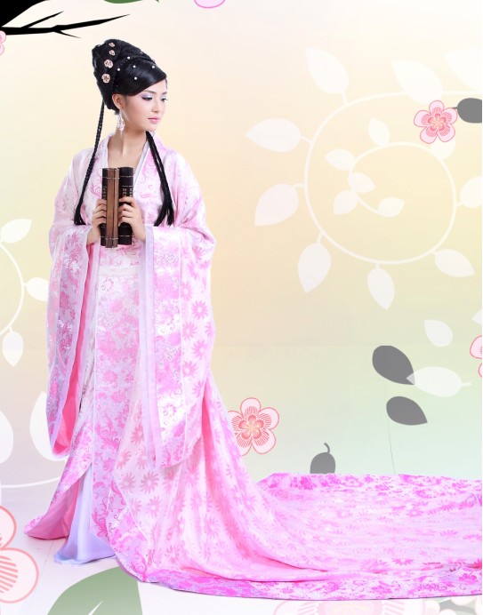 Embrace the elegance of ancient China with this stunning pink floral Hanfu, featuring flowing wide sleeves and a dramatic long train. Crafted from lightweight fabric with intricate floral patterns, this traditional costume is perfect for cultural festivals, stage performances, and artistic photography. Whether you are attending a Hanfu gathering or cosplaying a historical character, this dress captures the grace and sophistication of classical Chinese aesthetics.